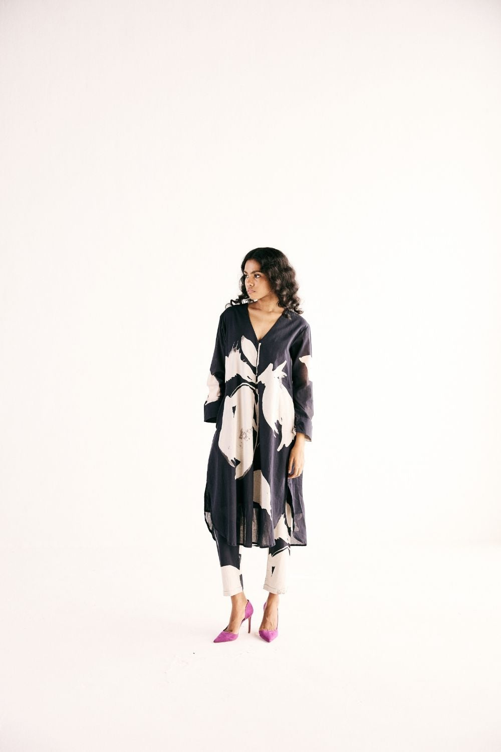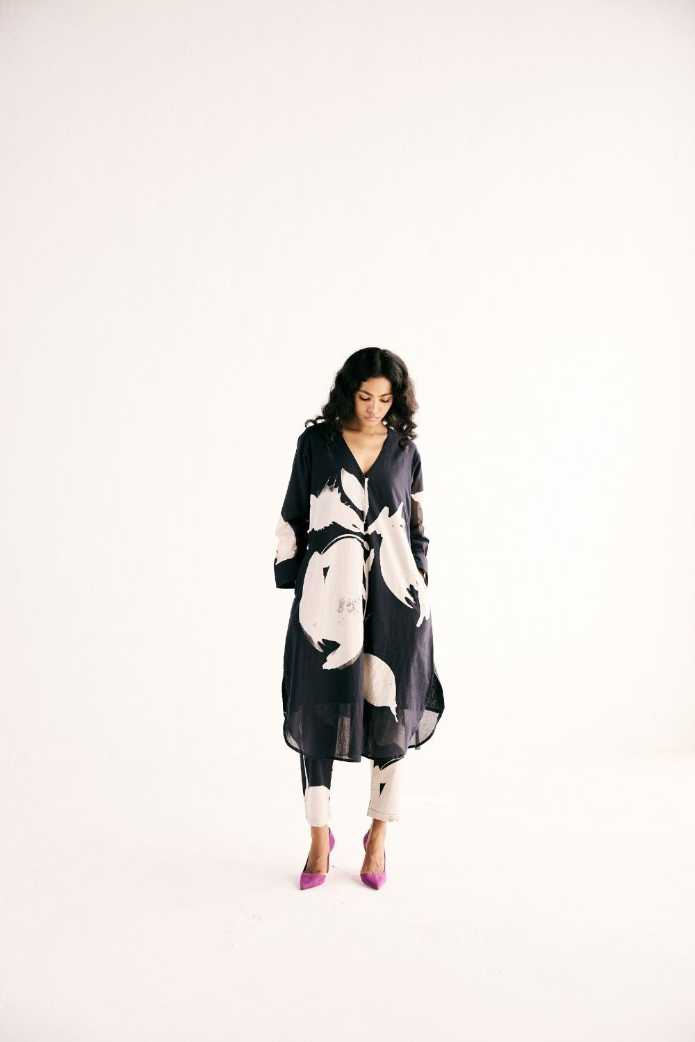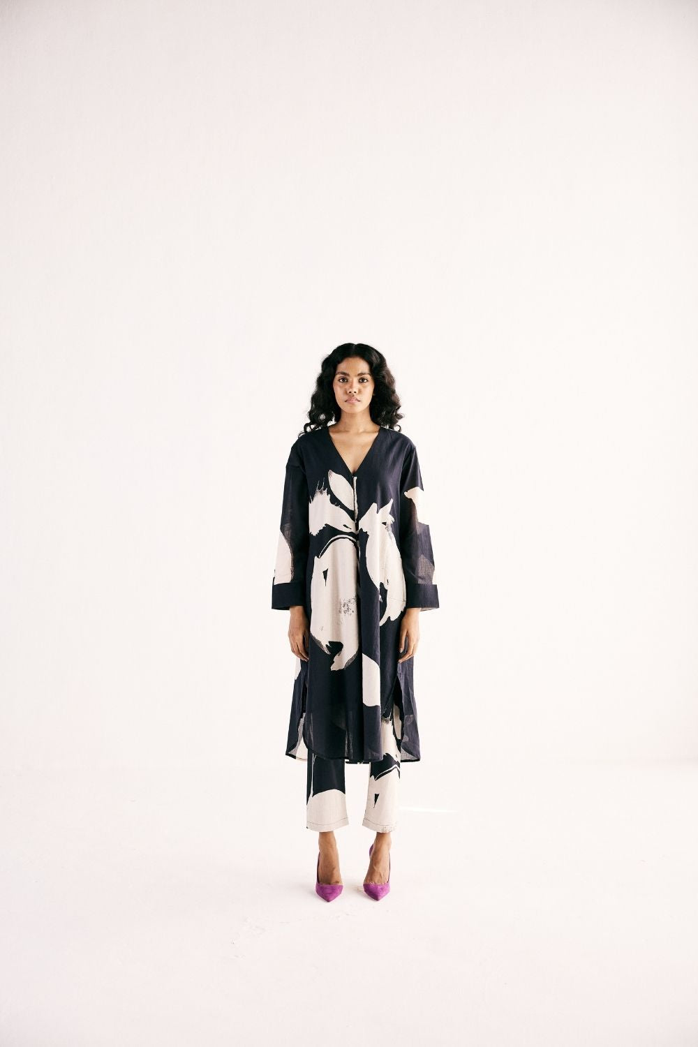 A monochromatic floral printed kurta set with full sleeves and a v neckline crafted in soft cotton mul paired with floral printed mul pencil pants fully elasticated.