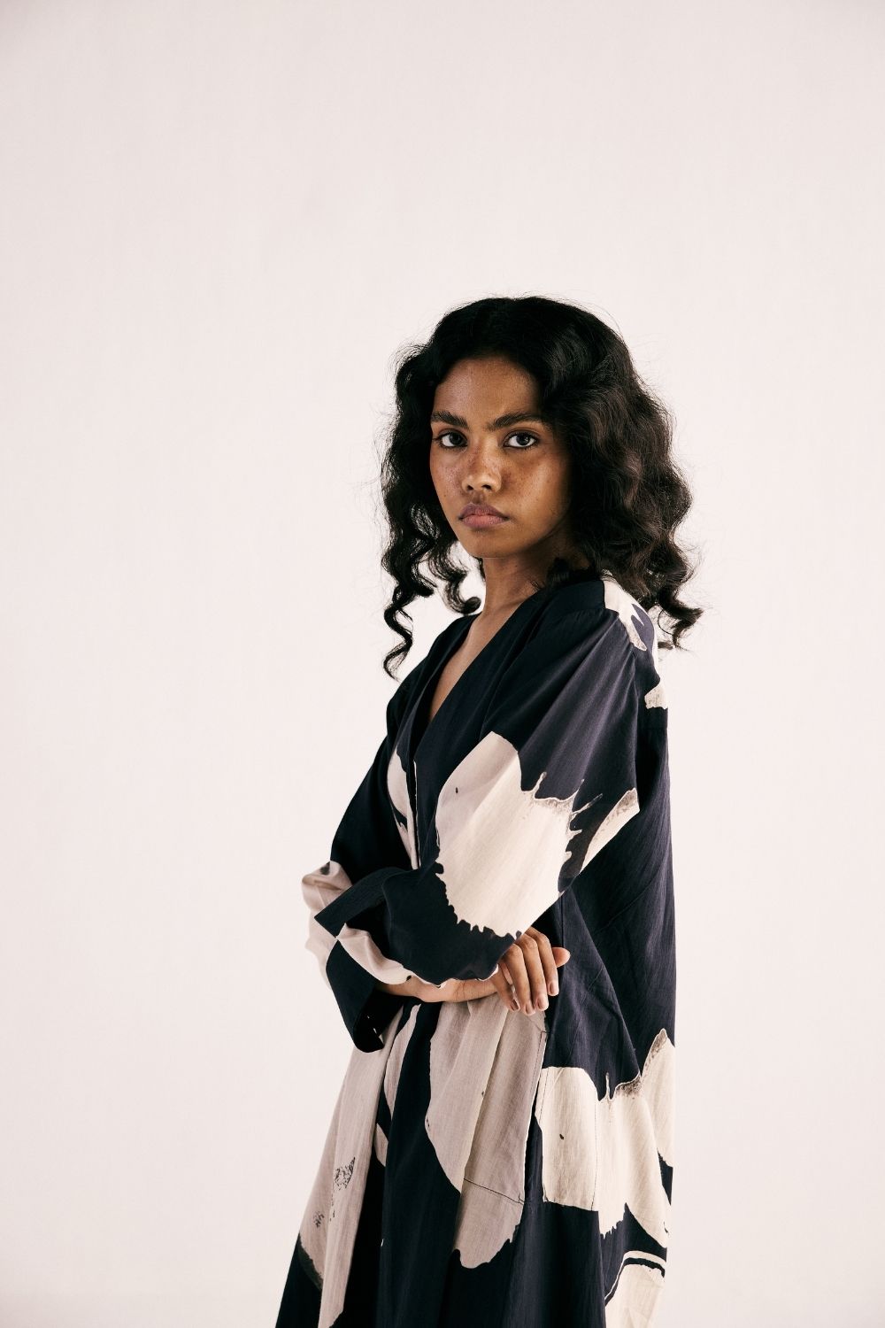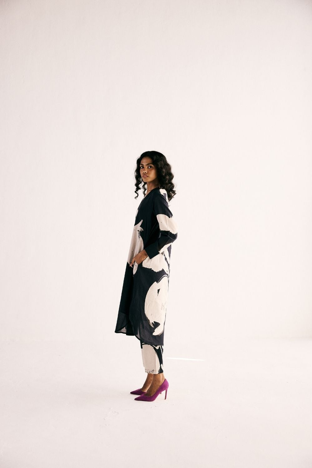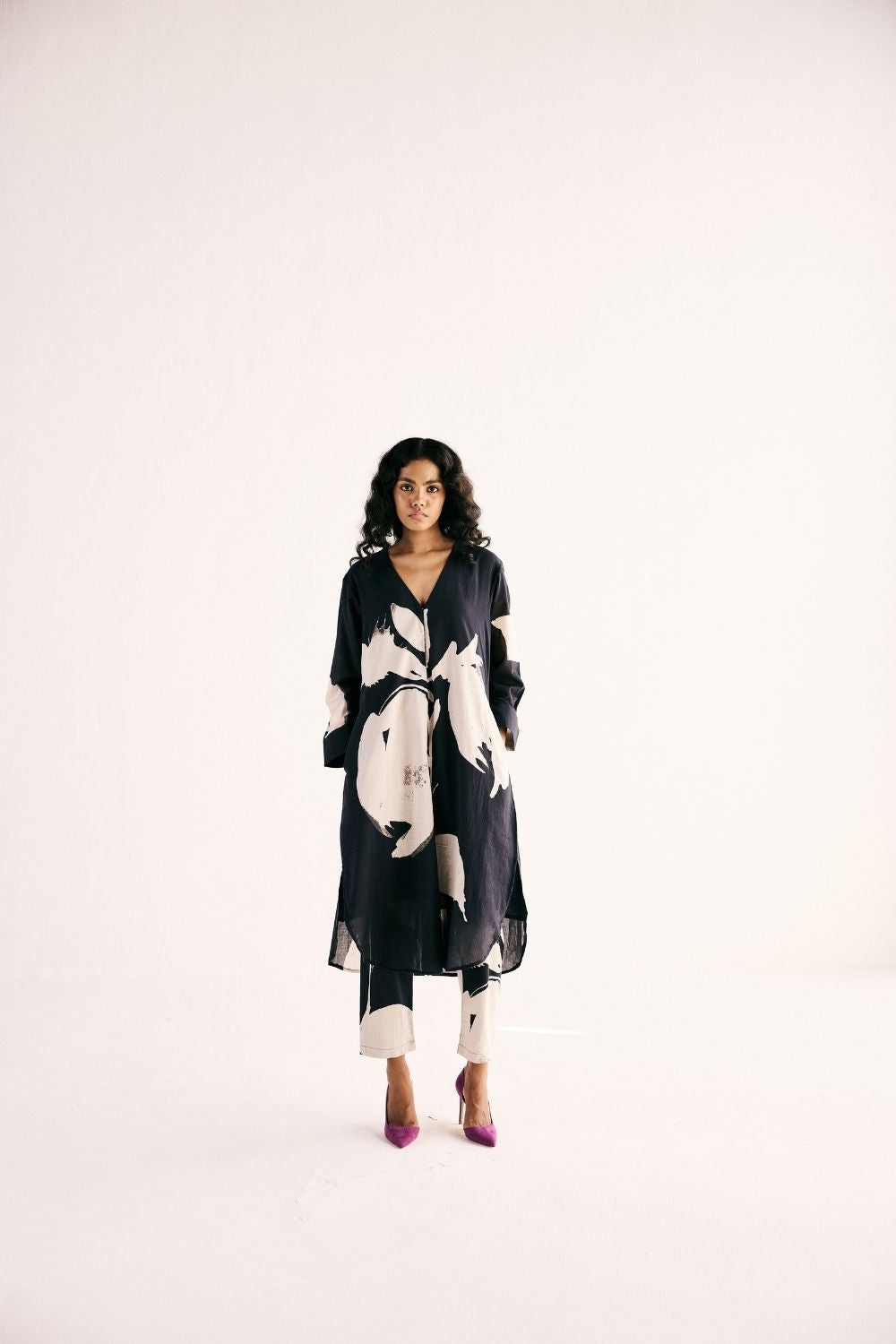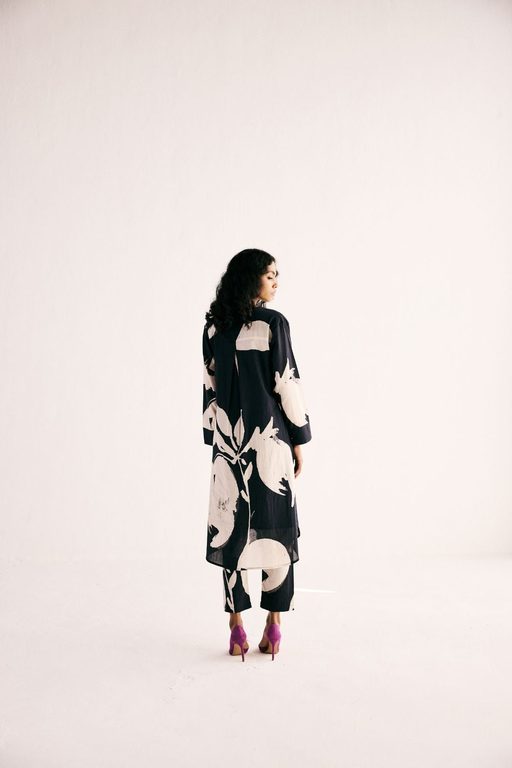 A monochromatic floral printed kurta set with full sleeves and a v neckline crafted in soft cotton mul paired with floral printed mul pencil pants fully elasticated.