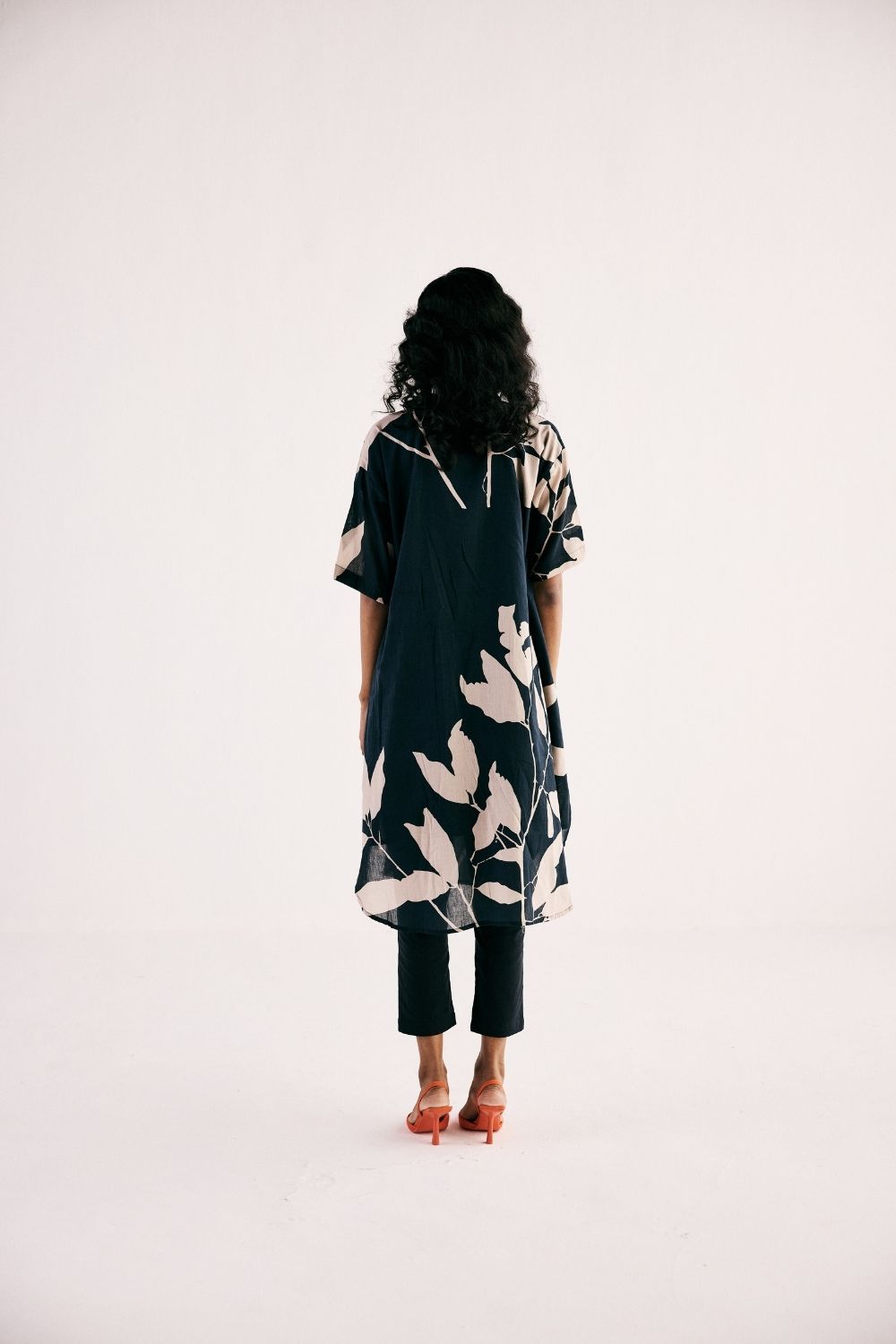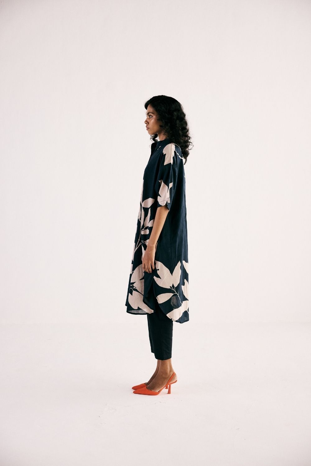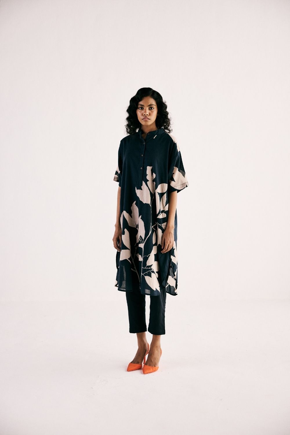 A monochromatic floral printed kurta set with front button opening crafted in soft cotton mul paired with floral printed mul pencil pants fully elasticated.