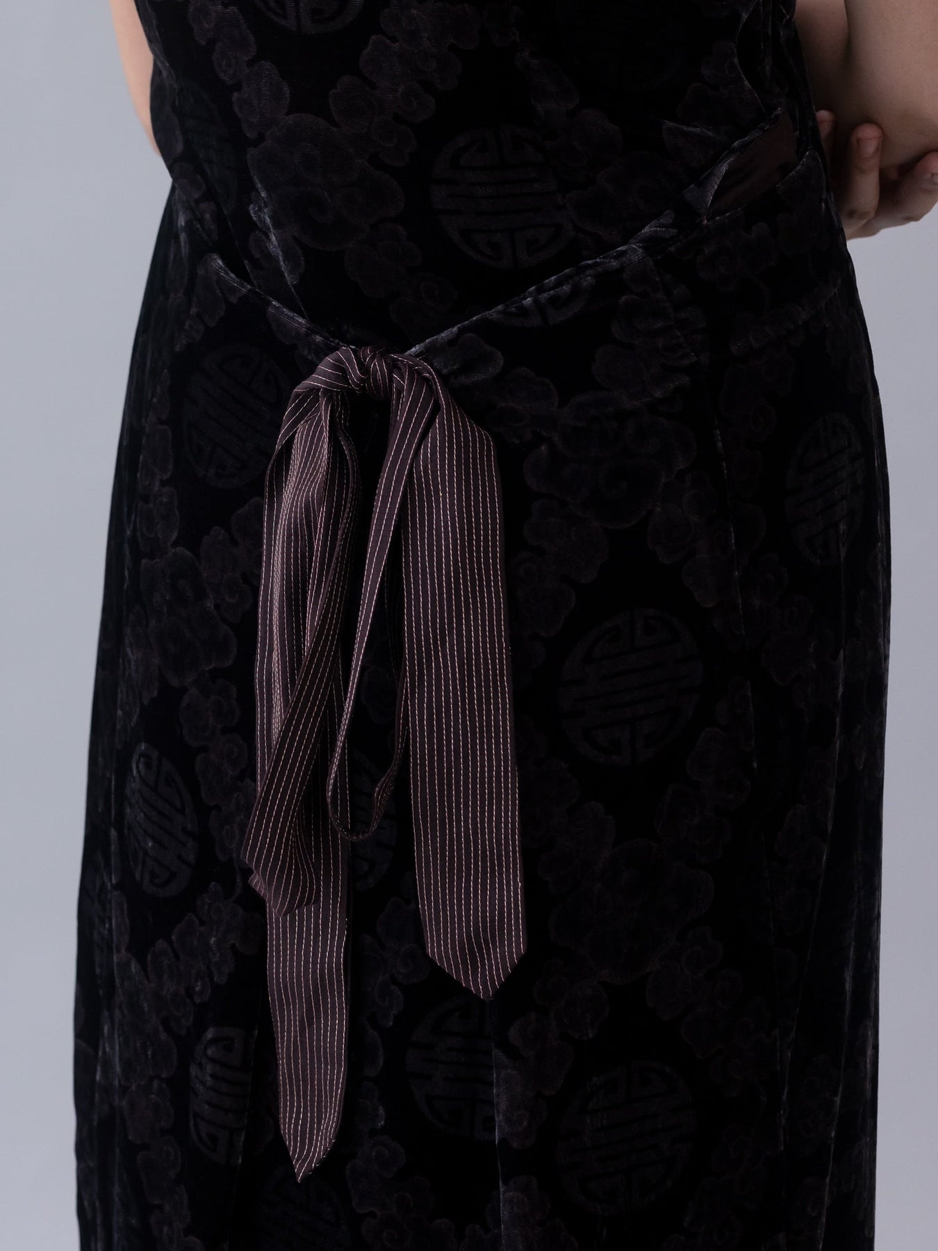Hanbok dress in black-grey silk velvet, featuring an all-over cloud screen print. Overlapping panels with looped buttons and a cocoa voile hem facing add depth, warmth, and quiet sophistication. Country of origin: India