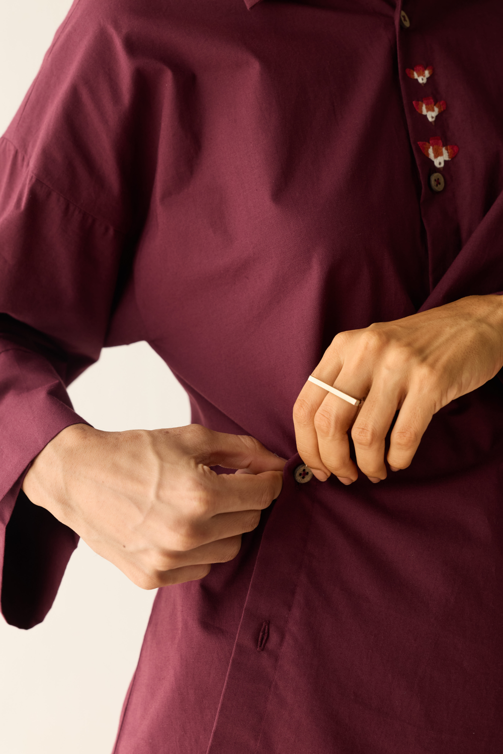 Regular fit, long sleeve, collared, wrap shirt that buttons at the front, crafted in azo-free dyed organic cotton poplin fabric, hand embroidered with shore-inspired and quote motifs.
