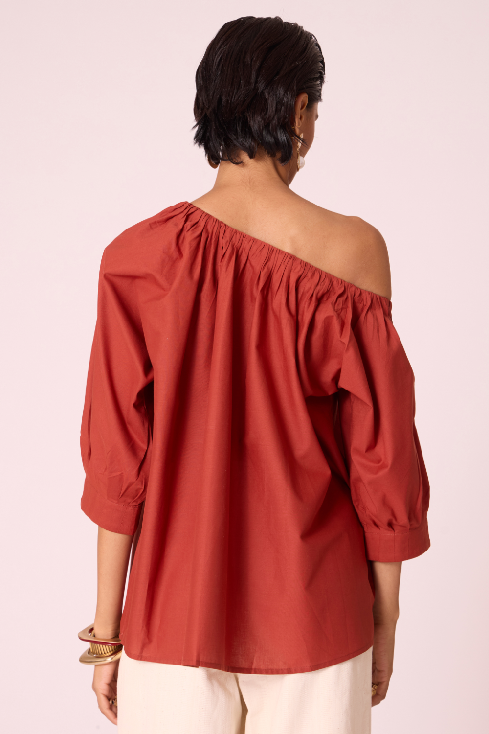 A light, gathered off-shoulder silhouette that frames the neckline with quiet ease. The Dina top brings softness and structure together, its pleated cuffs lending measured volume to an otherwise fluid form.