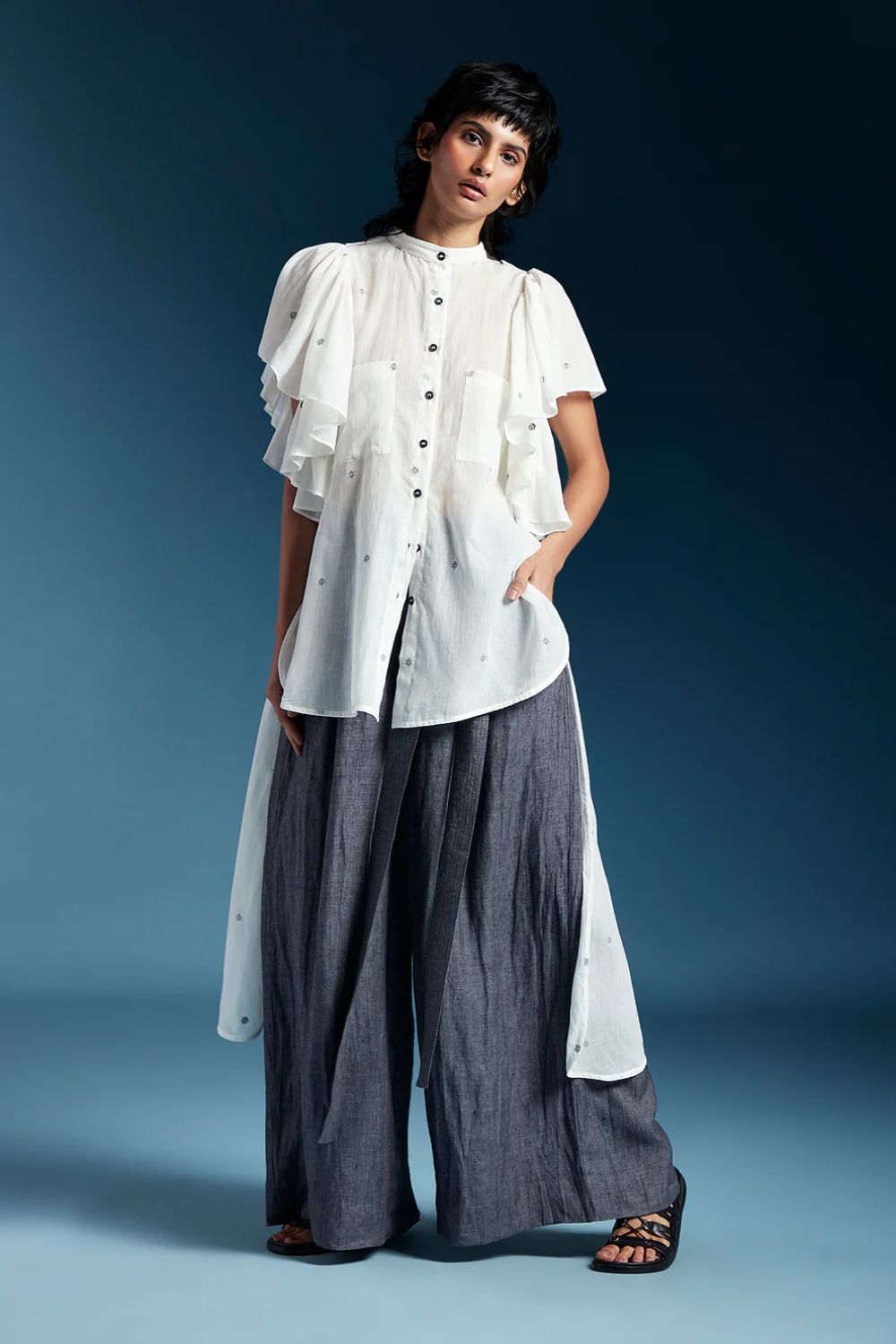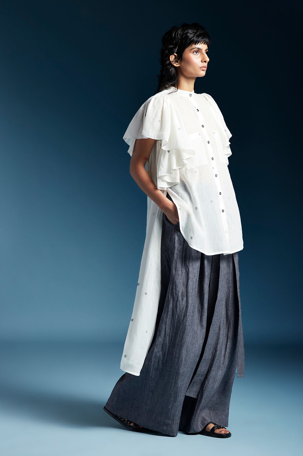 HIGH LOW U SHAPE SHIRT WITH FRILLS AT ARMHOLE, BAND COLLAR, BACK FLAP AND BACK BUTTONS