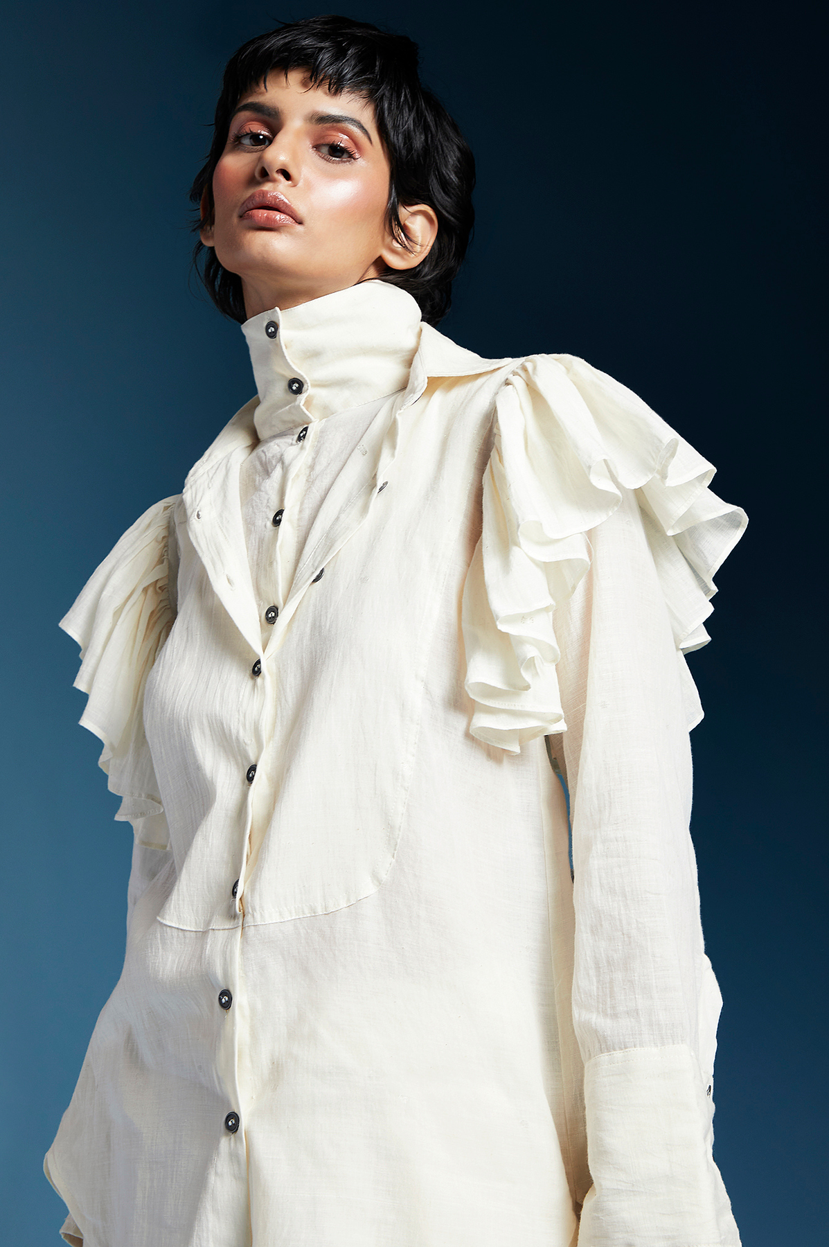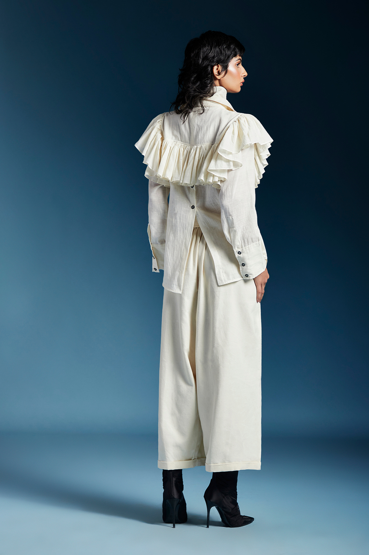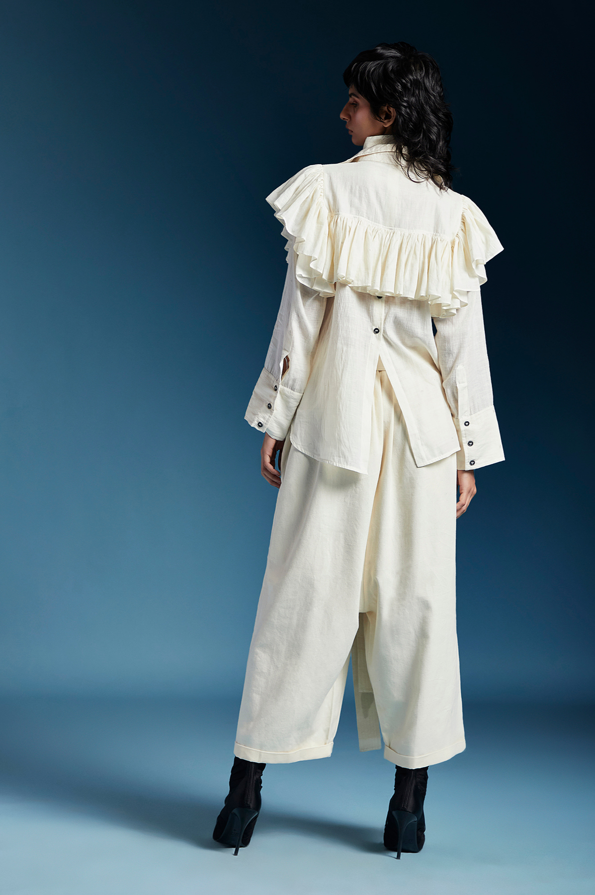 SHIRT WITH LONG CURVED DOUBLE YOKE, FRILLS, STRAIGHT SLEEVES & BACK BUTTONS