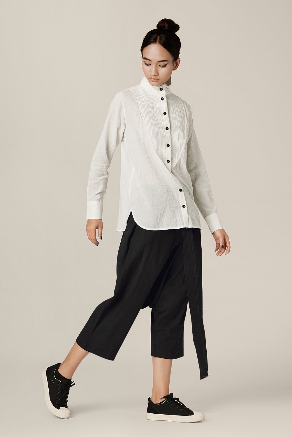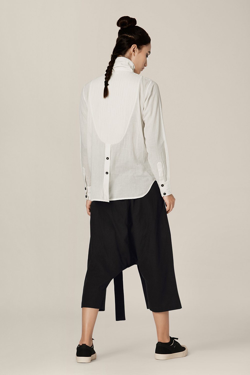 Chola’s universe begins with thoughtful materials. Recycled cottons, post-consumer fabrics, and free-cutting techniques come together in a kind of mindful choreography—one that honours form without creating waste, and prioritises movement over rigidity. This is clothing that feels lived-in yet architectural; pared-back yet quietly avant-garde.