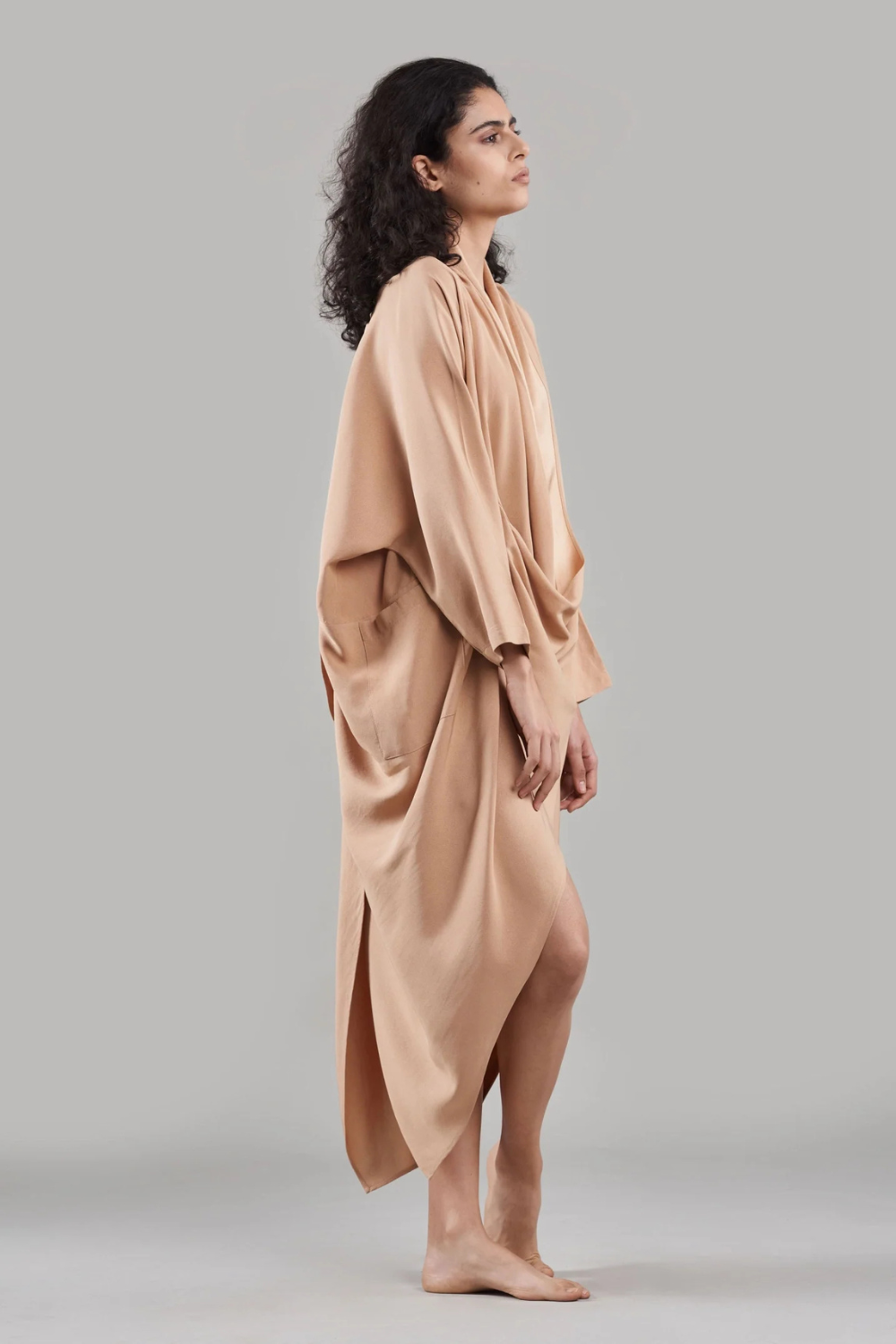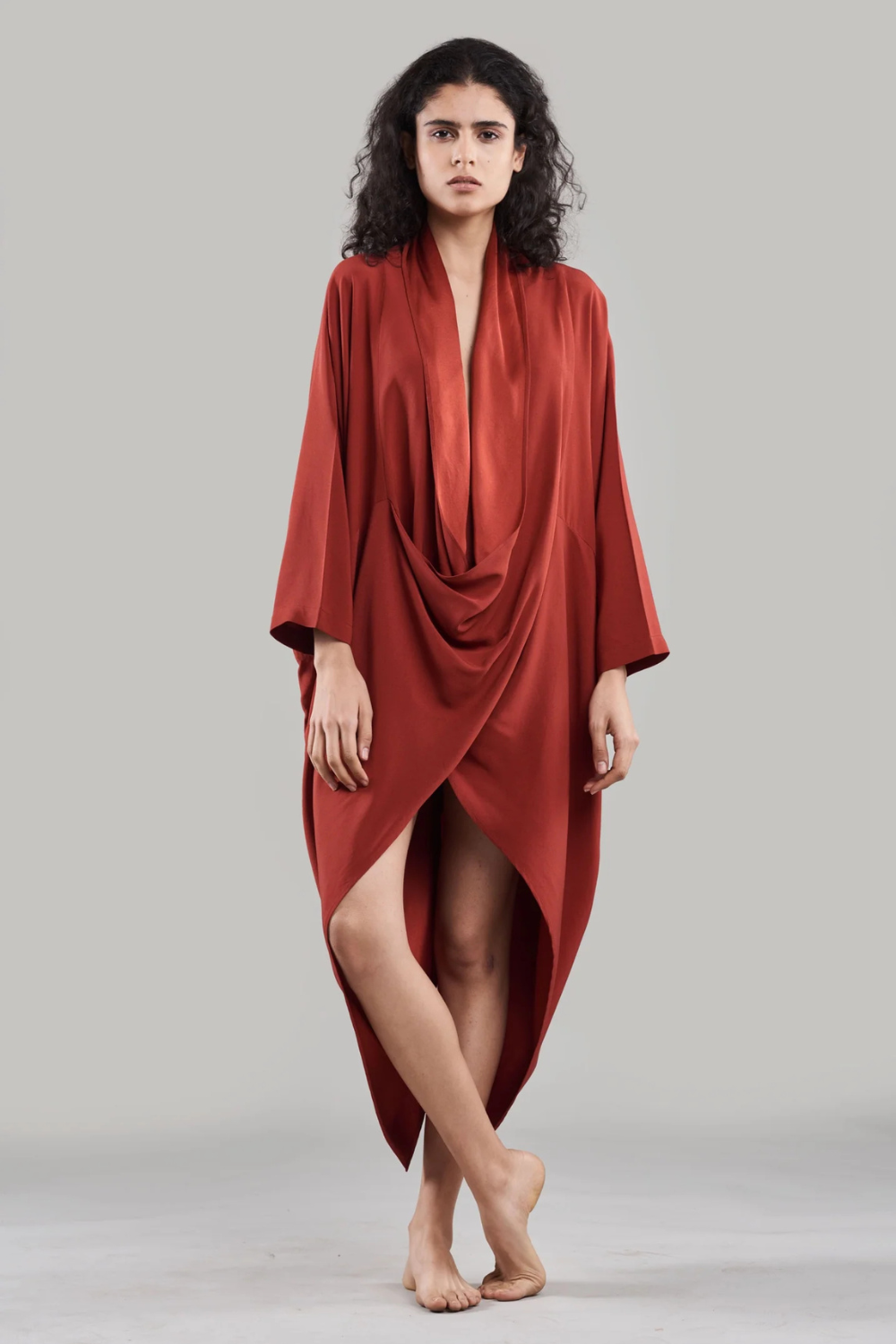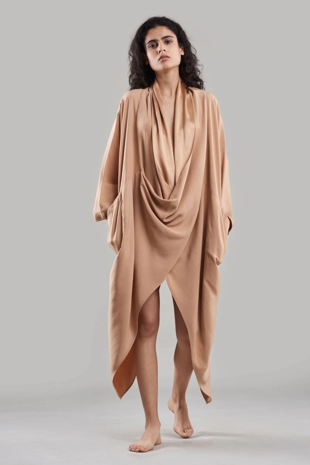 Experience the perfect blend of ethereal elegance and modern edge with our cape-style dress. Crafted from lustrous silk, the flowing, draped neckline cascades gracefully over the abdomen, creating an effortlessly sensual silhouette.