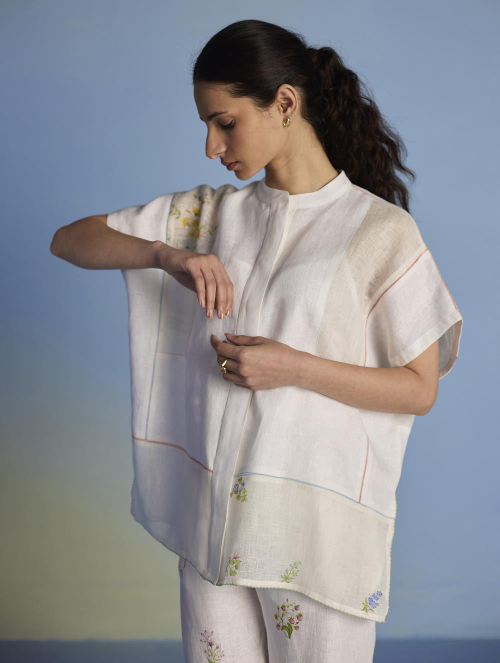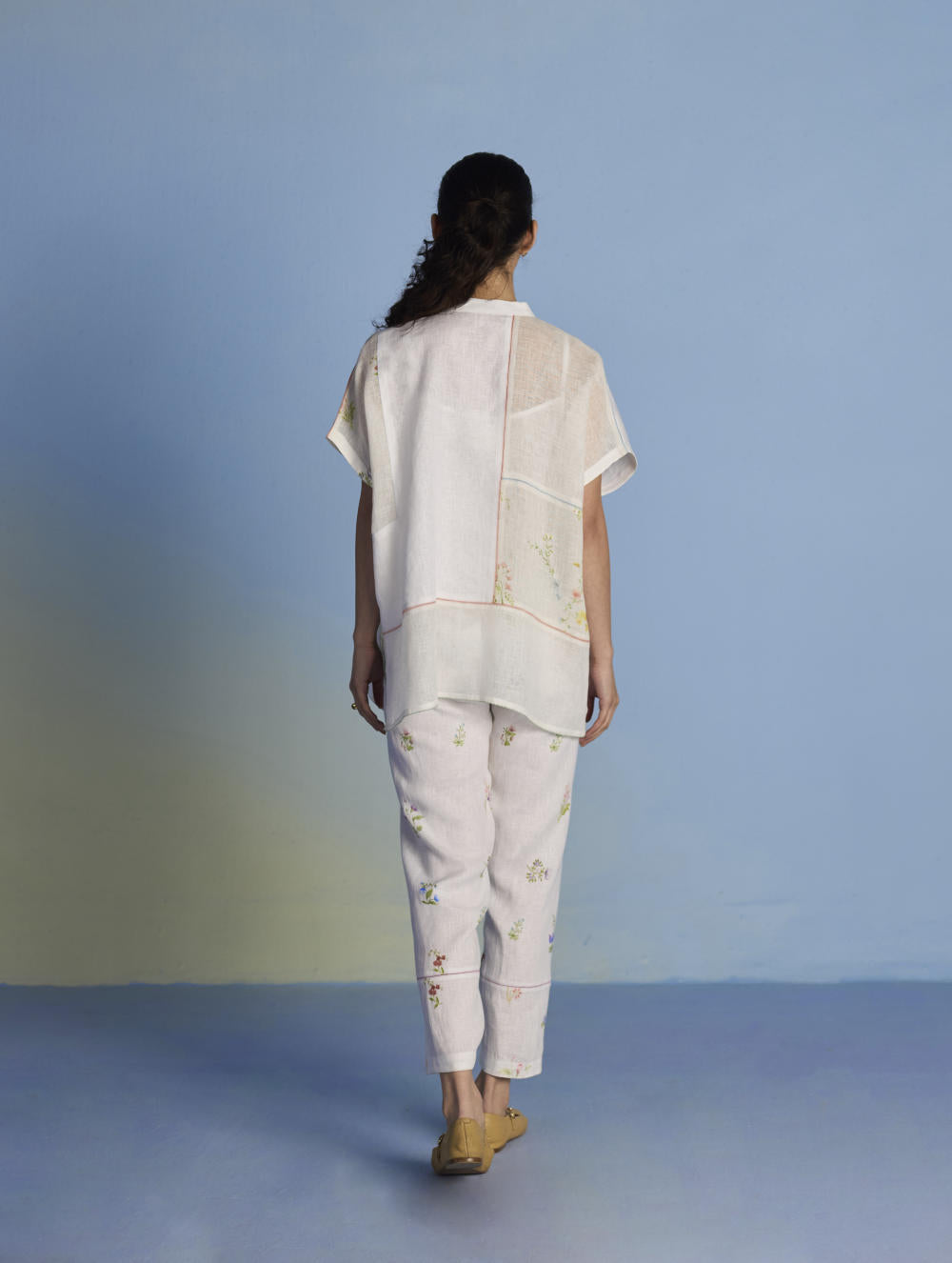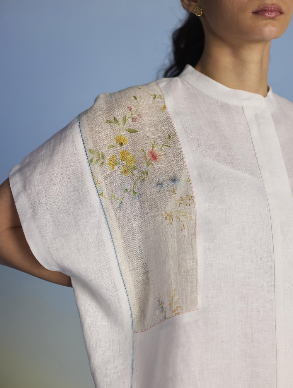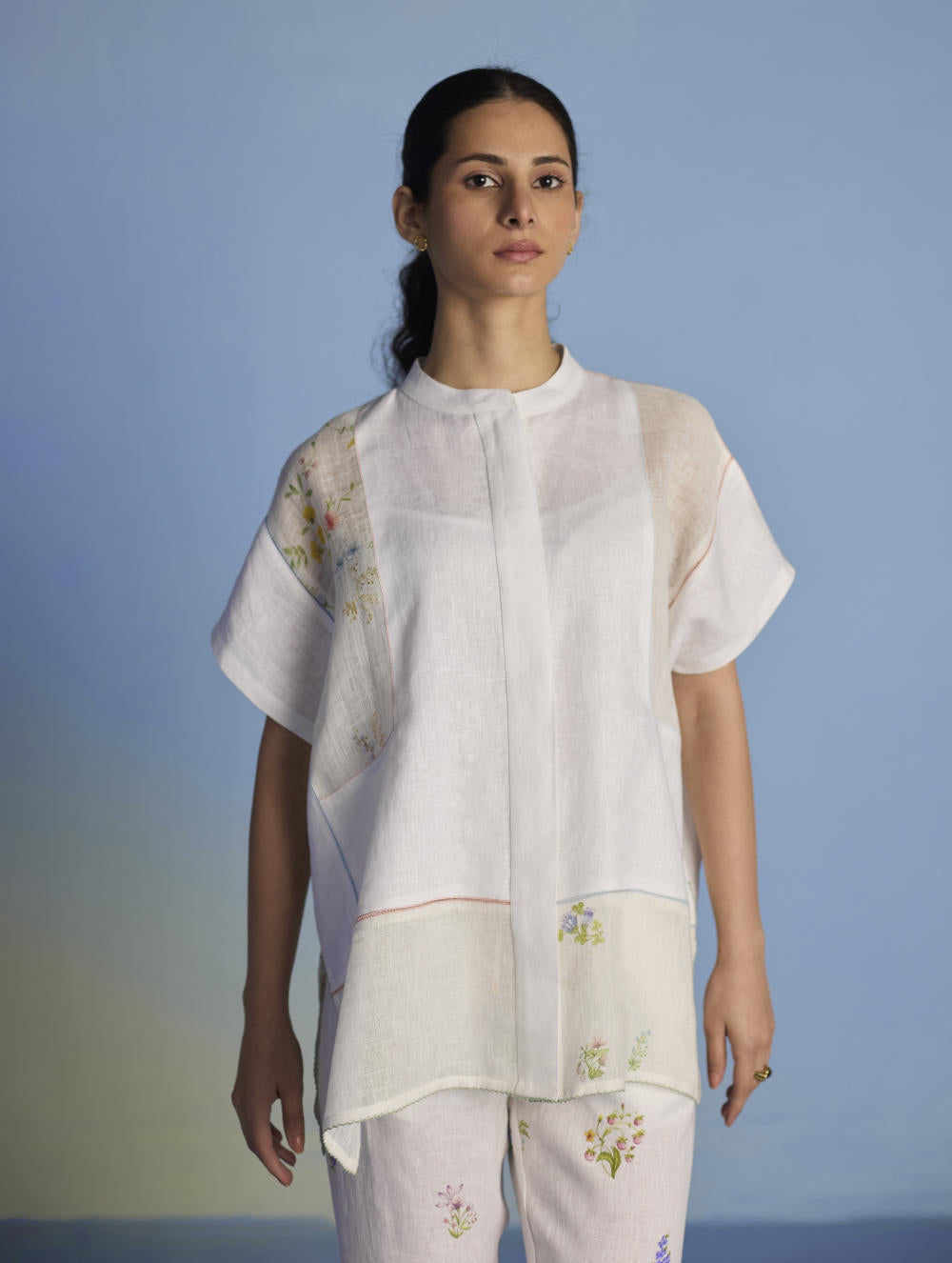 A flowing patchwork shirt crafted via patchwork of our signature soft yarn-dyed linen and sheer linen, featuring an intricate hand-painted floral print. Enhanced with multi-coloured fagotting stitch on adjoining patches, finished with colourful picoting at the hem.