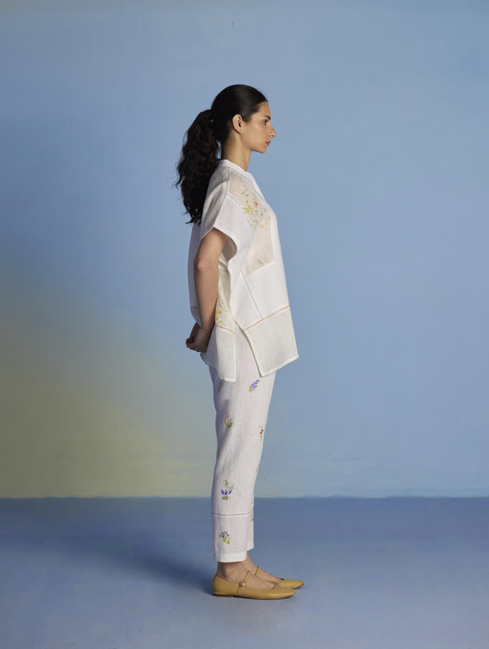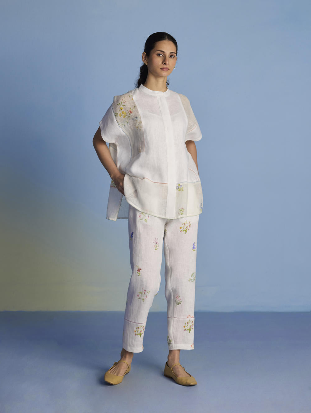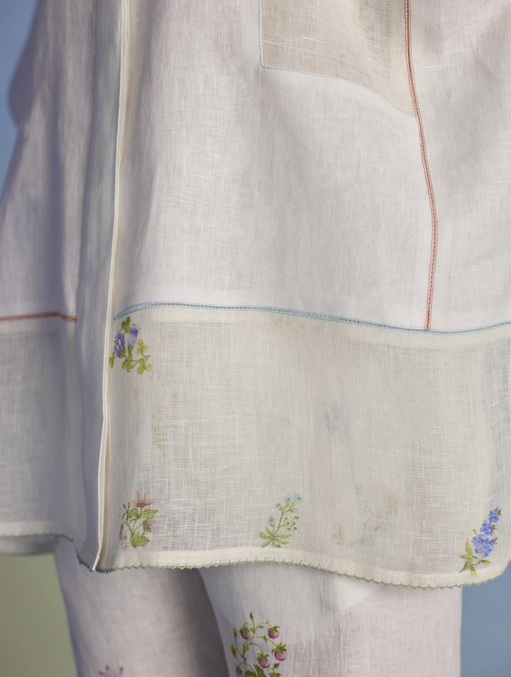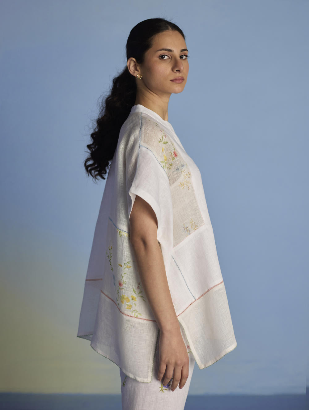 A flowing patchwork shirt crafted via patchwork of our signature soft yarn-dyed linen and sheer linen, featuring an intricate hand-painted floral print. Enhanced with multi-coloured fagotting stitch on adjoining patches, finished with colourful picoting at the hem.