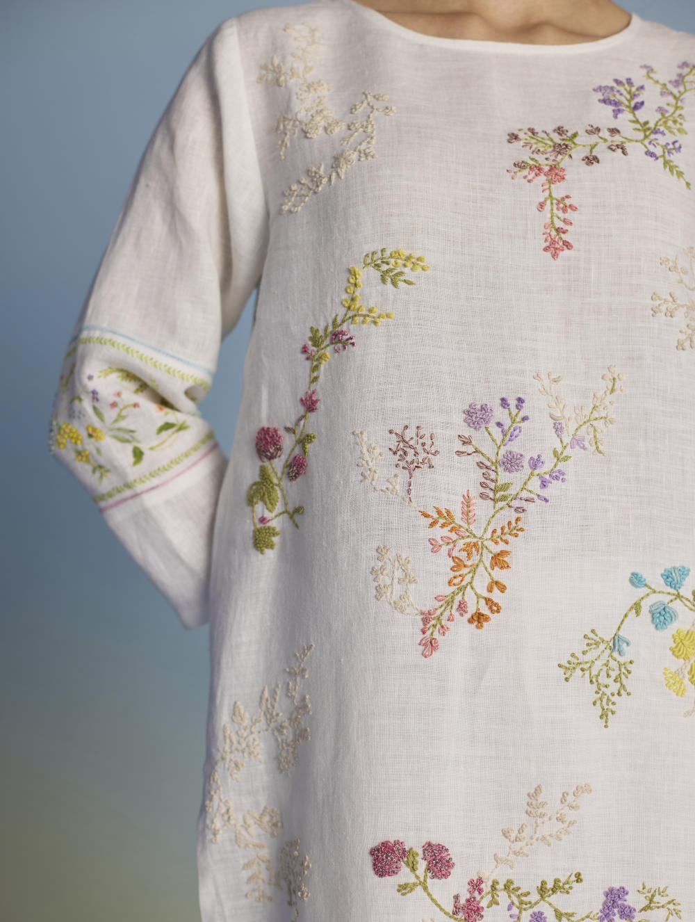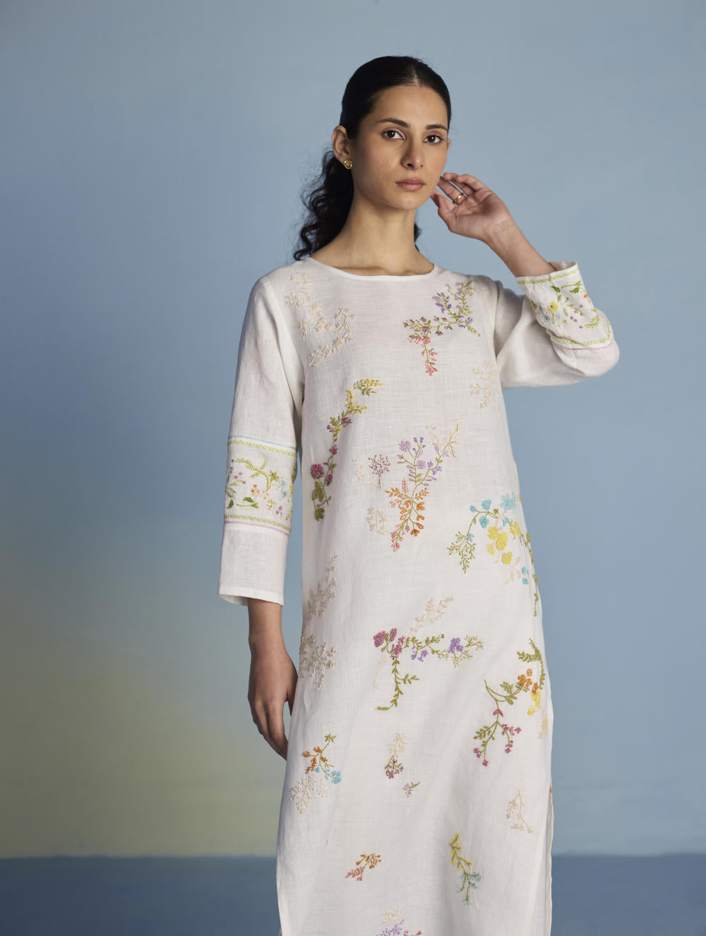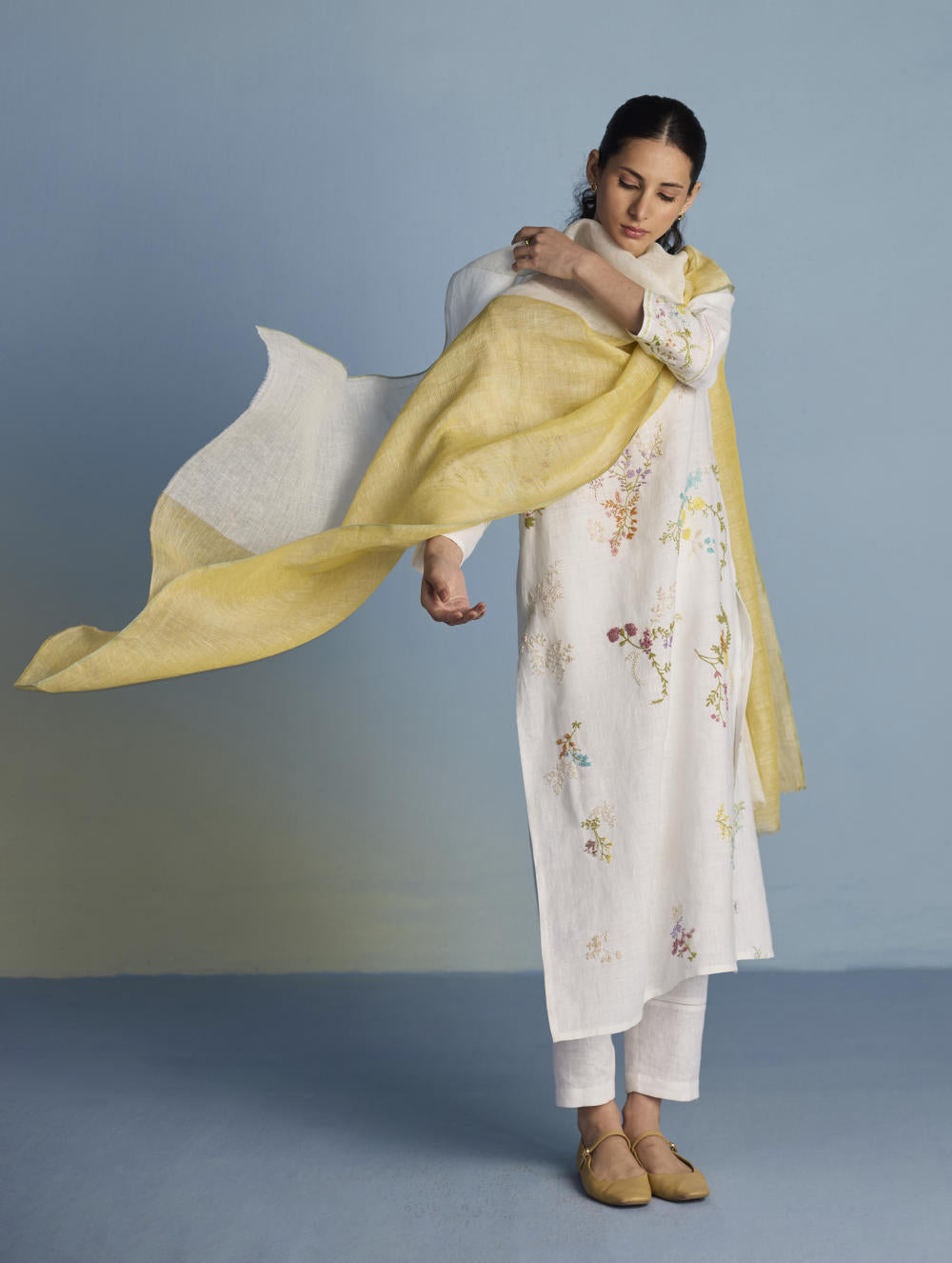 Kurta - A timeless boat neck kurta crafted from our signature soft yarn-dyed linen with meticulously hand-embroidered textural floral motifs with multiple french knots, spring embroidery, running stitch and aari stitch in multi-coloured threads on the front and the back is in a multi-coloured hand-painted floral print. The Emra Kurta is accentuated with a border with hand-embroidered beads and fagotting details on sleeves. Pant - A timeless tapered pants with pockets, elasticated back waistband and drawstring handcrafted in our signature yarn-dyed linen detailed with a tonal faggoting stitch at the hemline. A versatile fit that can be dressed up or down based on the occasion. Dupatta - A soft handwoven pure linen dupatta with a woven color-blocked design with 2/3rd of the design in mint and 1/3rd in ivory finished with a pop colour selvedge.