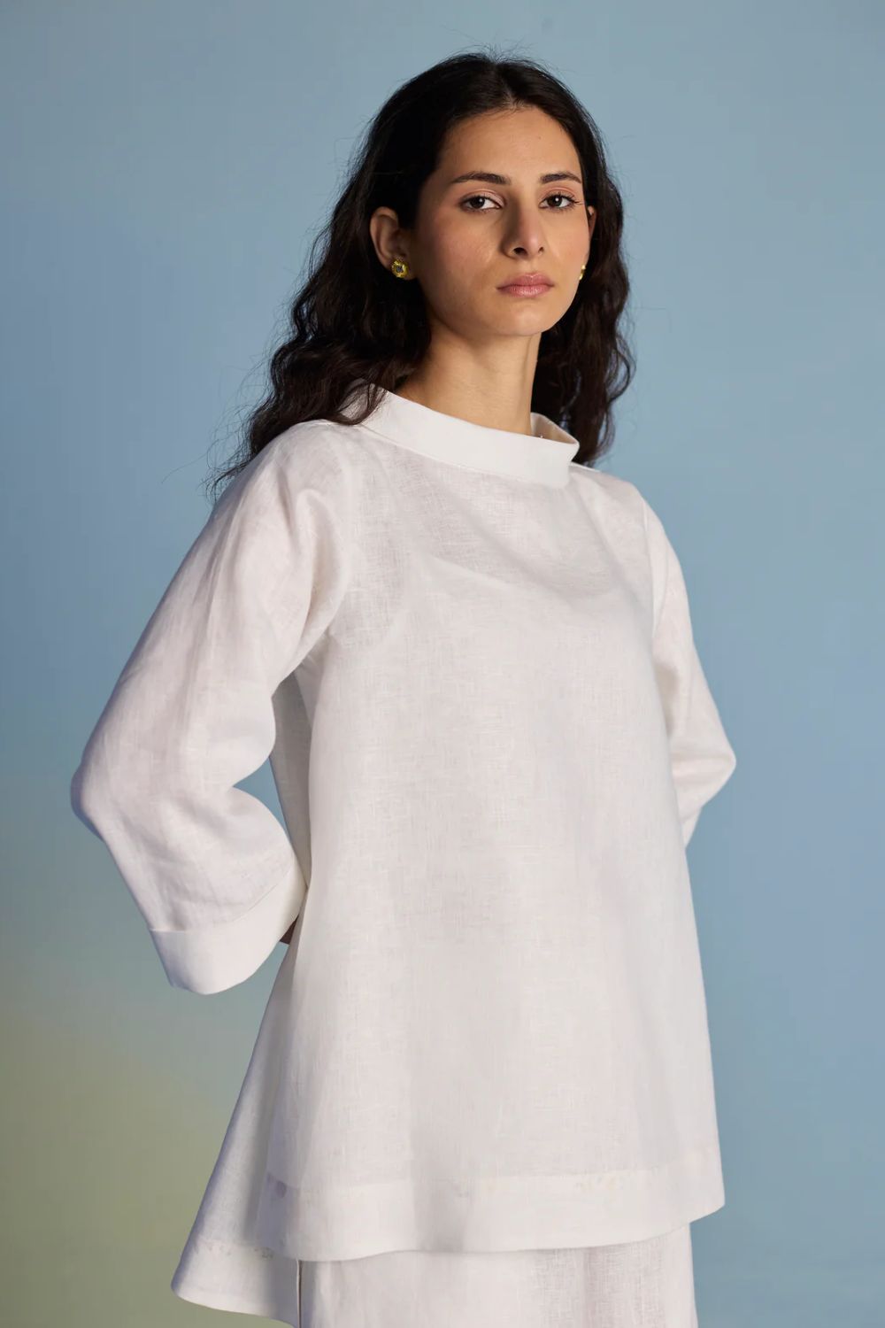 A statement boat neck top with 3/4th flared sleeve handcrafted in our signature soft yarn-dyed linen. The boat-neck top pairs beautifully with our linen pants or your favourite denims and is finished with delicate hand painted floral print facing and long slit sides for easy movement.