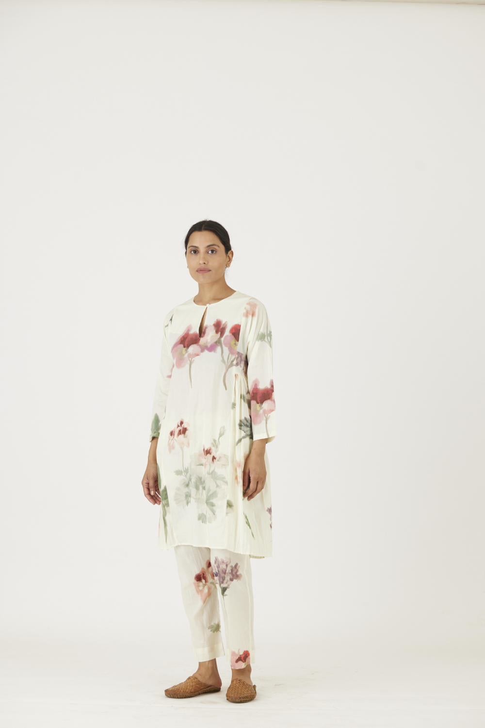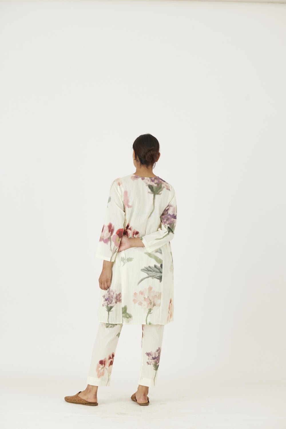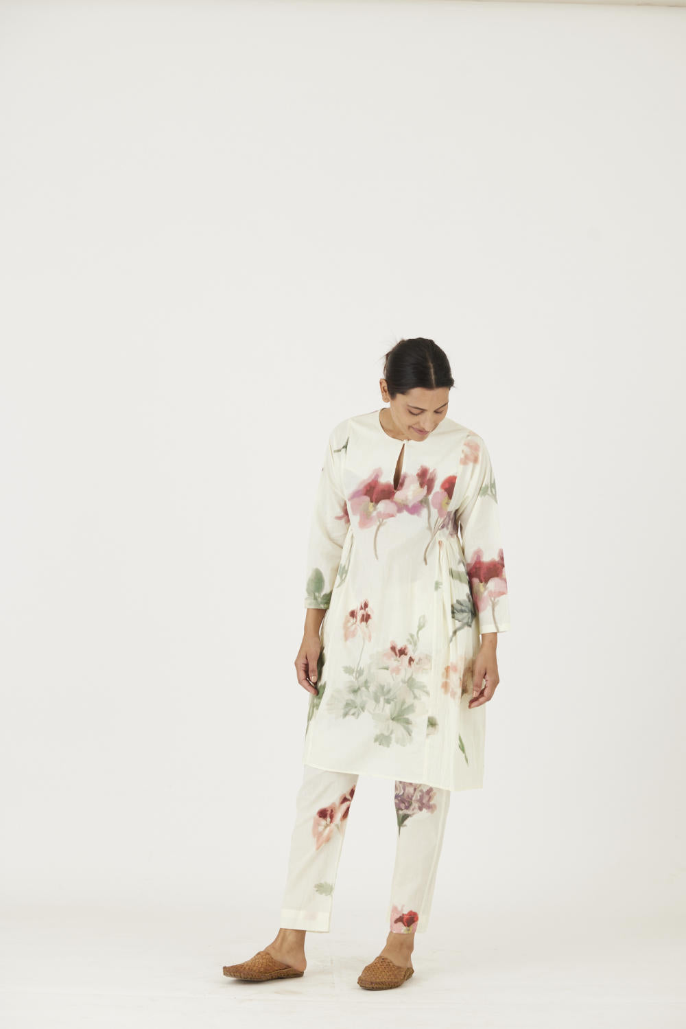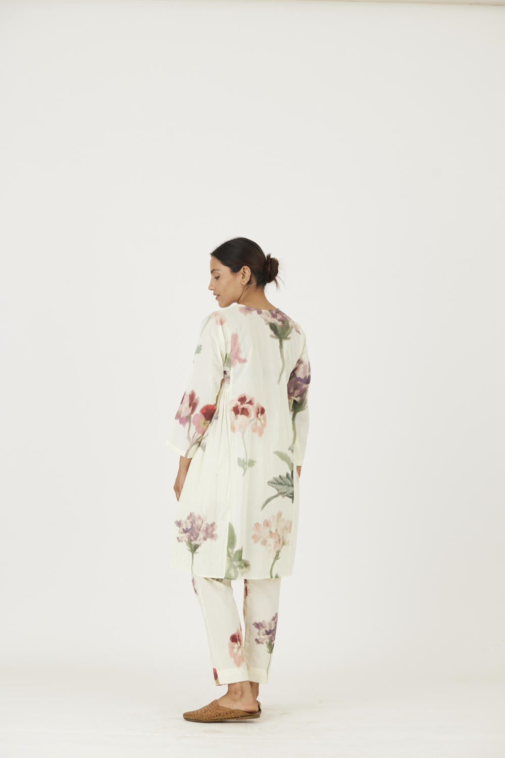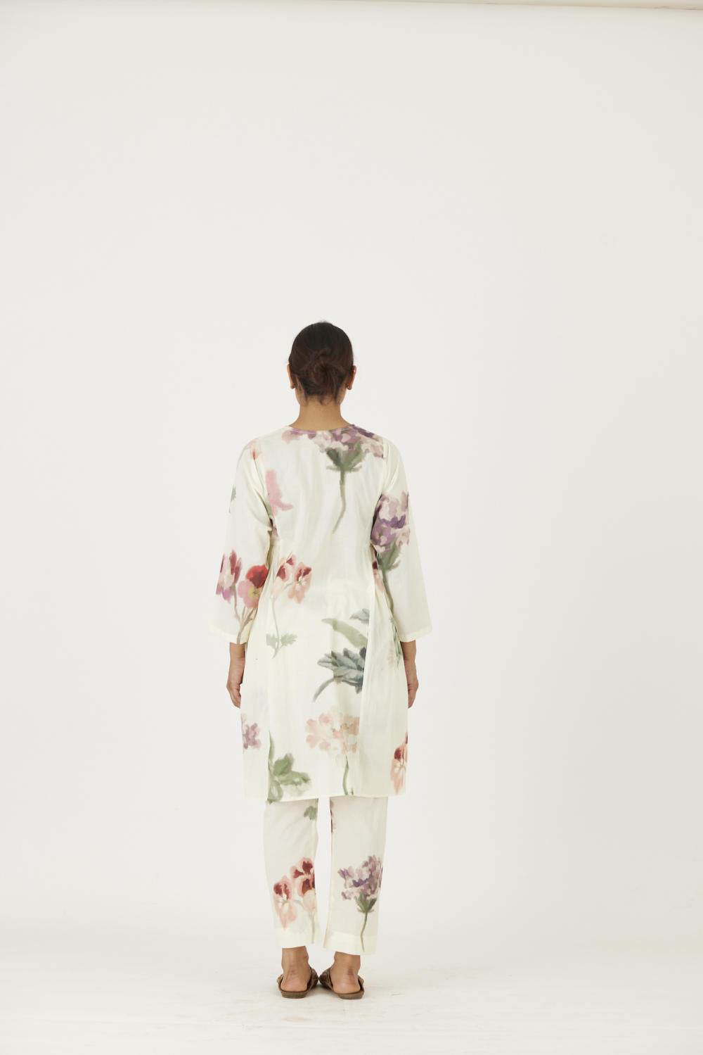 The print features in hand drawn botanical motifs in a soft white base. The set is crafted in the juliet print carefully printed on Pure cotton featuring a kurta with side gathers. The set includes a kurta and pants.