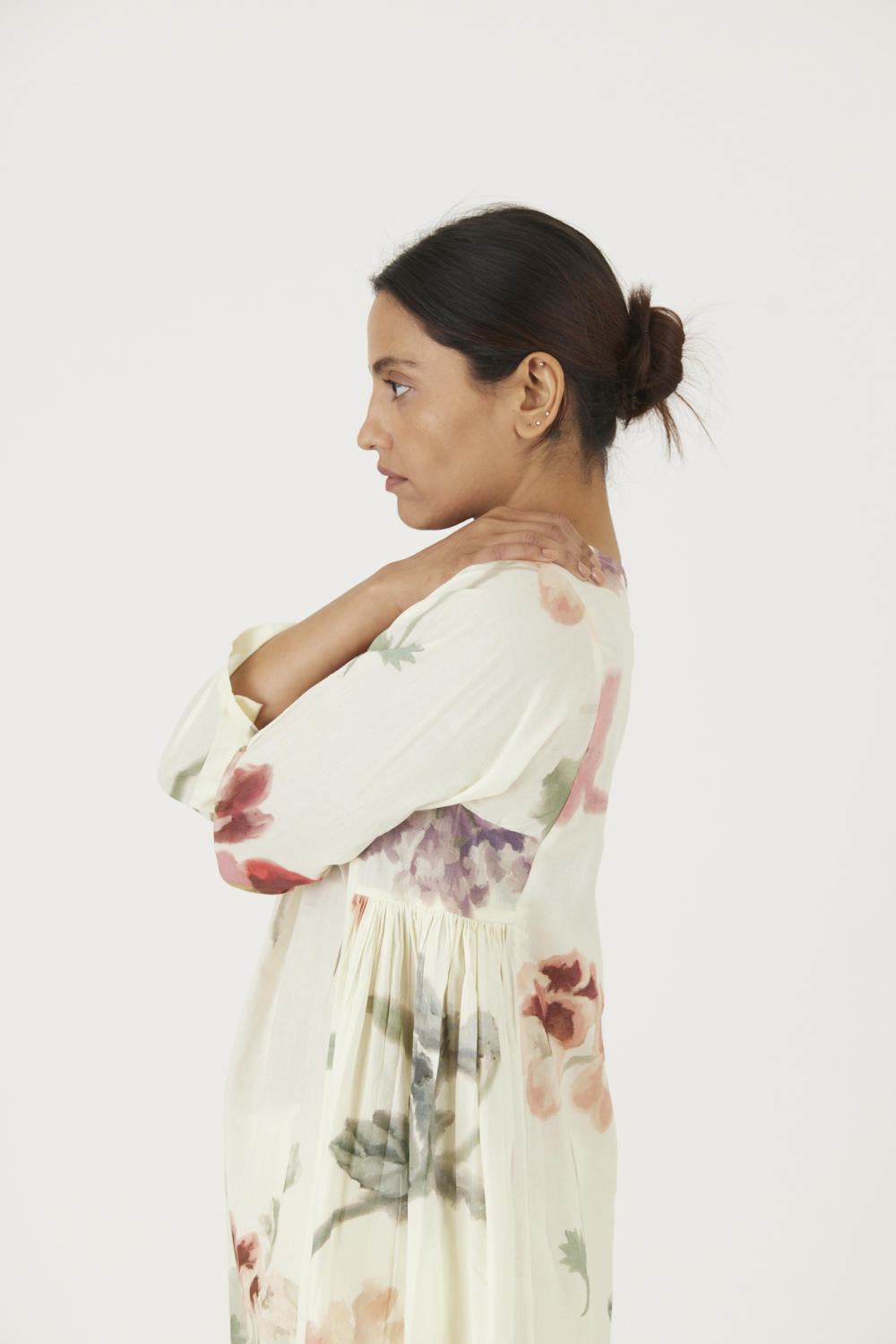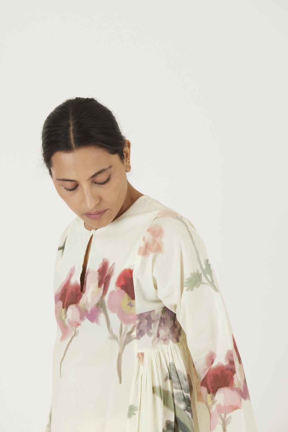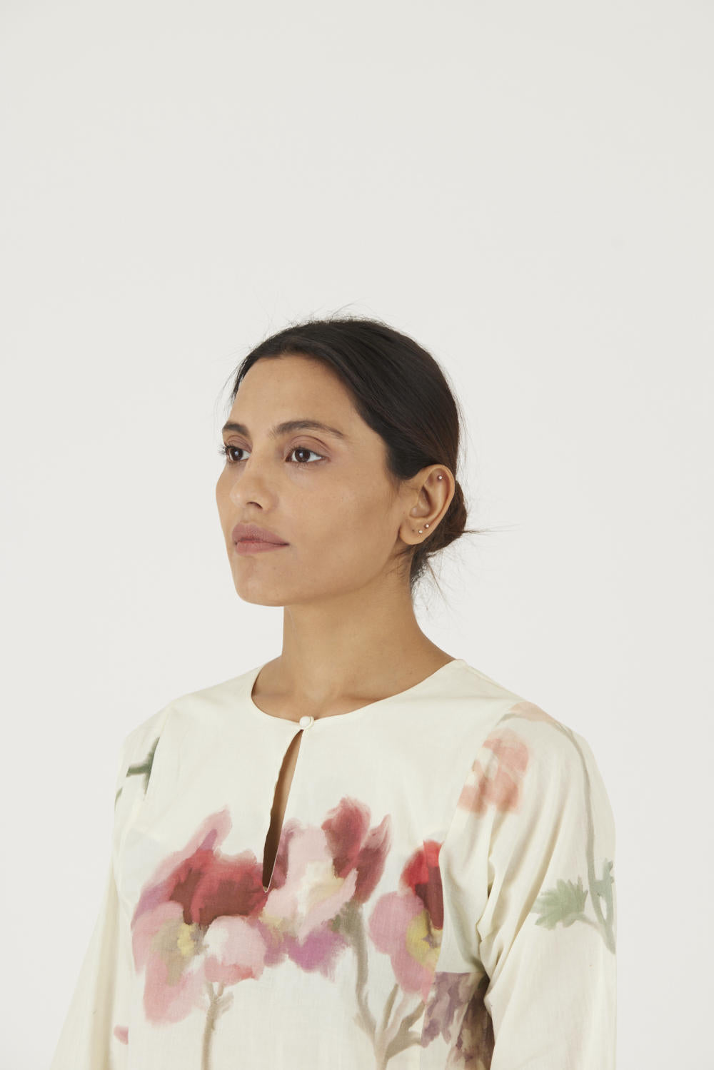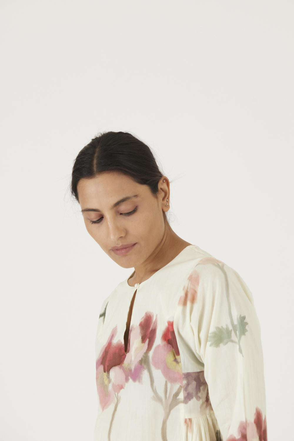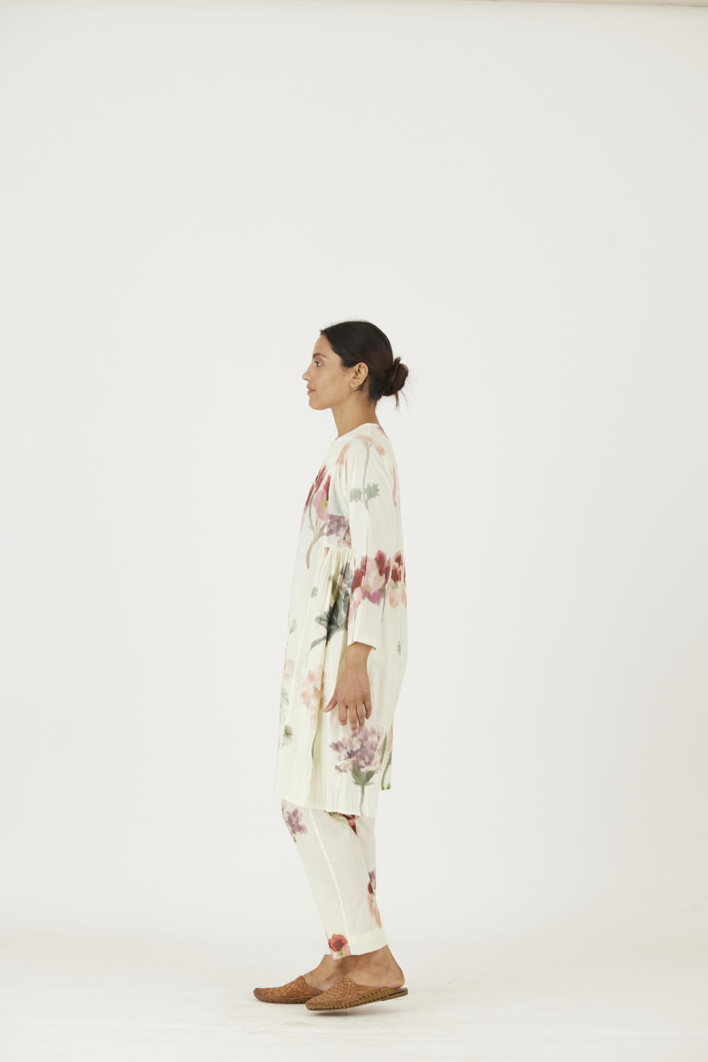 The print features in hand drawn botanical motifs in a soft white base. The set is crafted in the juliet print carefully printed on Pure cotton featuring a kurta with side gathers. The set includes a kurta and pants.