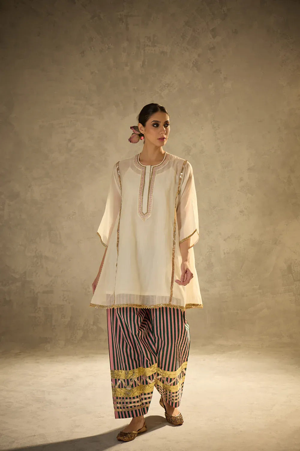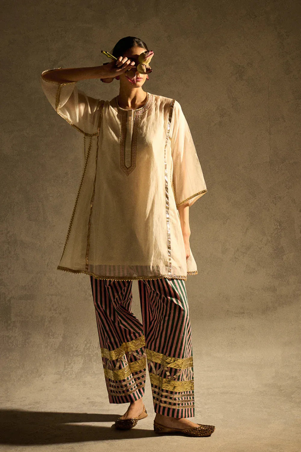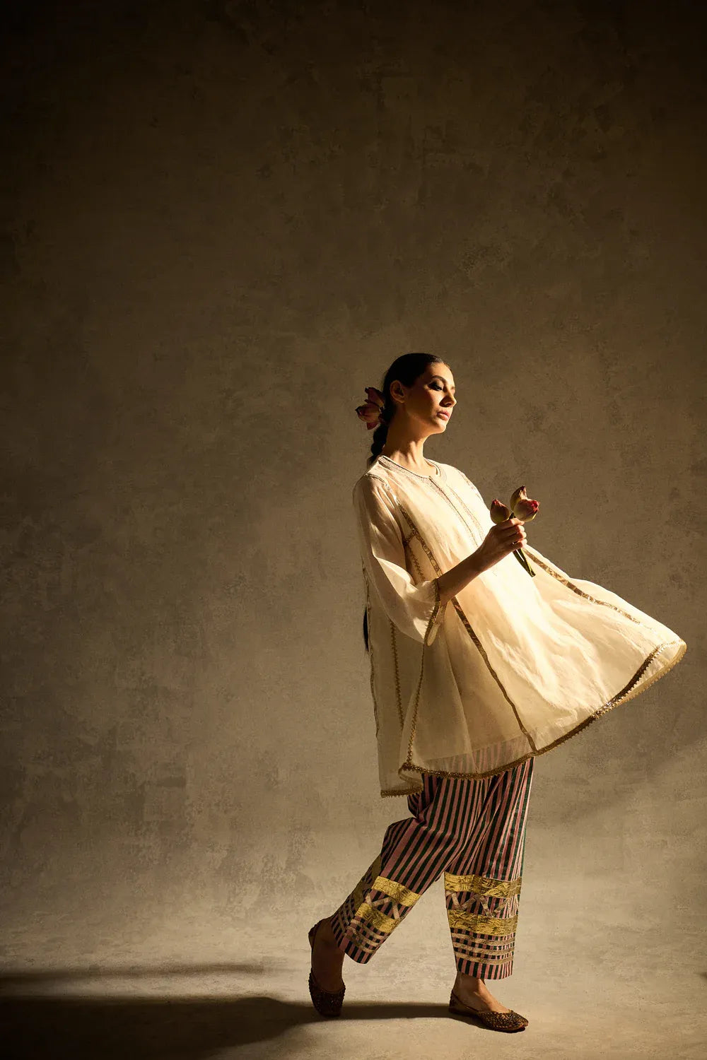 Crafted in lightweight cotton-chanderi, this kalidaar kurta features elegant gota patti embroidery, enhanced by delicate bead and zari work around the neckline for a touch of shimmer. The accompanying striped salwar pants mirror the gota motif with coordinating embellishment