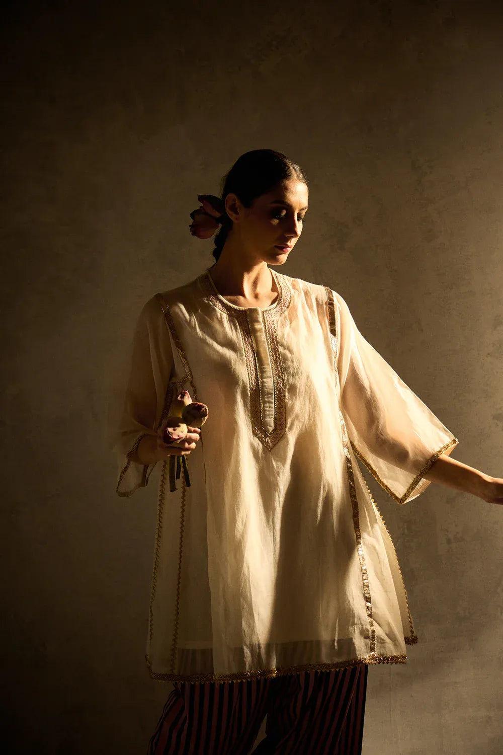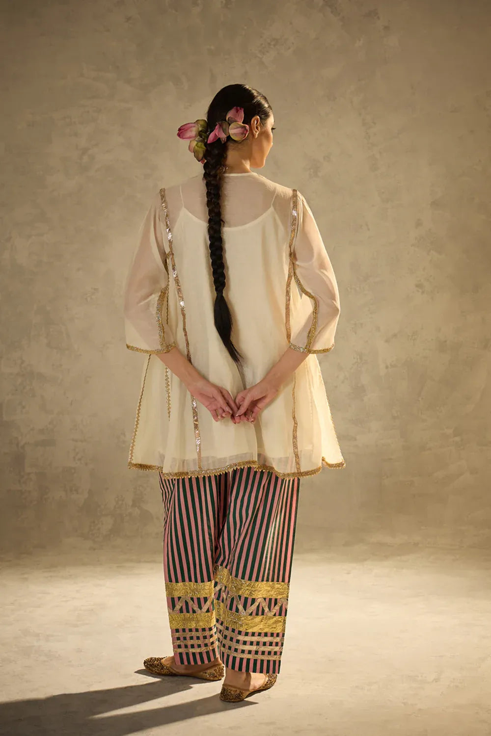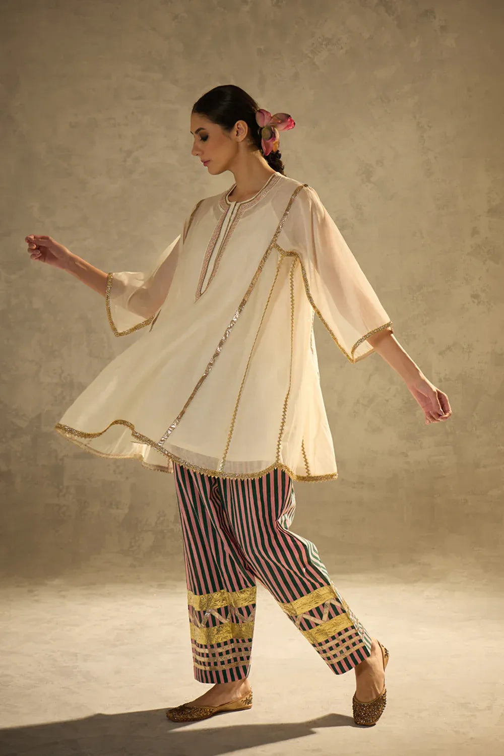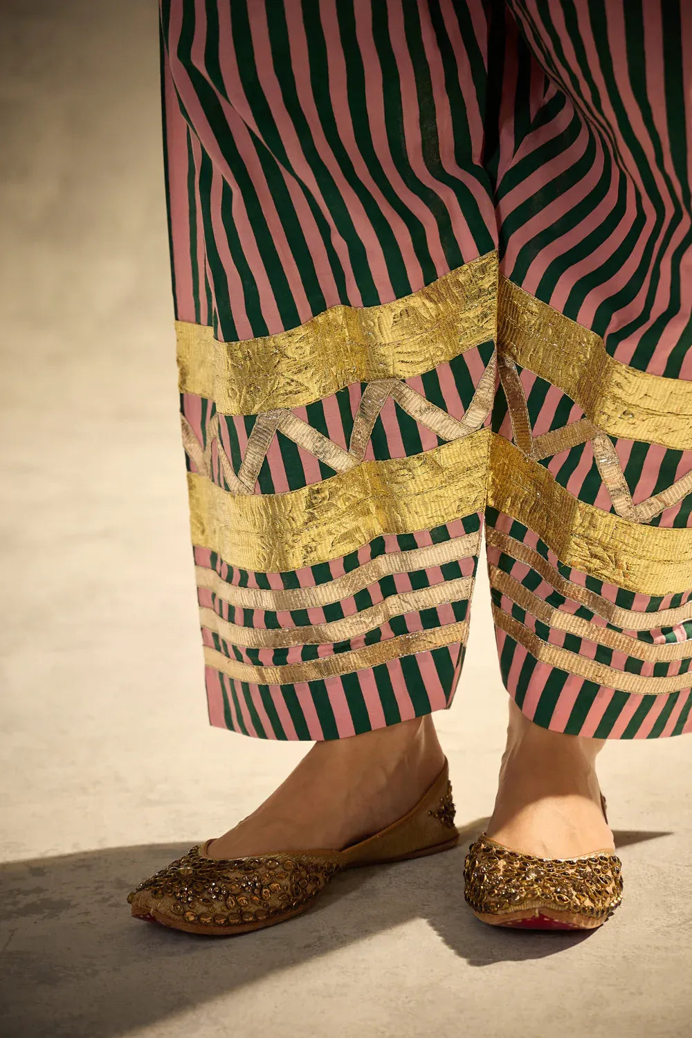 Crafted in lightweight cotton-chanderi, this kalidaar kurta features elegant gota patti embroidery, enhanced by delicate bead and zari work around the neckline for a touch of shimmer. The accompanying striped salwar pants mirror the gota motif with coordinating embellishment