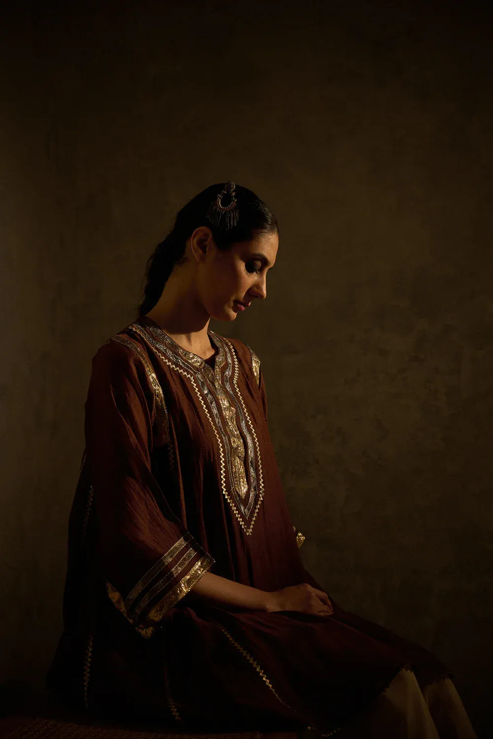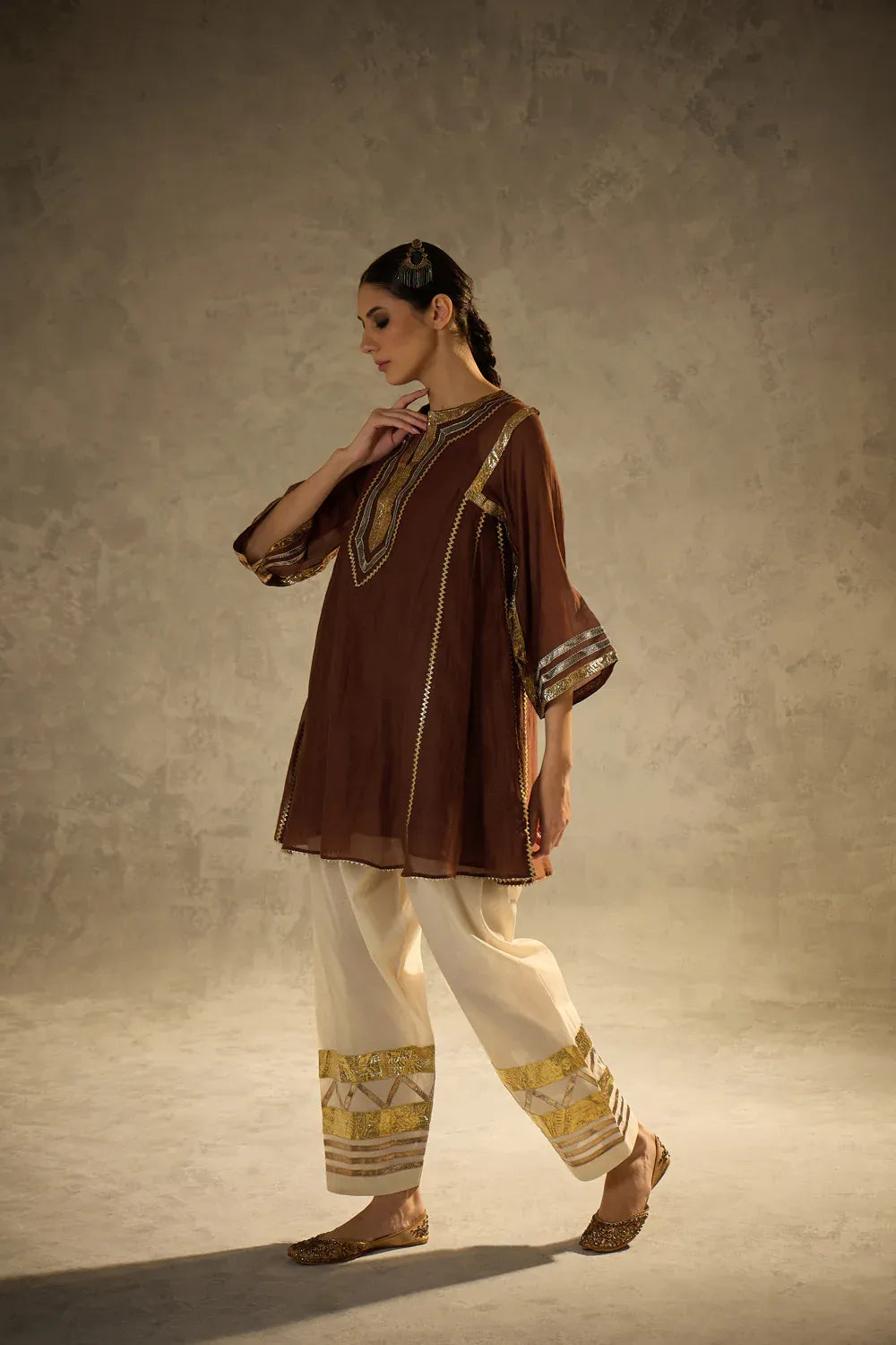 A beautiful brown kalidaar kurta crafted with delicate sucha gota work, blending classic cuts with modern refinement. The kurta features clean lines and thoughtful detailing, paired with our timeless gota salwar highlighted with artistic gota patterns.