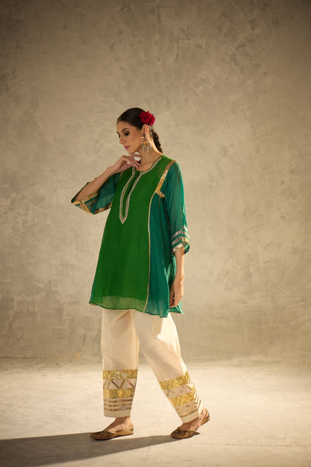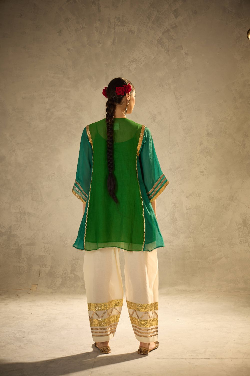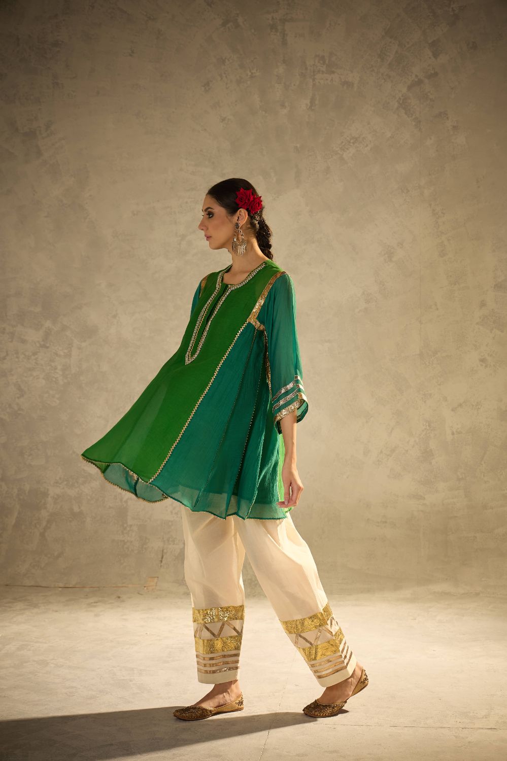 A kalidaar kurta in beautiful shades of green crafted with delicate sucha gota work, blending classic cuts with modern refinement. The kurta features clean lines and thoughtful detailing, paired with our timeless gota salwar highlighted with artistic gota patterns.