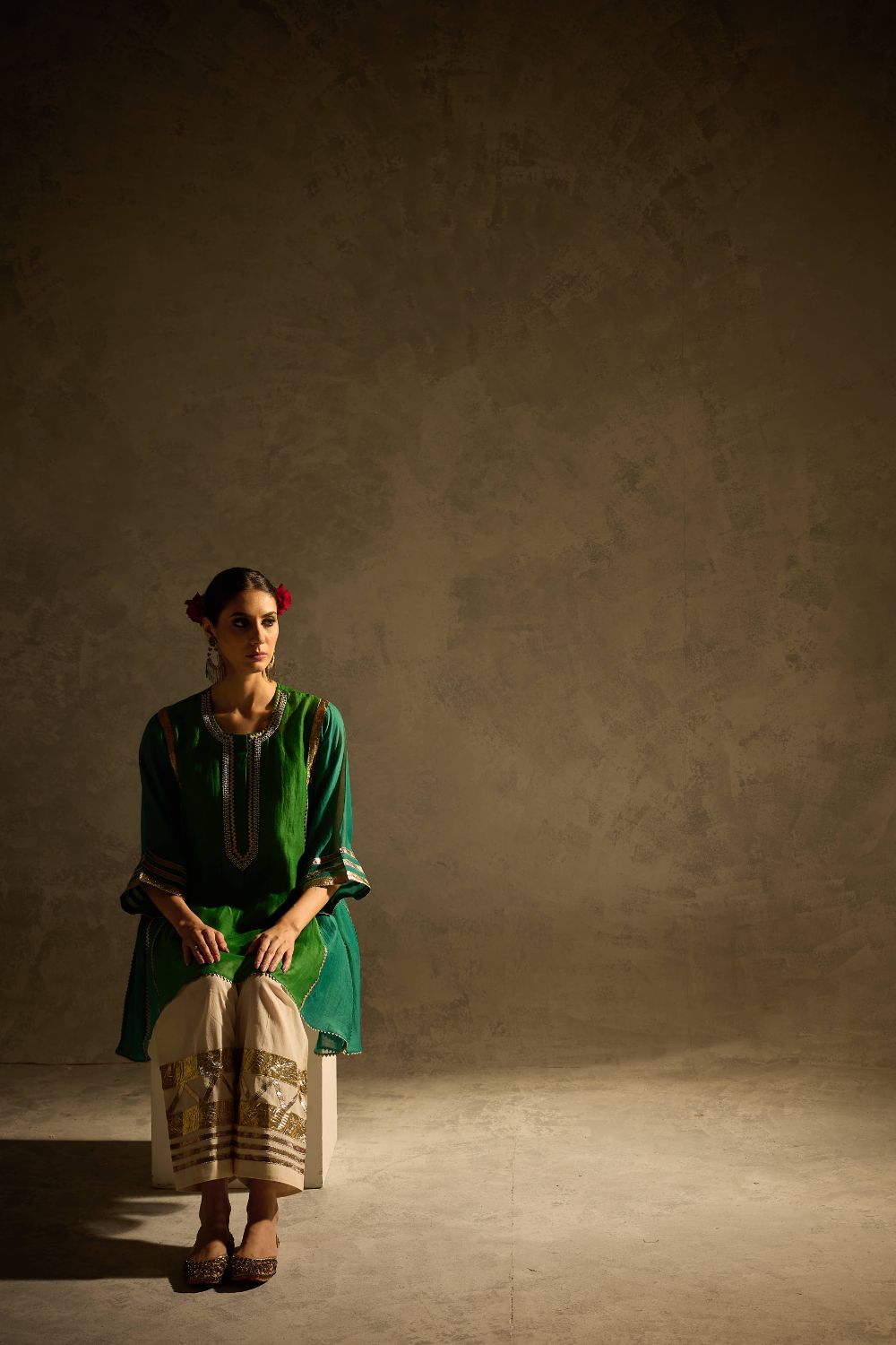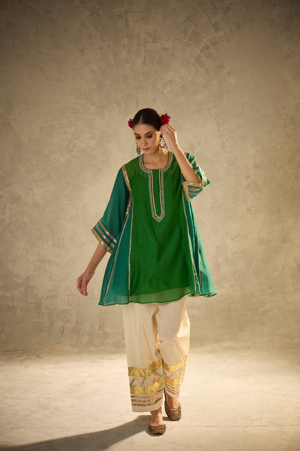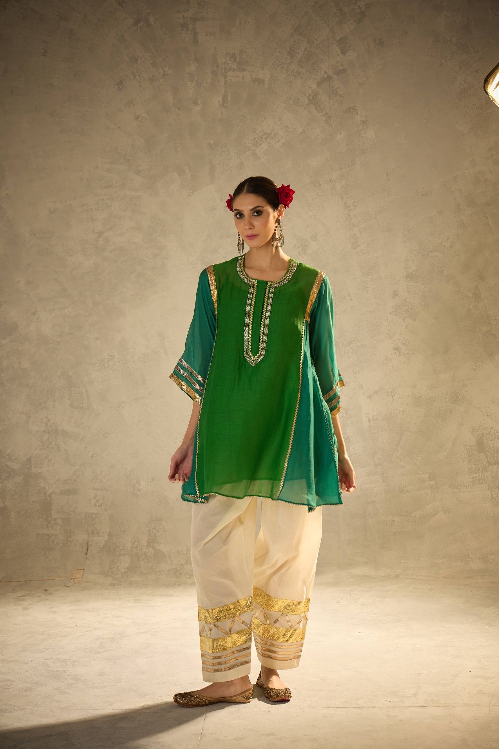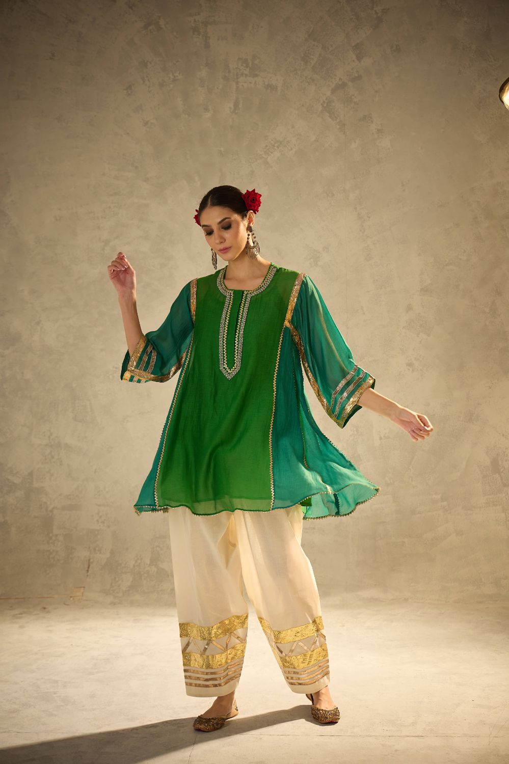 A kalidaar kurta in beautiful shades of green crafted with delicate sucha gota work, blending classic cuts with modern refinement. The kurta features clean lines and thoughtful detailing, paired with our timeless gota salwar highlighted with artistic gota patterns.