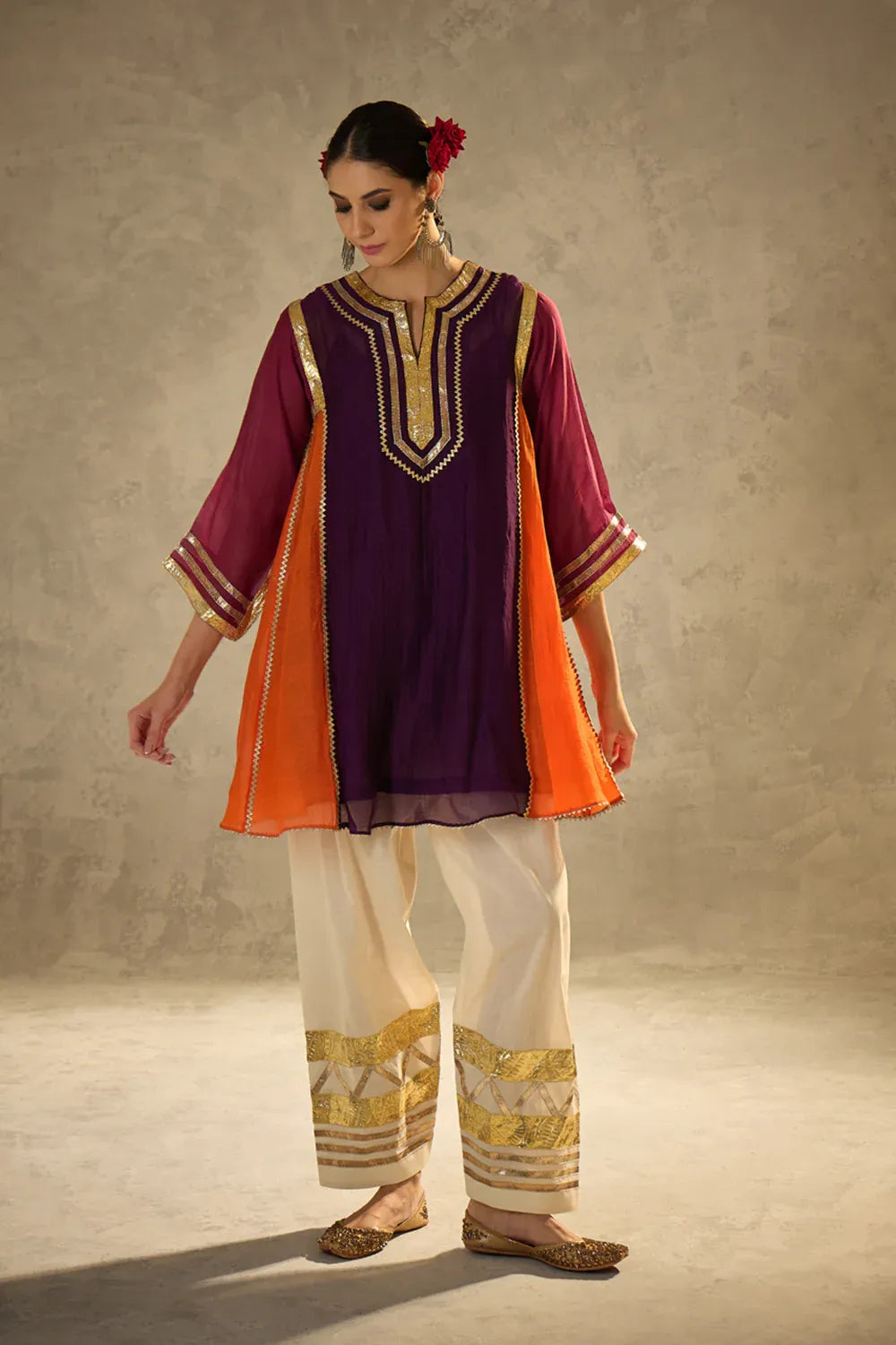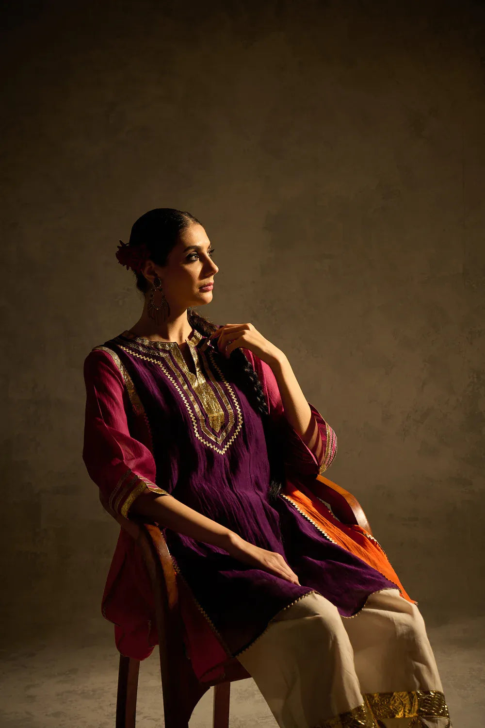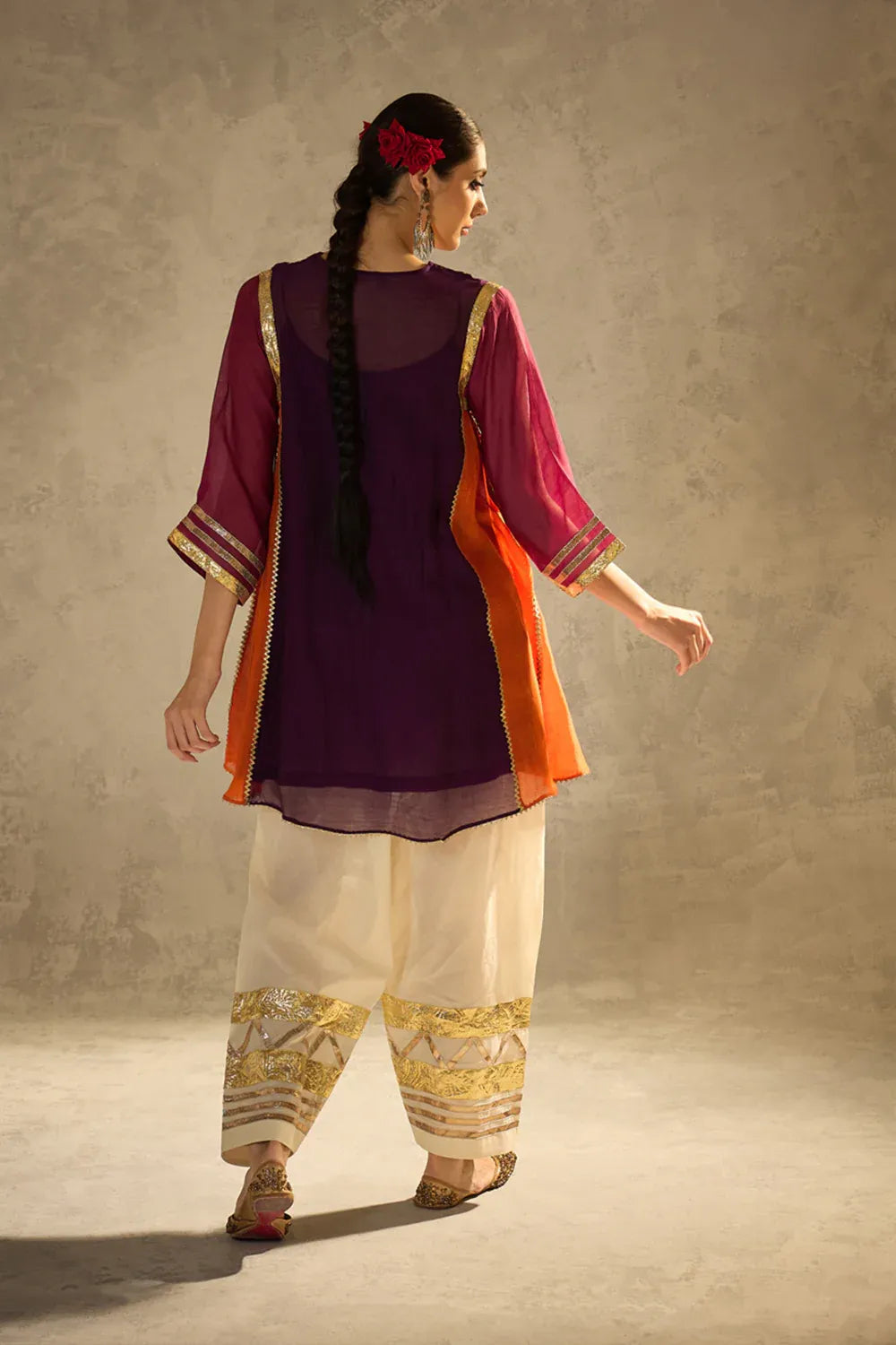 A Vibrant maroon N red kalidaar kurta crafted with delicate sucha gota work, blending classic cuts with modern refinement. The kurta features clean lines and thoughtful detailing, paired with our timeless gota salwar highlighted with artistic gota patterns.