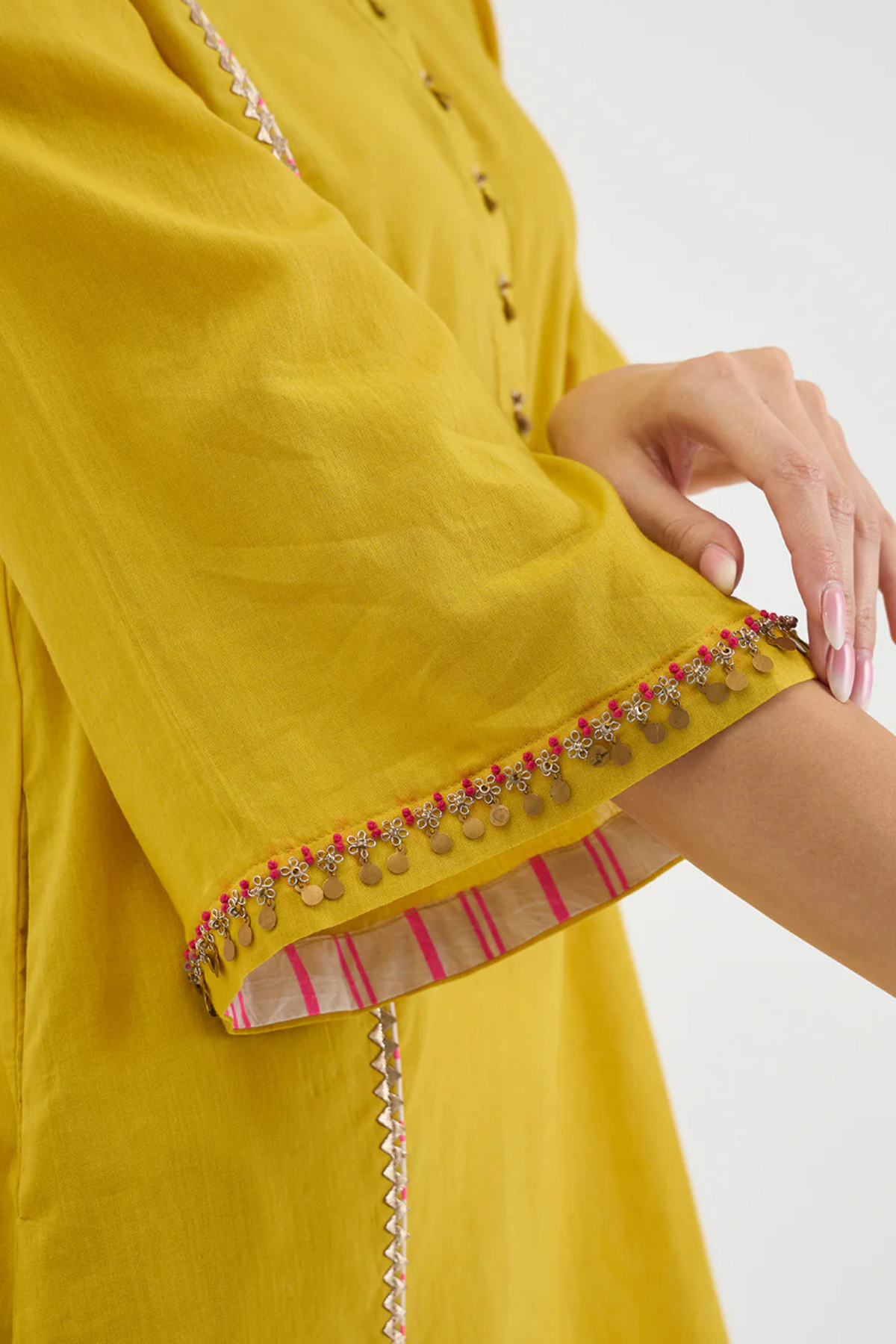 Kalidaar short yellow kurta emblished with gota on the kali, intricate hand embroidery on the sleeves, paired up with printed farsi pant.