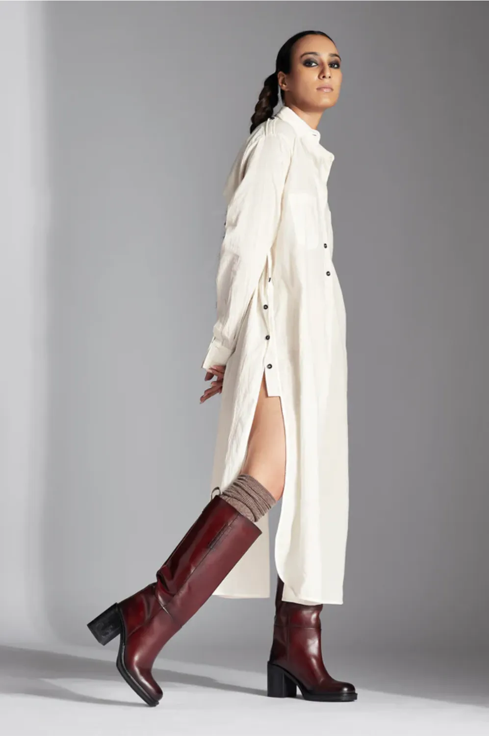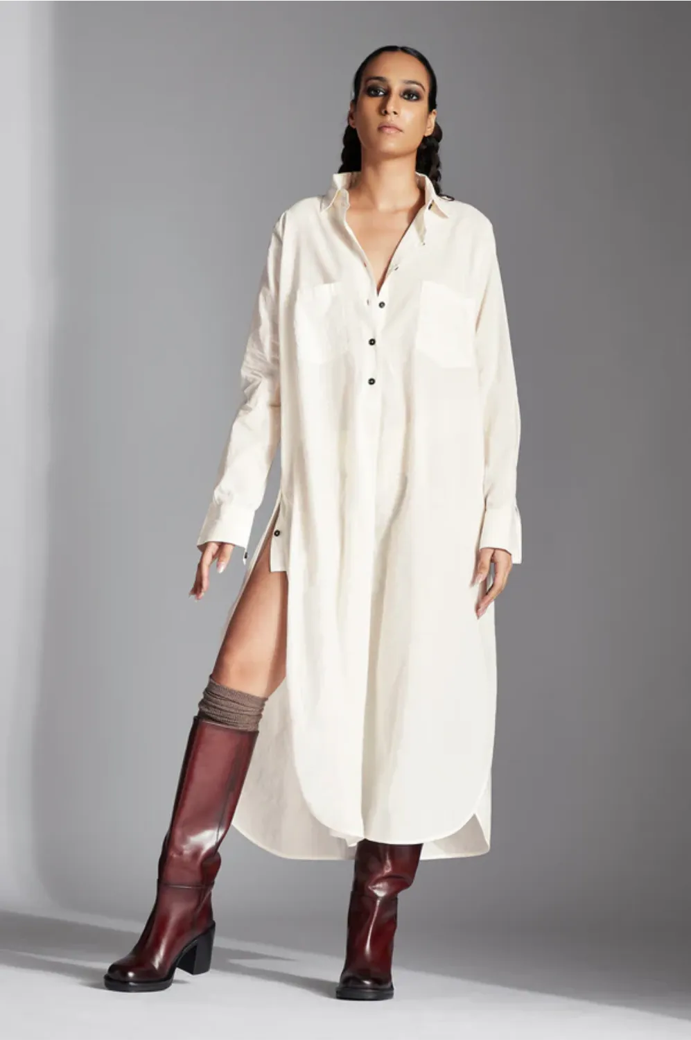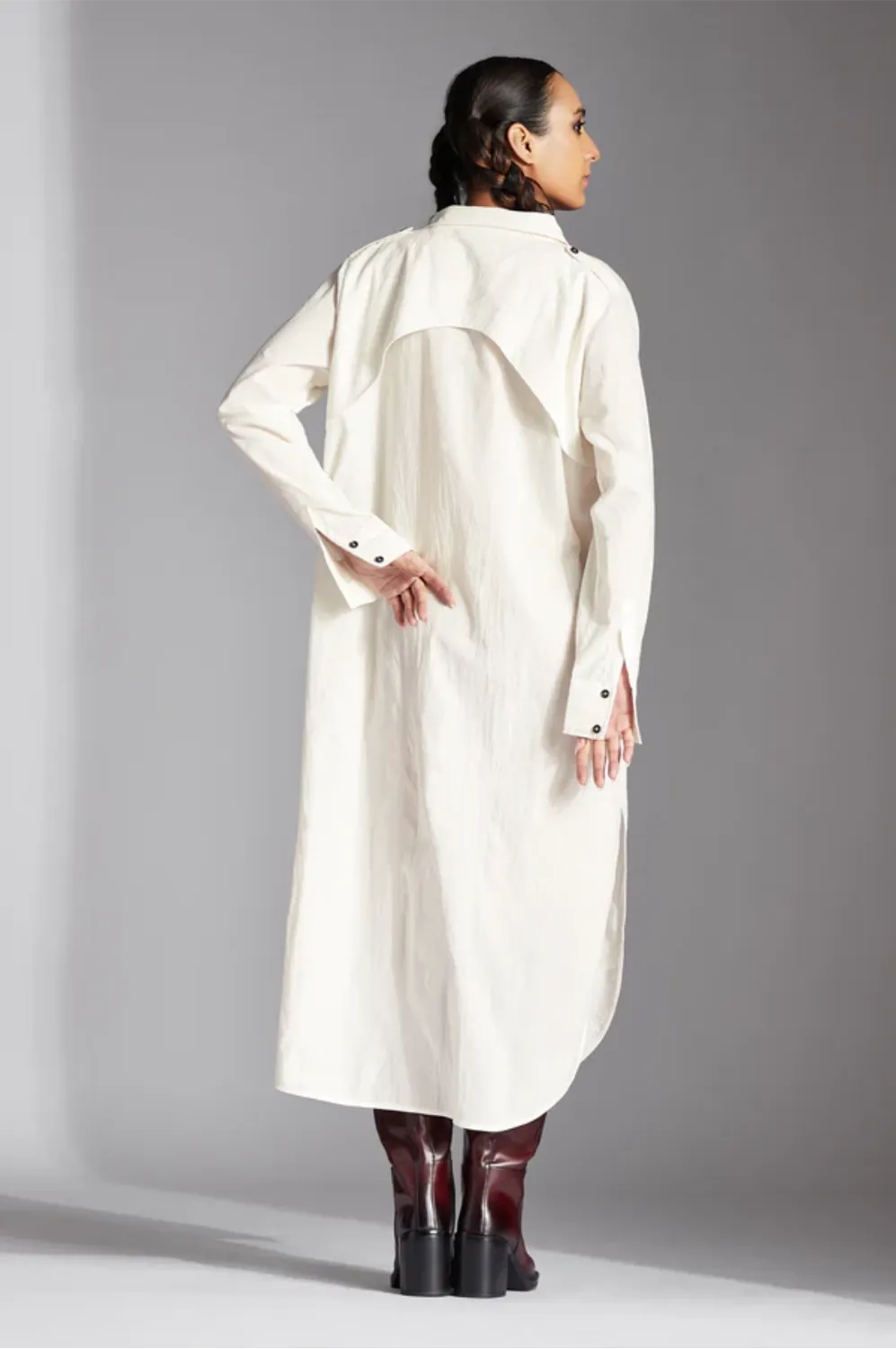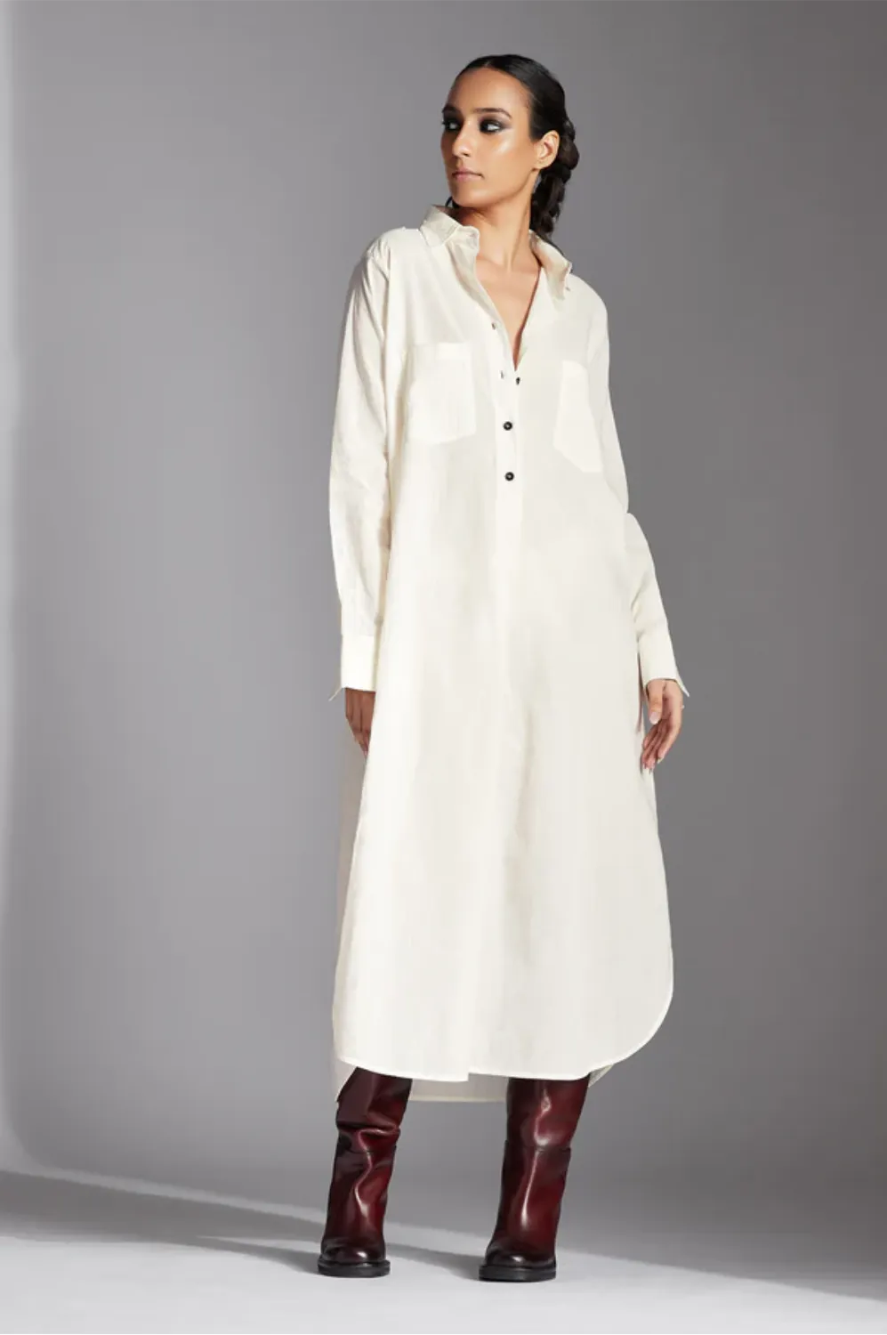The Alin shirt features a shirt collar, half front button down placket with pleat, patch pockets, side extensions with buttons,curved back flap and narrow full sleeves.