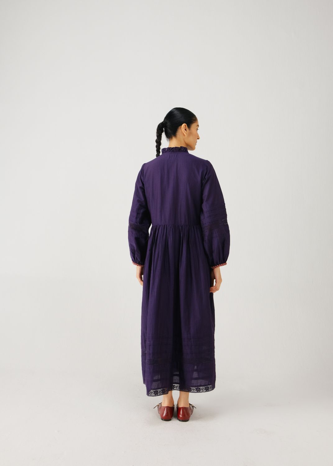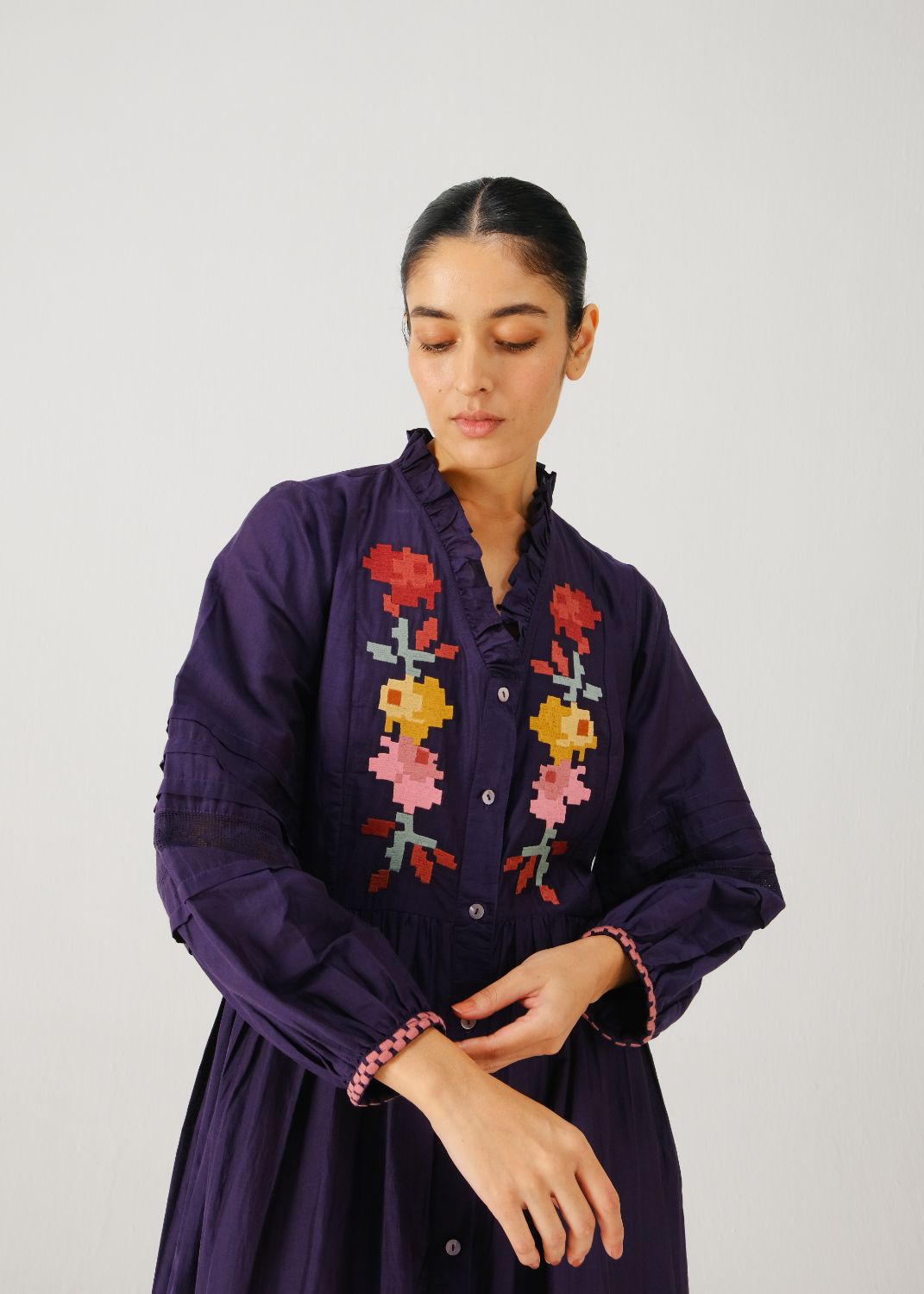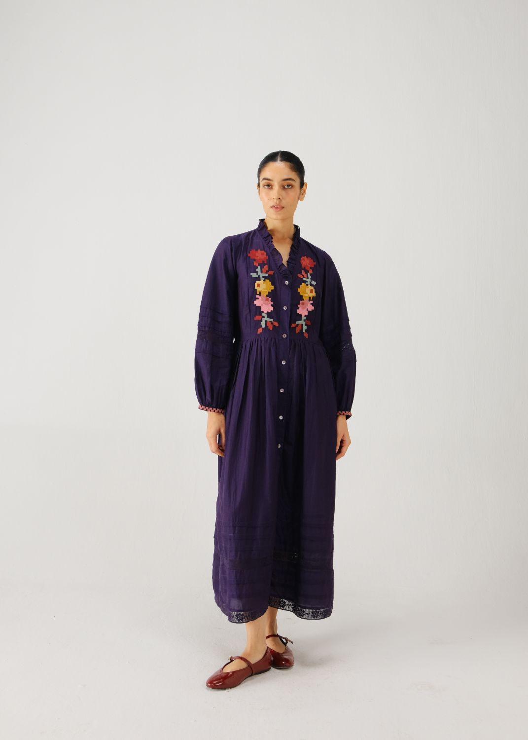 The Jade Dress, crafted in cotton-silk, features pixel embroidery on the front panels, frill collar, delicate embroidered cuffs, and lace along the hem. Pintuck and lace details adorn the sleeves and hem.