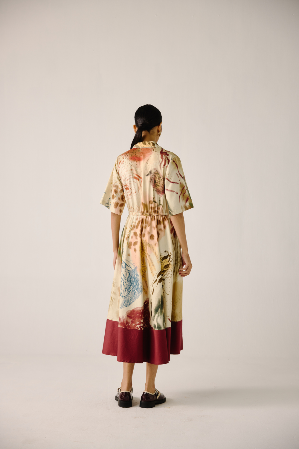 This stylish dress featuring notched lapels, elasticated waist and color blocked design element, with separate color blocked panel at the bottom around legs is made in pure cotton fabric. This dress is a must-have statement piece for your wardrobe.