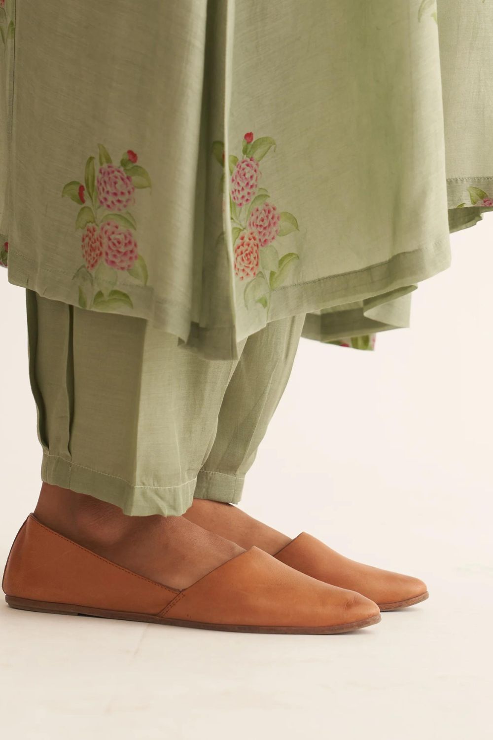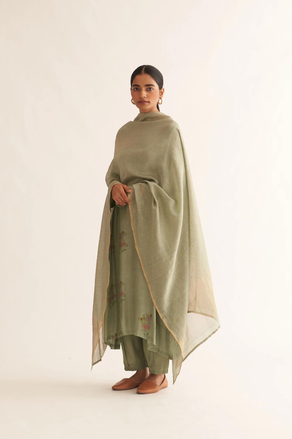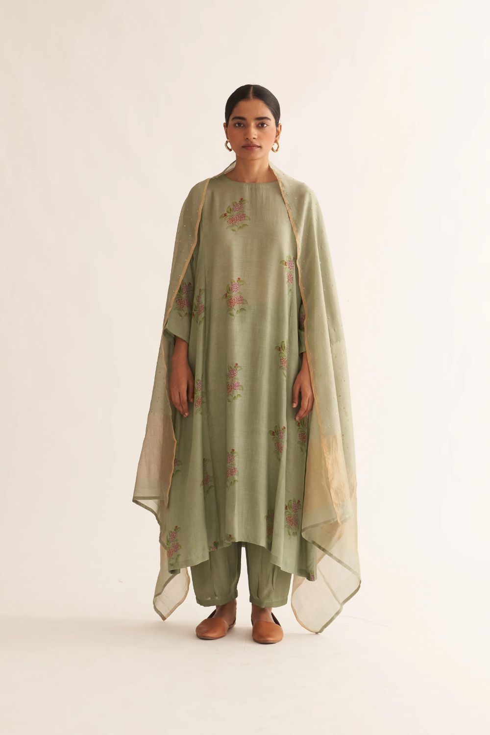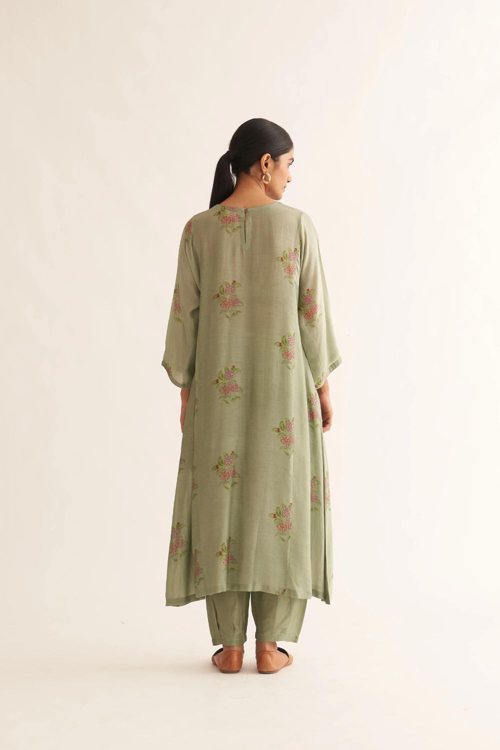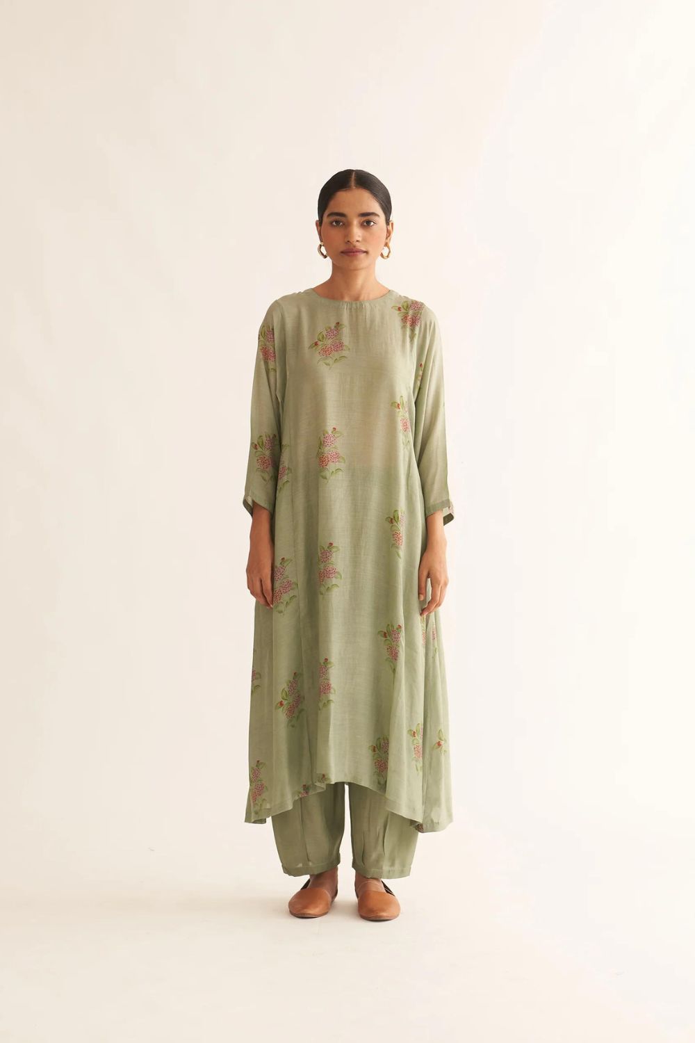Featuring a sage green kurta in floral print paired with Silk pants.