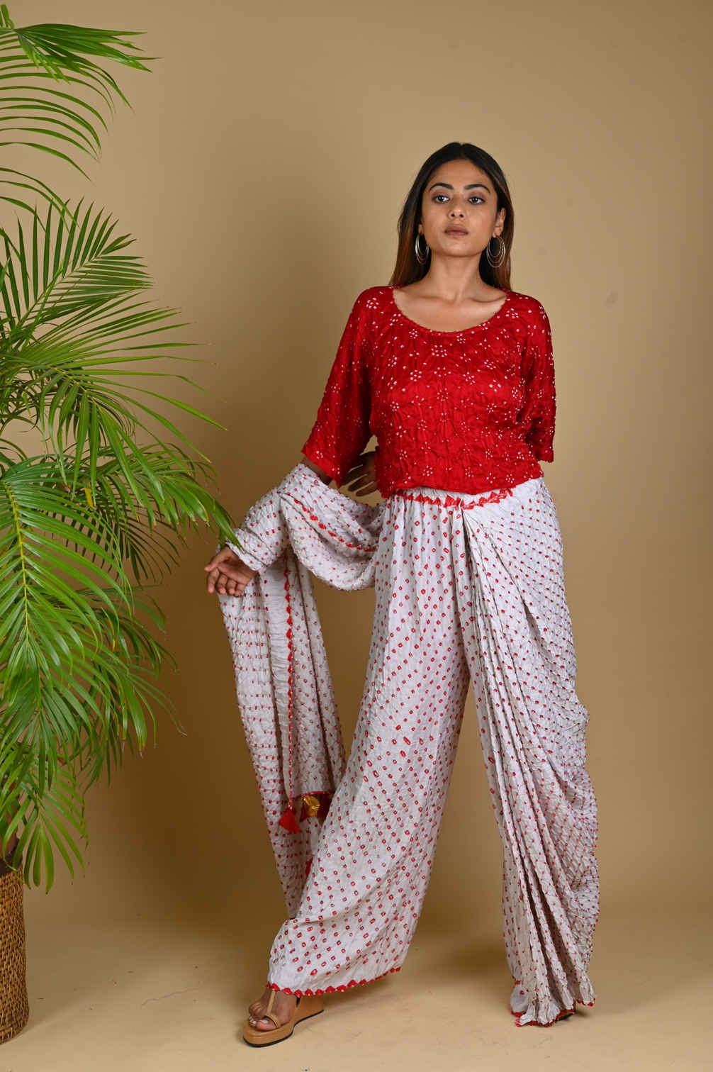 A prestitched saree with pants attached. Slip on the palazzo and sling the free drape as you please. Hands free and hassle free. The ends are finished with handmade tassles. Best teamed with our Crop Top.