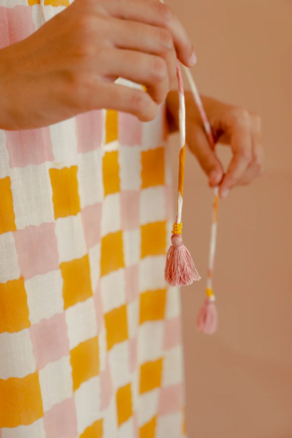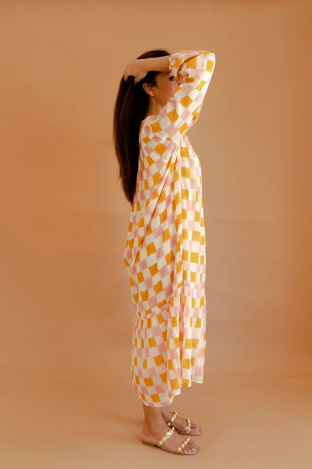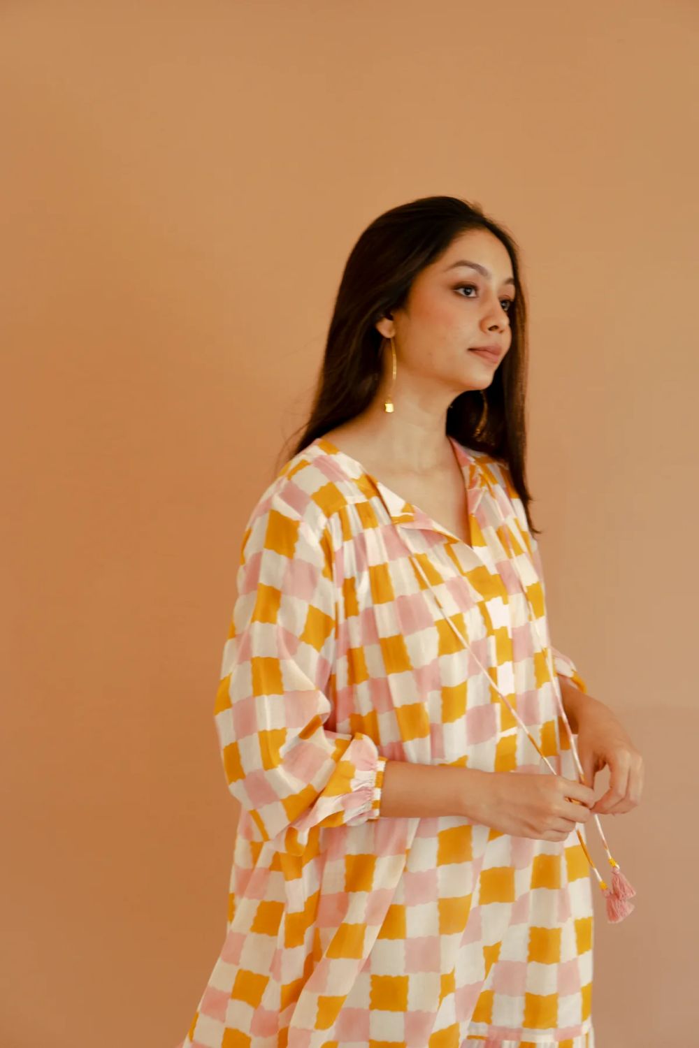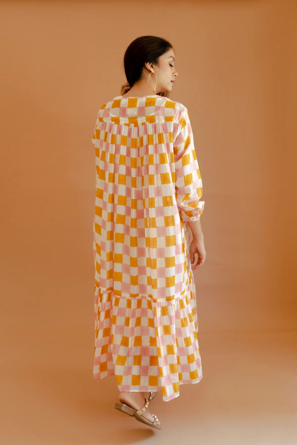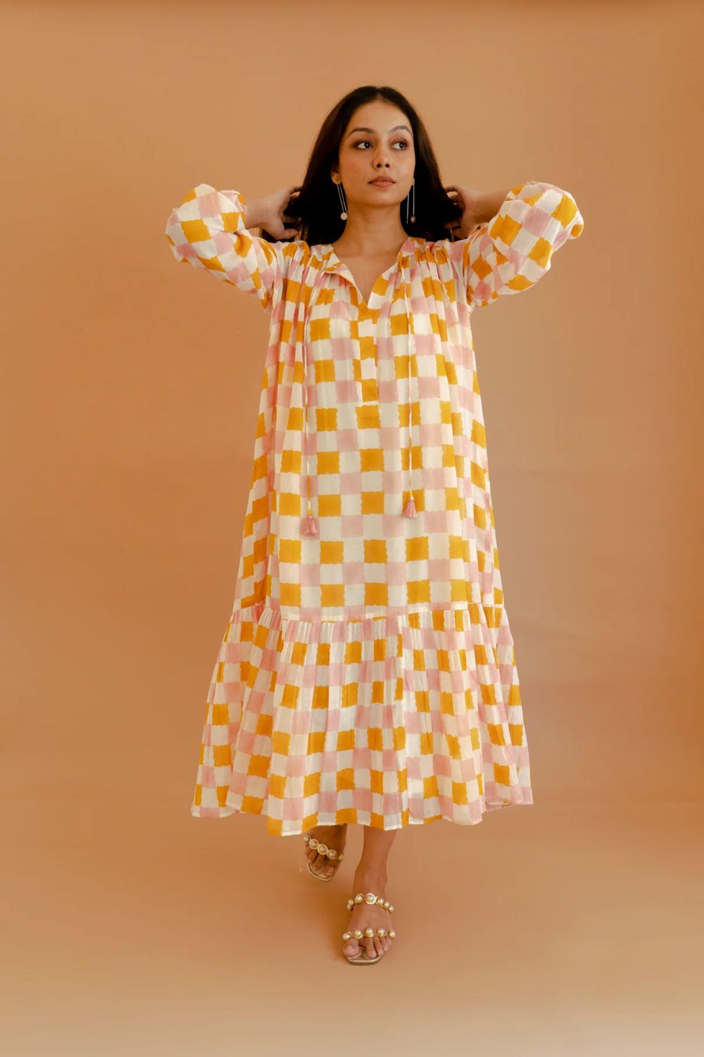 This ivory and mango yellow checked dress, crafted from breathable cotton mul fabric, combines timeless design with modern sensibility. Featuring a relaxed fit, 3/4 sleeves, and a round neckline with subtle V-slit and strings, it offers both comfort and style. The pleated frill at the bottom adds a touch of femininity, making it a versatile addition to your wardrobe. Ideal for casual outings or semi-formal gatherings, this dress effortlessly blends classic charm with contemporary flair.