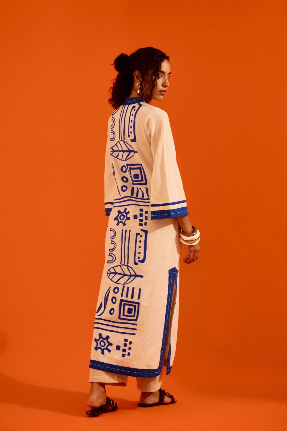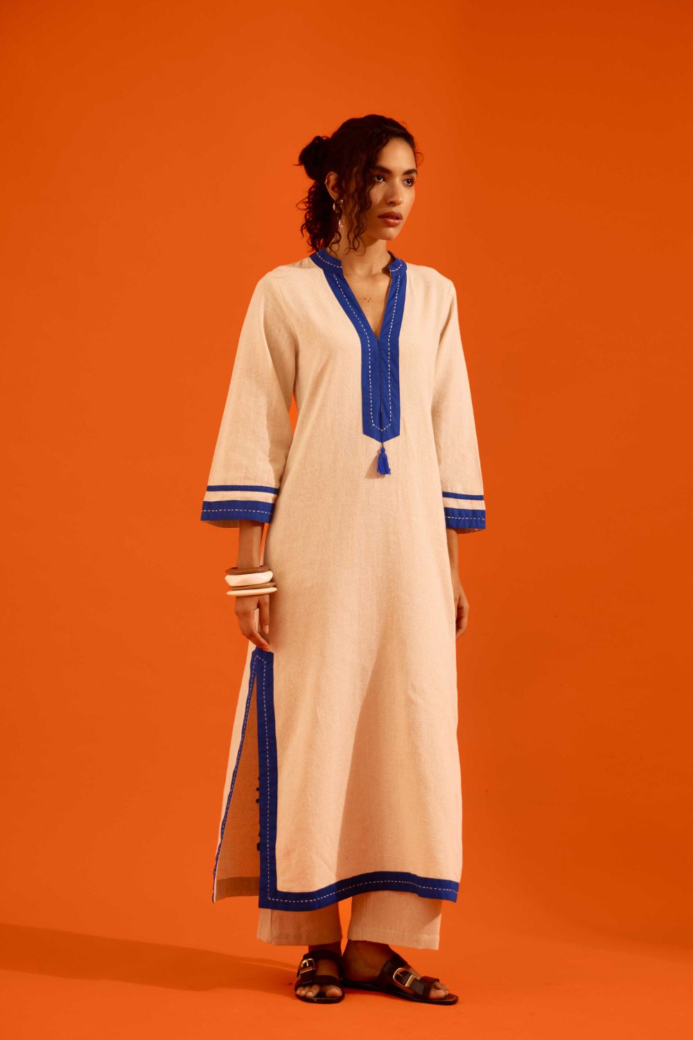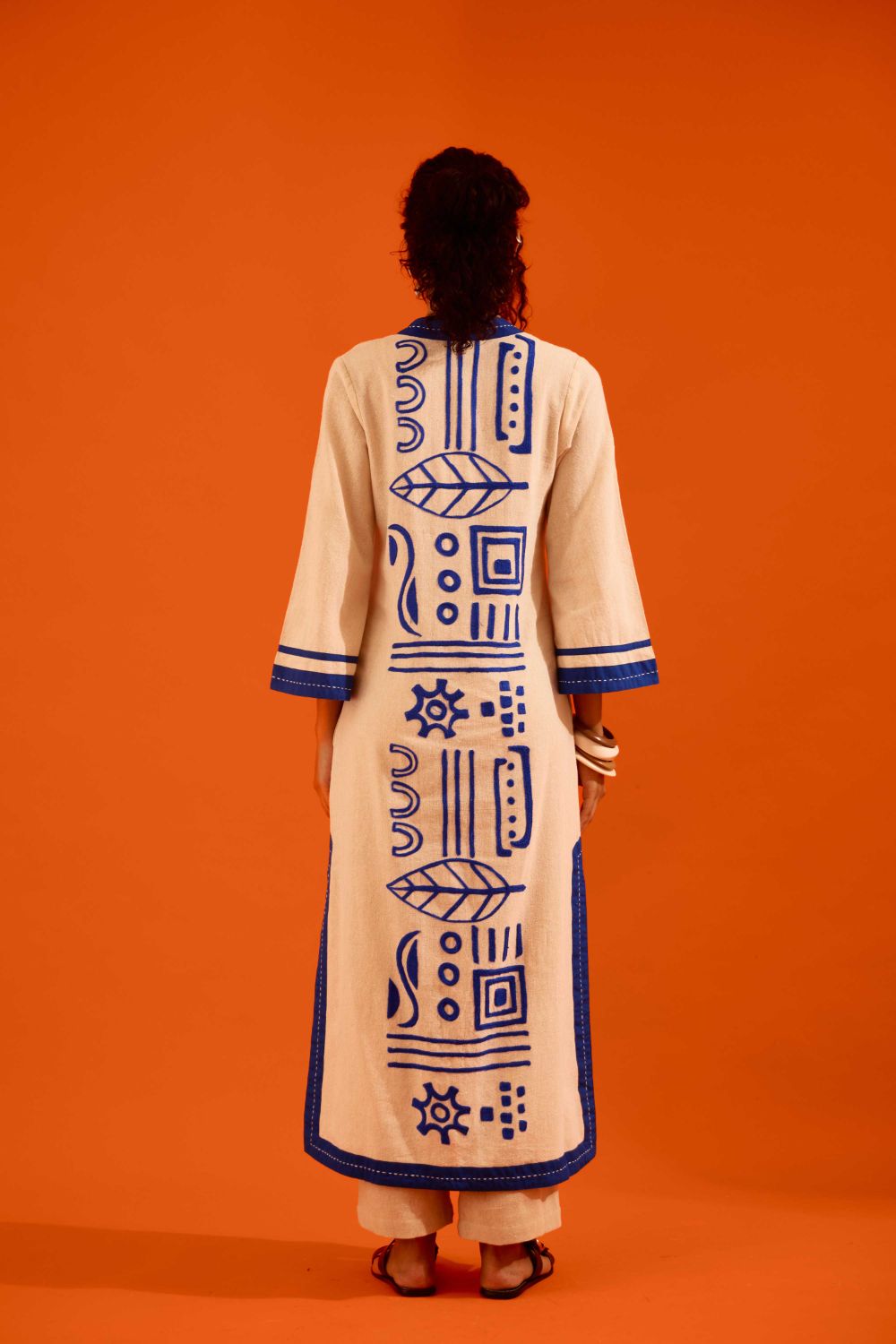 Natural Jute Tunic Set with Indigo Blue Thread Embroidery