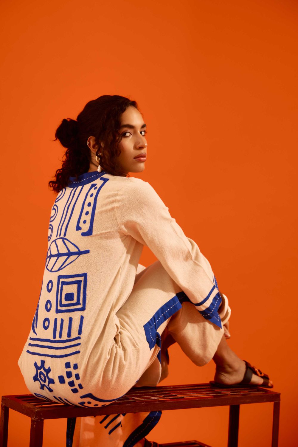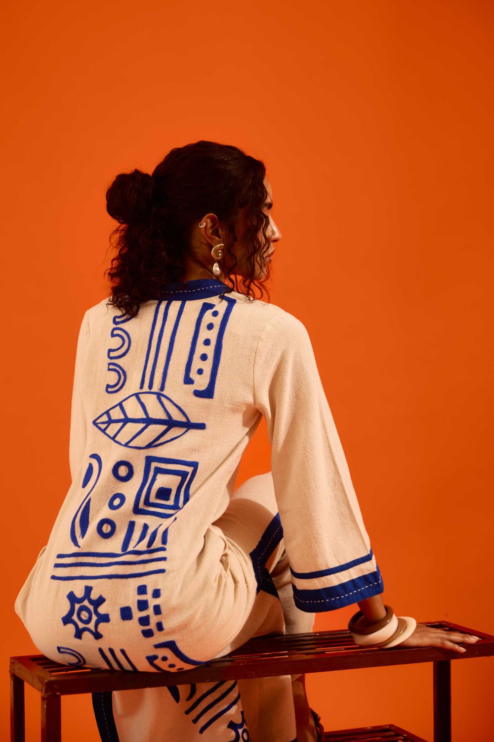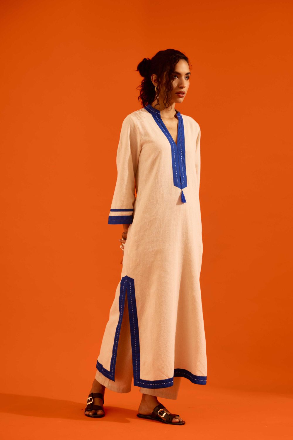 Natural Jute Tunic Set with Indigo Blue Thread Embroidery