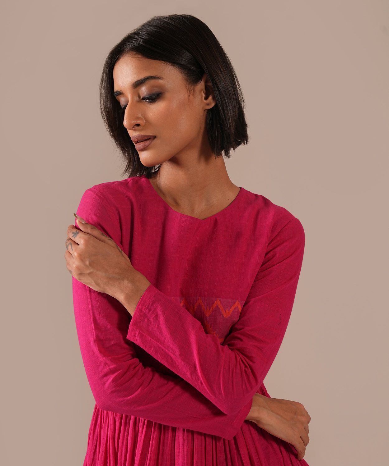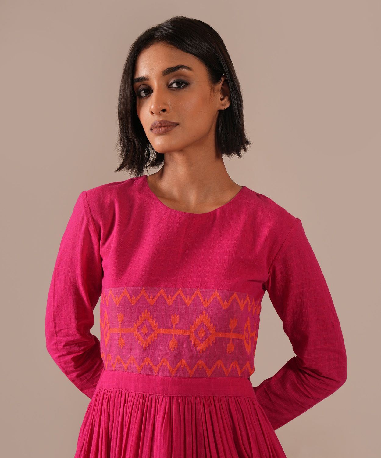 An attire that stands for its glamour and effortlessness features a fitted bodice, round neck, full sleeves, back zipper fastening, and skin-barring cut out at the waist that comes with a voluminous tiered silhouette. Handwoven by Indian artisans, the dress comes with side pockets.