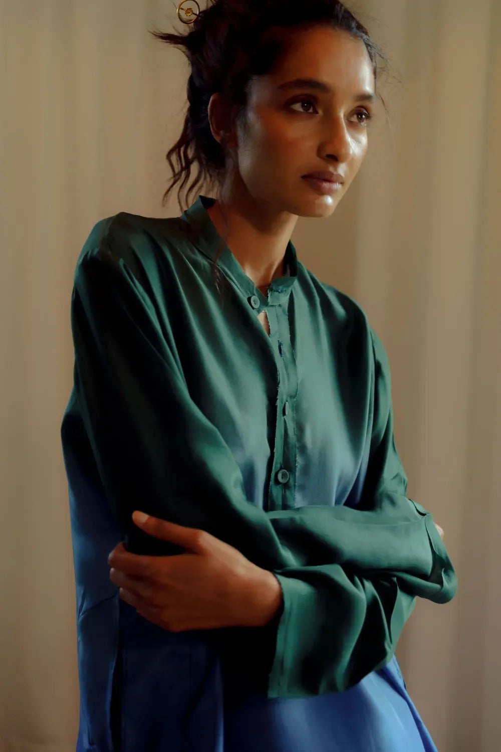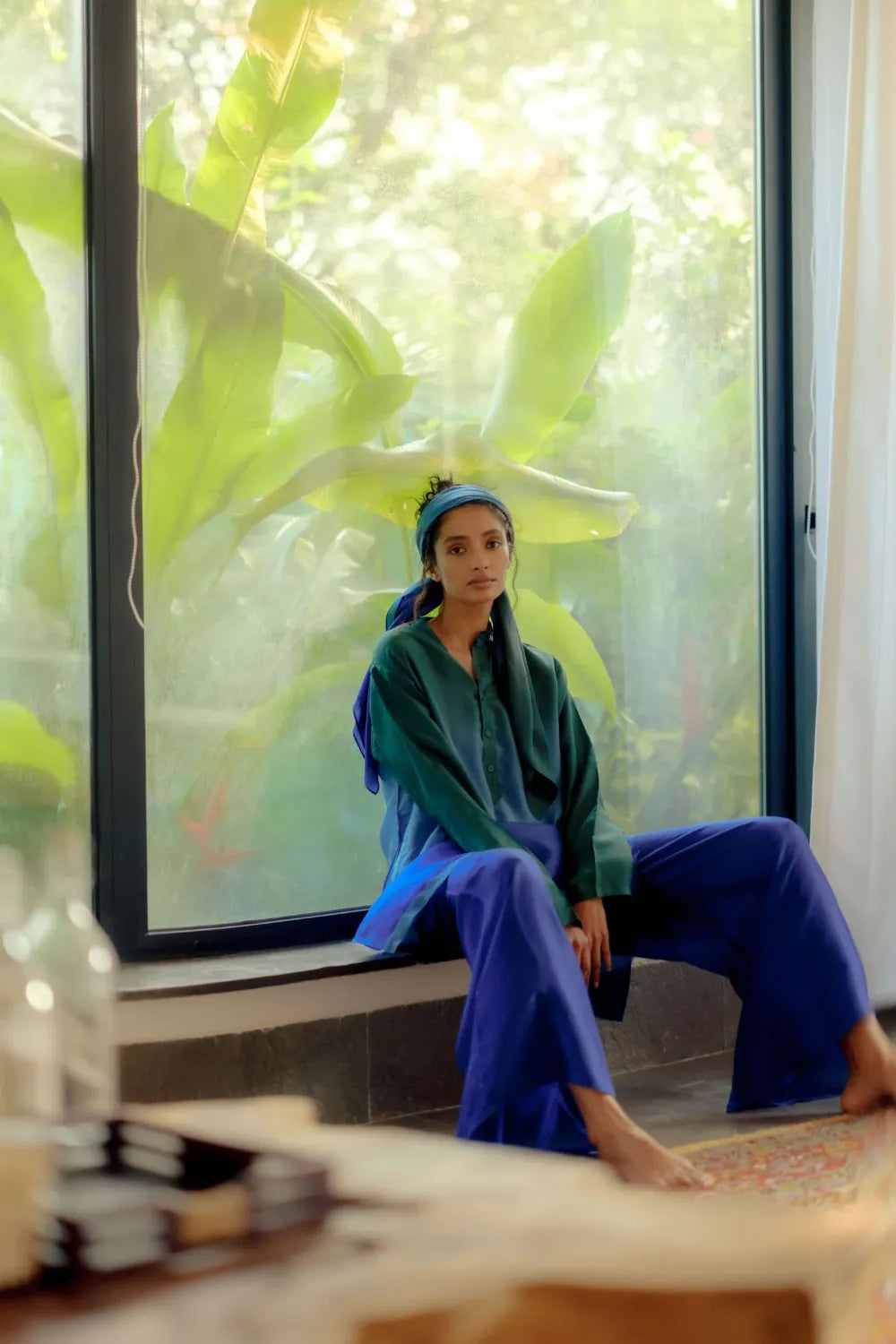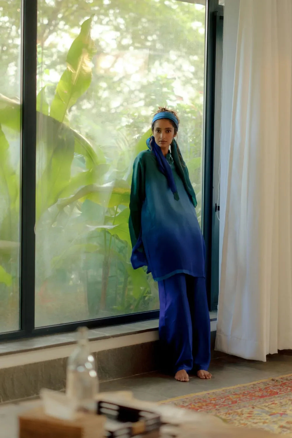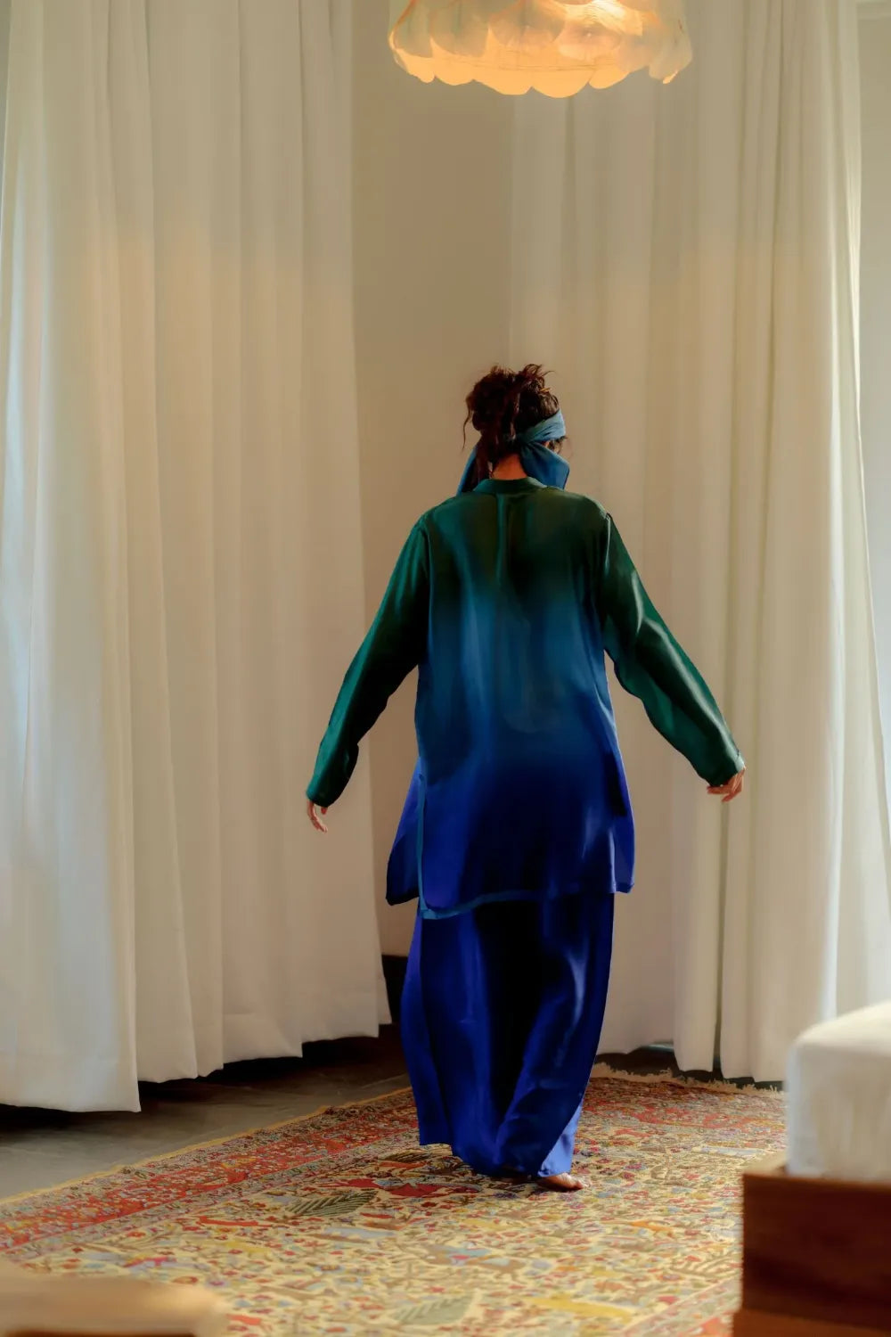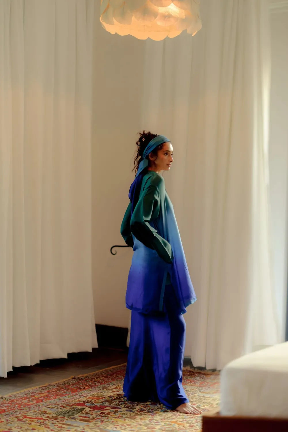 Hand dip-dyed in a serene layered-blue ombré, it offers a modern, resort-ready finish. Paired with flared slit pants lined halfway in silk for soft structure and comfort.