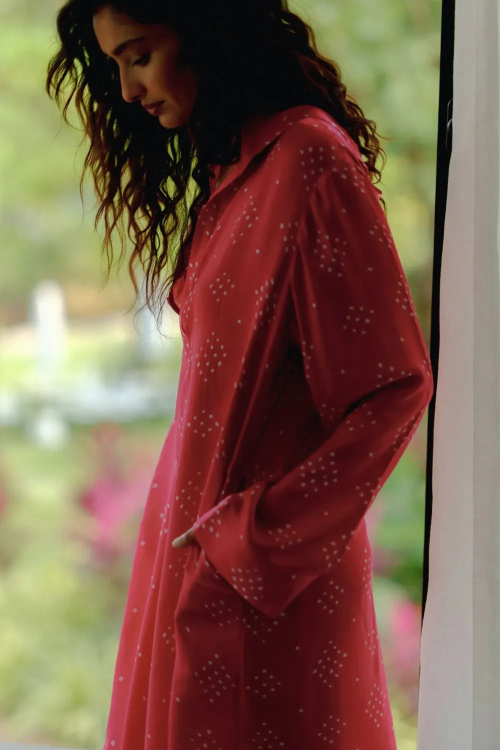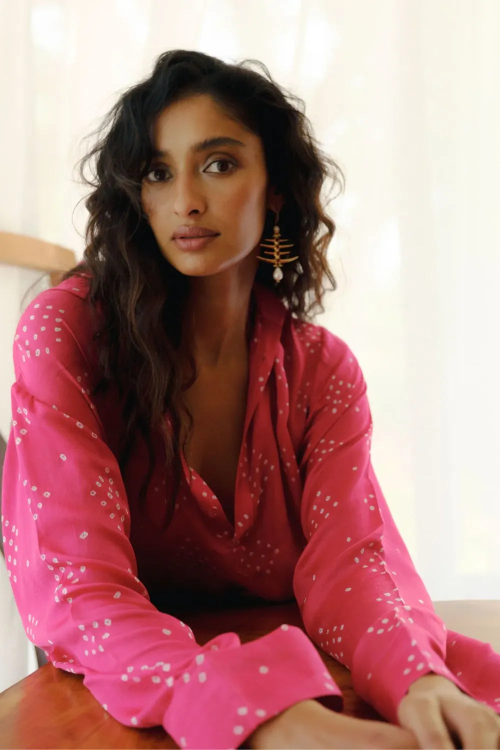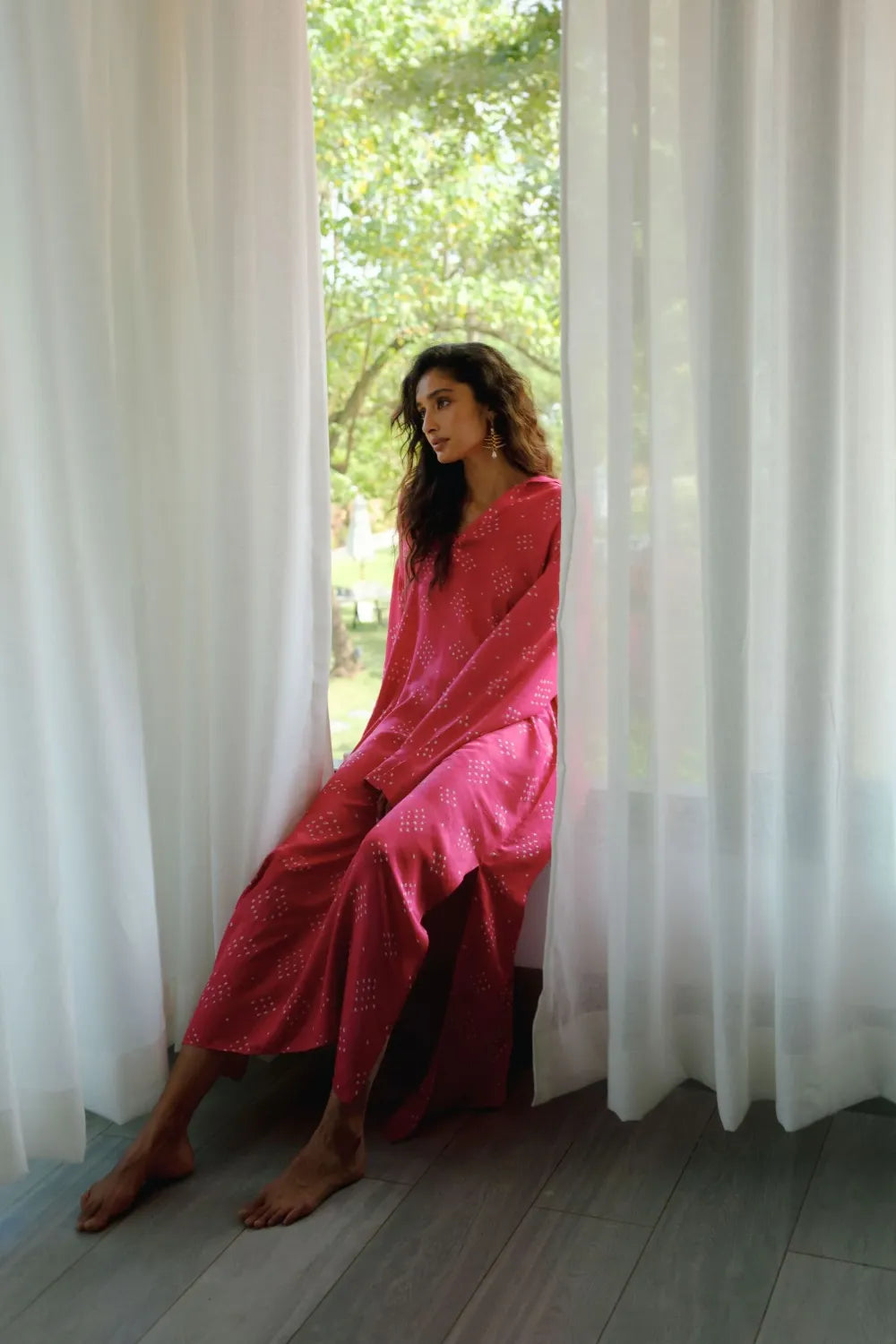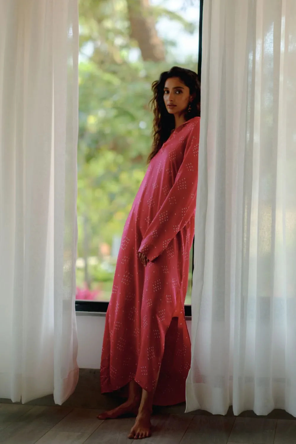 A one-size Bandhani gaji-silk dress designed for ease and quiet elegance.