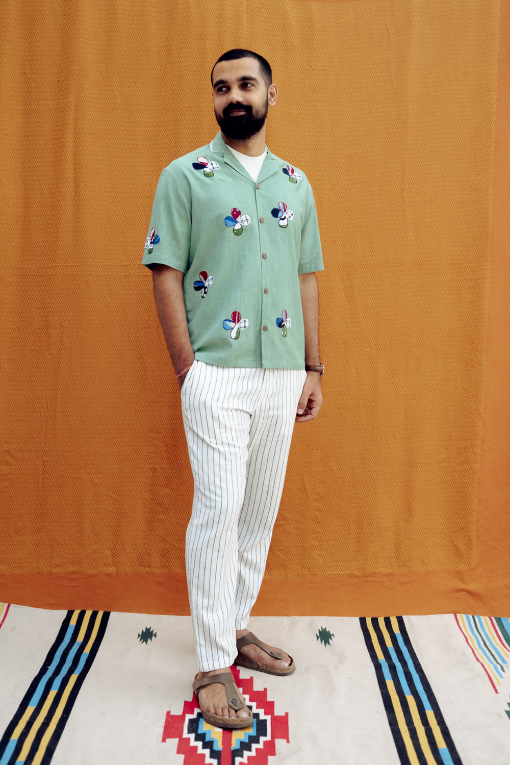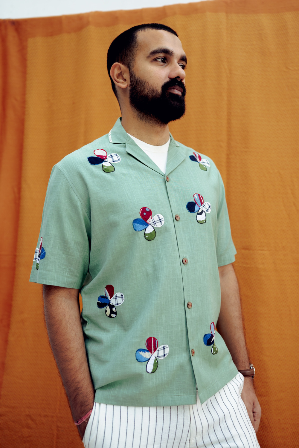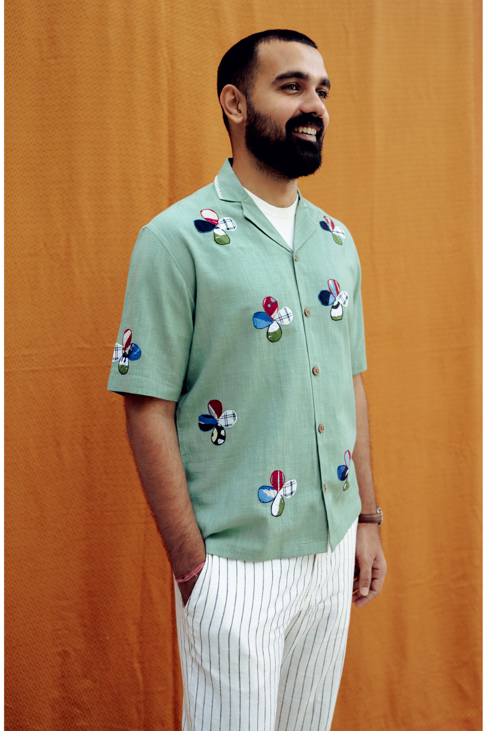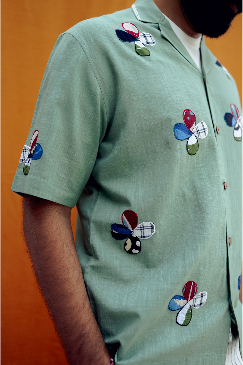 This relaxed-fit, open-collar shirt is cut from soft, dyed cotton mangalgiri and features appliqué embroidery—pieced together from different fabrics to form a bold, blooming motif.