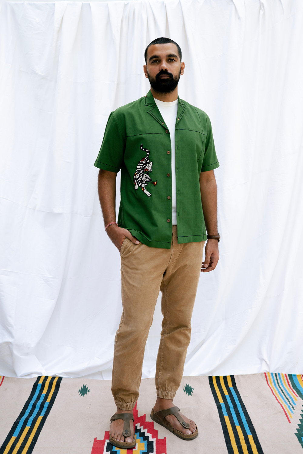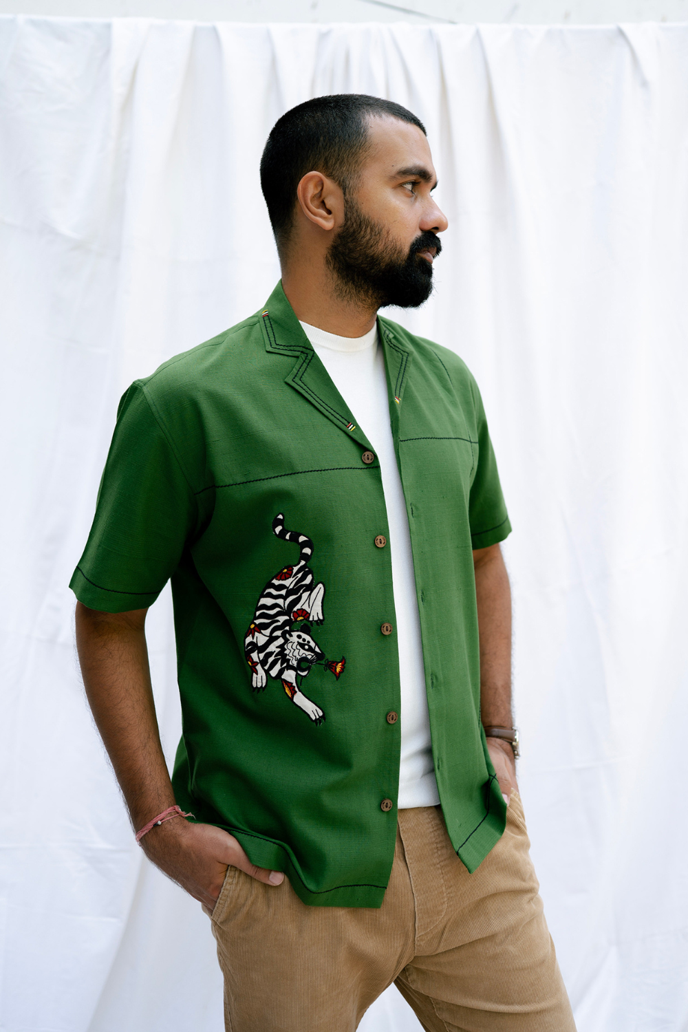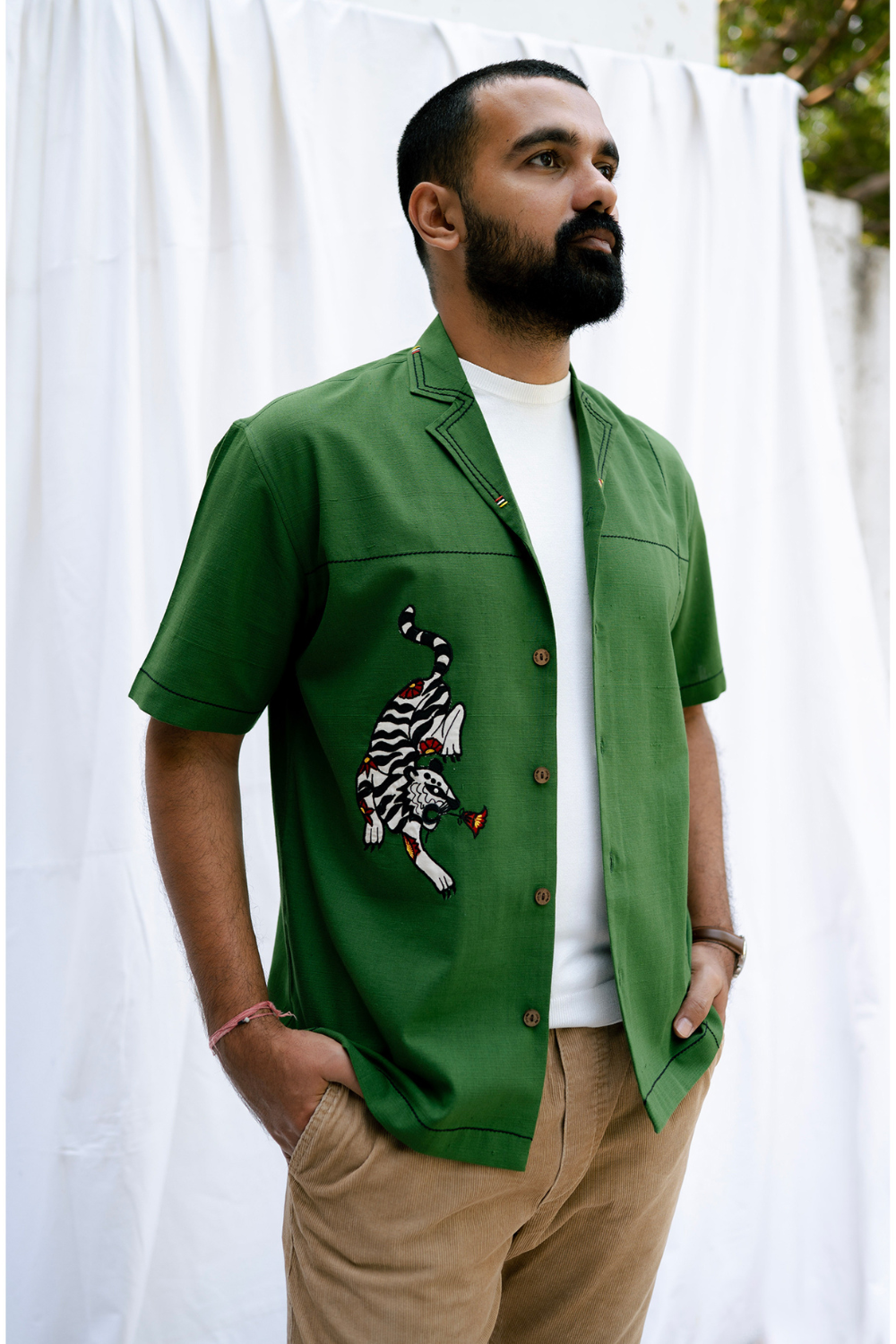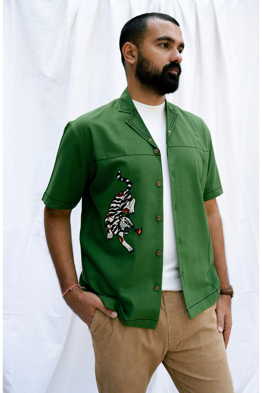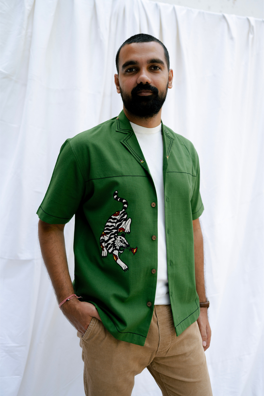 Easy, effortless, and a little wild. This relaxed-fit, open-collar shirt is made from handwoven, hand-dyed Kala cotton and finished with a bold tiger appliqué.