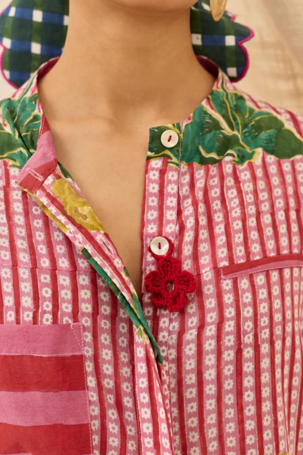 A relaxed, knee-length midi shift dress cut from the same cheerful hand-block print fabric. It has a band collar, three-quarter sleeves, and a comfortable, boxy fit. The sides are decorated with contrasting horizontal stripes at the hem and sleeves, offering a bold and effortless everyday look.