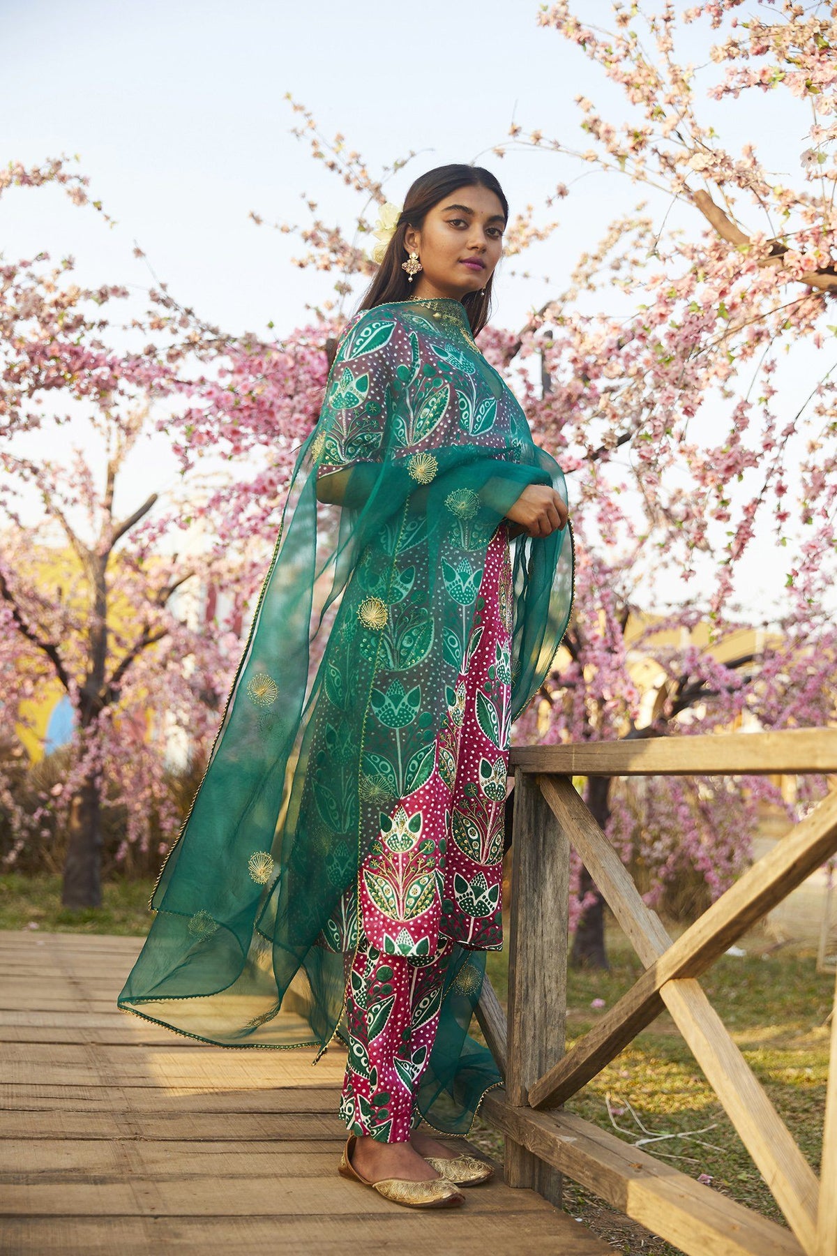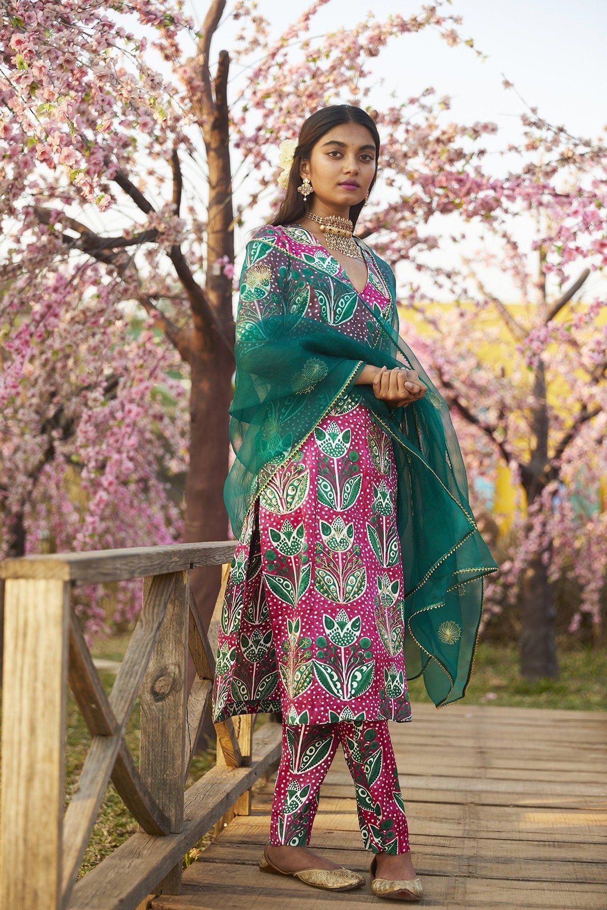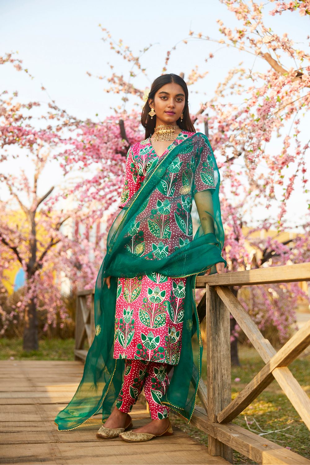 Inspired by tulip fields, this vibrant kurta set is a head-turner. The combination of deep pink with emerald green is accentuated by the gold pita hand embroidery. The kurta has a slim fit, V neck, and elbow length sleeves along with matching tailored trousers.