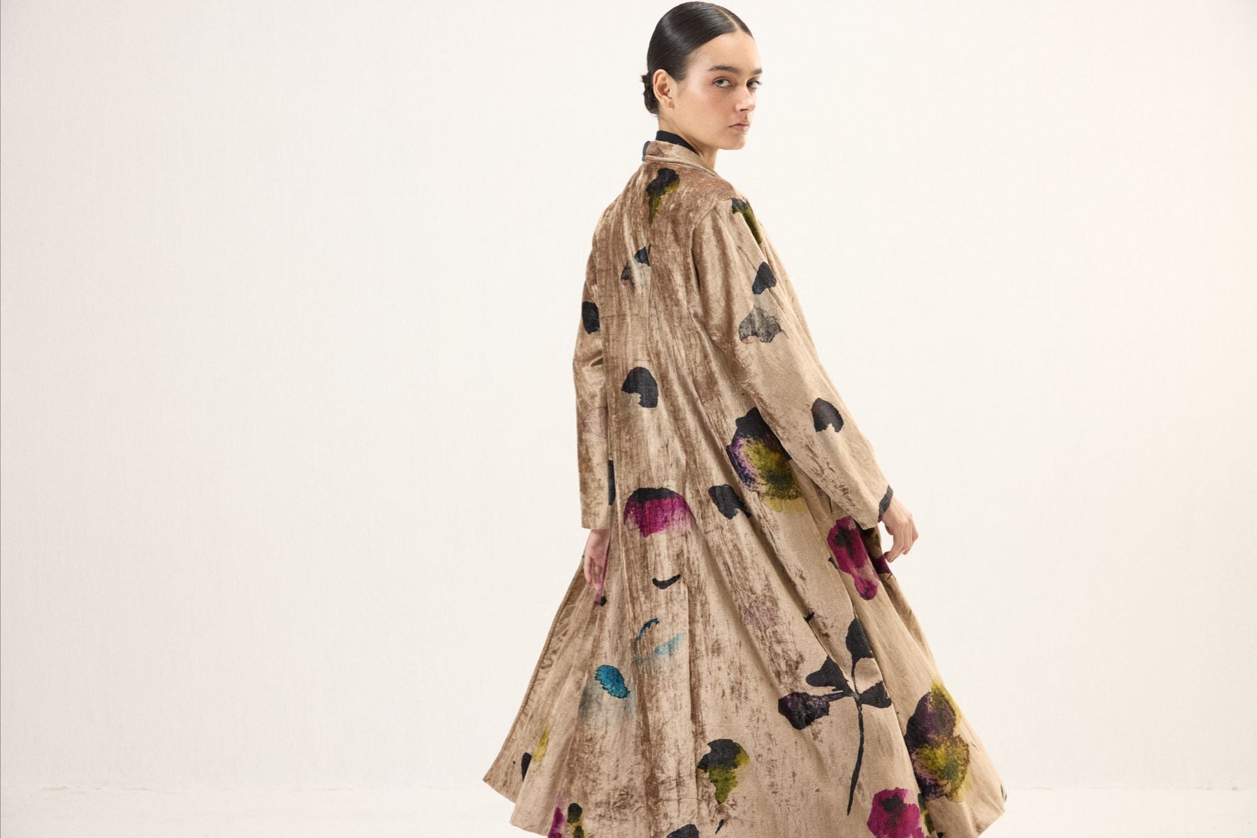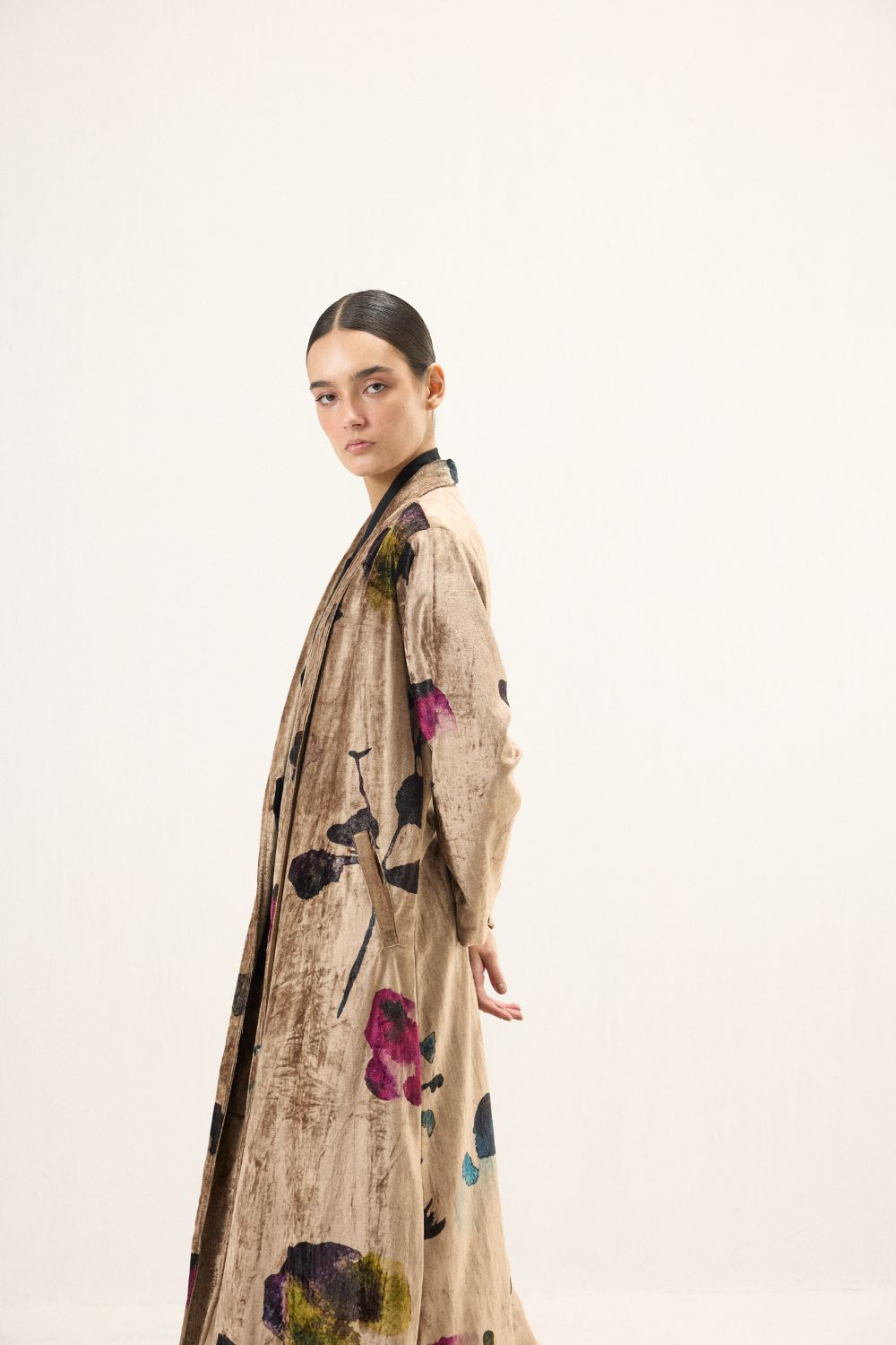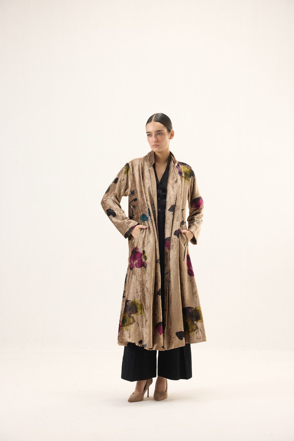 This copper gold trench coat is designed to stand out with effortless grace. Crafted in velvet, it catches the light beautifully while offering a refined, fluid drape. Bold, vibrant floral prints unfold across the surface, creating a dramatic yet balanced contrast against the rich golden base. Finished with full-length sleeves and a versatile silhouette, it is perfect for layering, adding statement elegance to any ensemble. Lining: Brown Base and Beige Polka Dots Lining