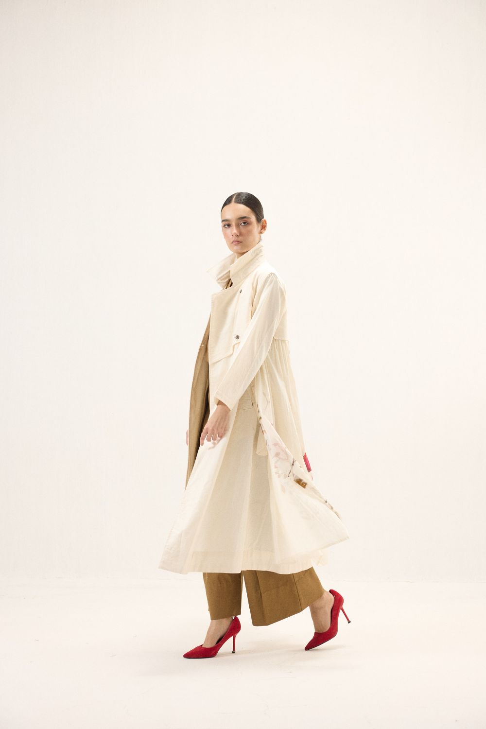 A stunning trench coat adorned with florals and button details, set against a soft white base for a sophisticated and artistic touch. The perfect blend of classic style and modern design. This style is our take on a trench dress crafted in cotton Oxford and fine mul fabric.