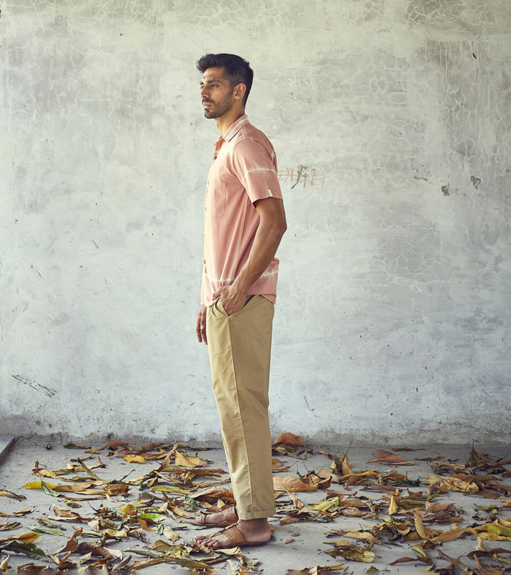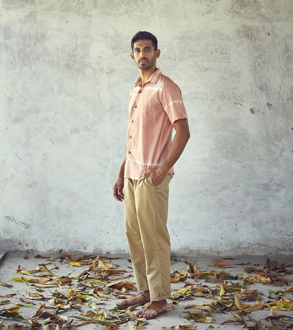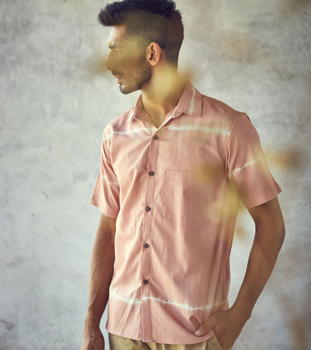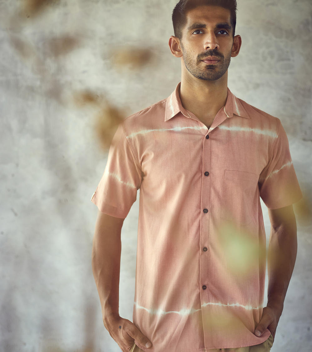 A shibori dyed salmon pink shirt in khadi cotton with spread collar and an up front patch pocket. A perfect match for any occasion.