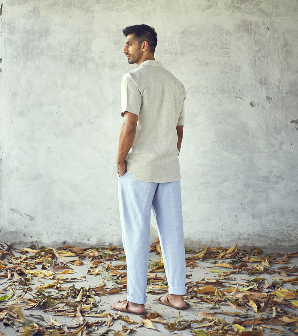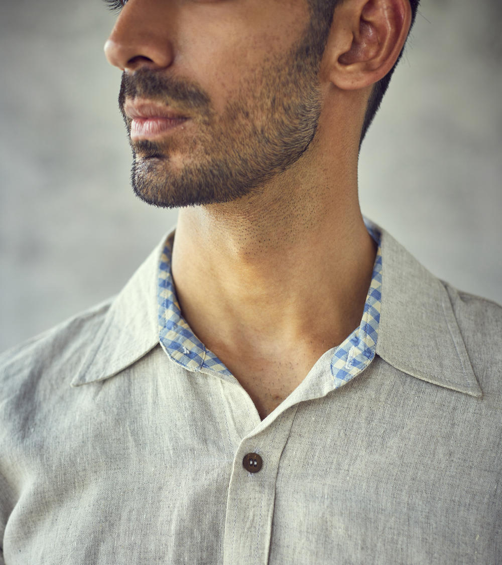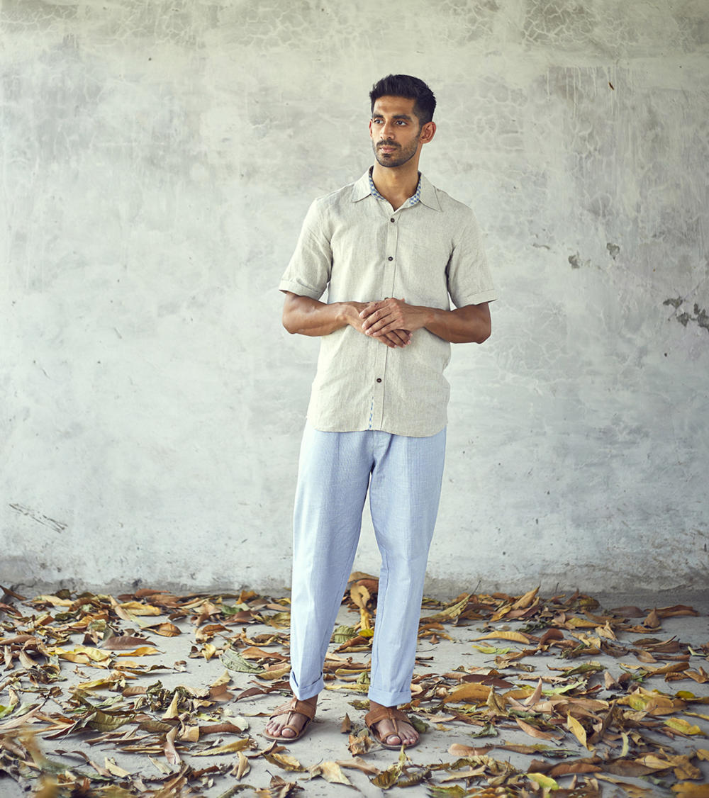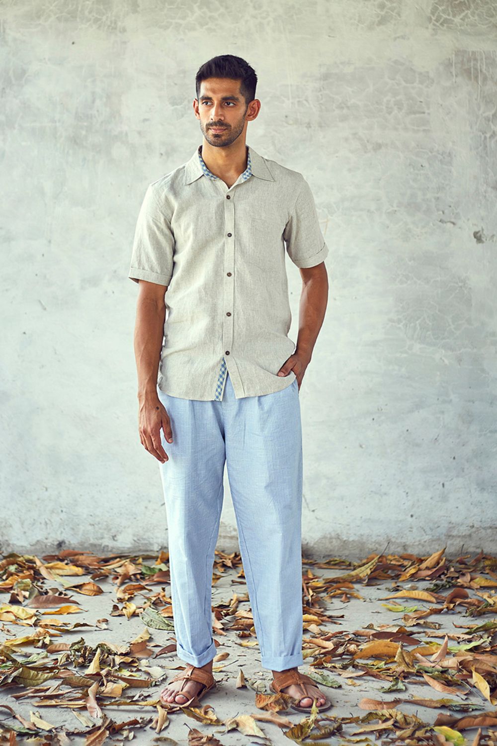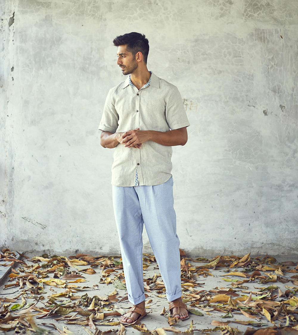 A half-sleeved linen shirt in a regular fit with straight collars. It comes with a peak-a-boo blue and white check detailing.
