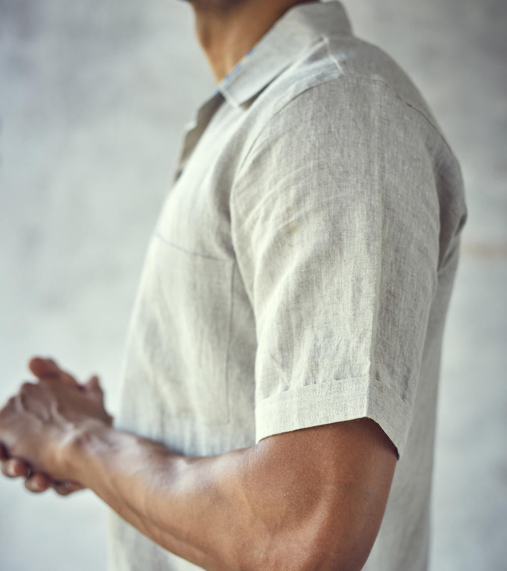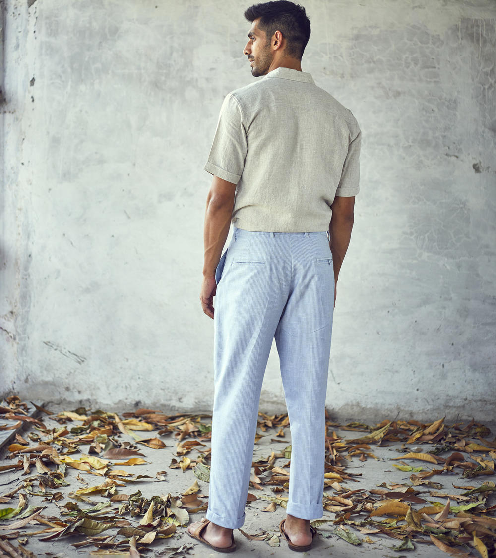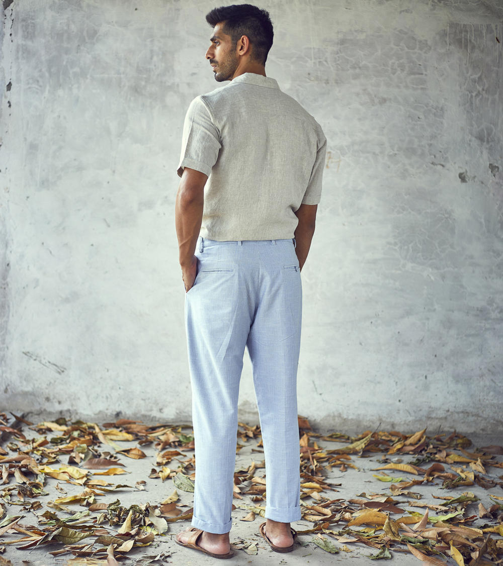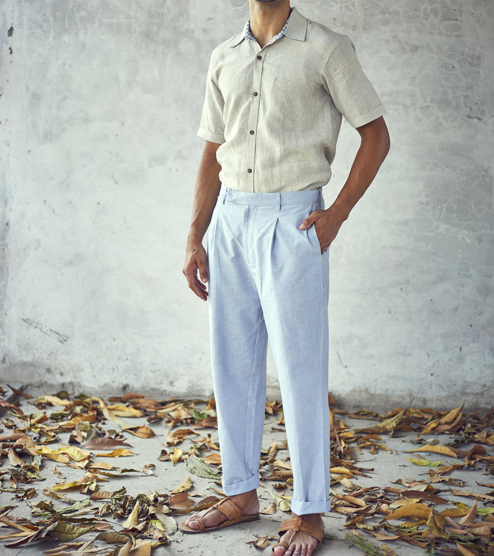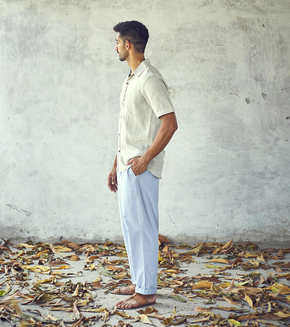A half-sleeved linen shirt in a regular fit with straight collars. It comes with a peak-a-boo blue and white check detailing.