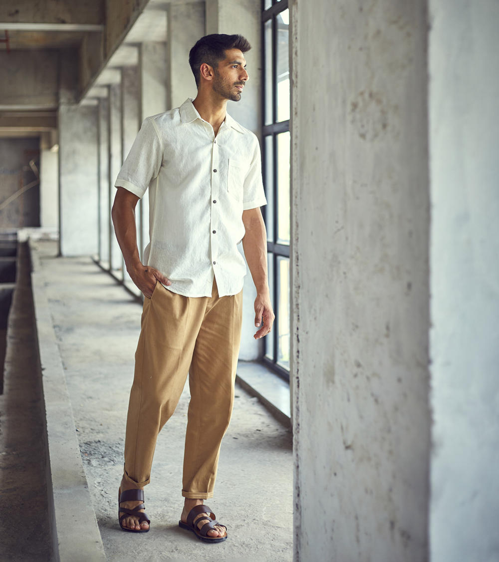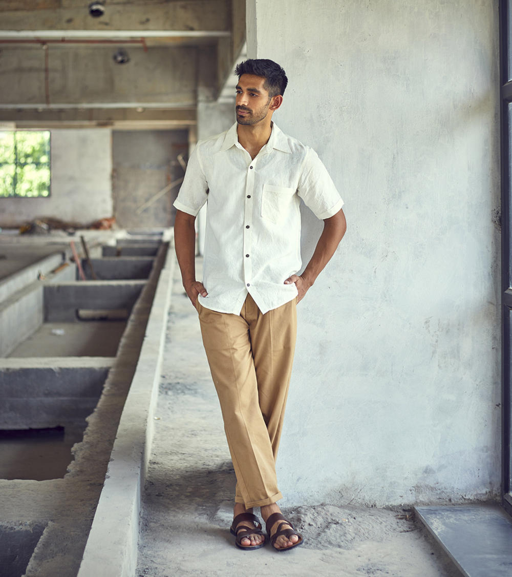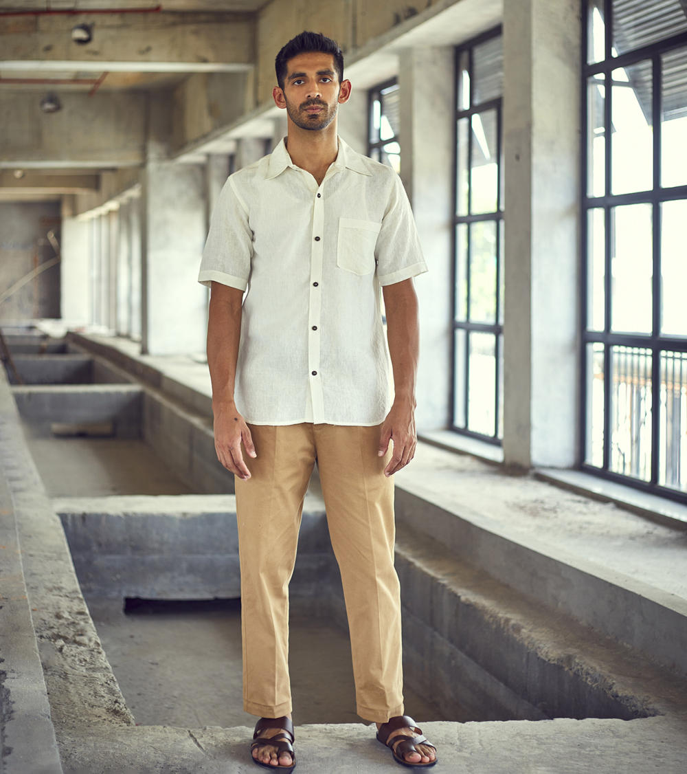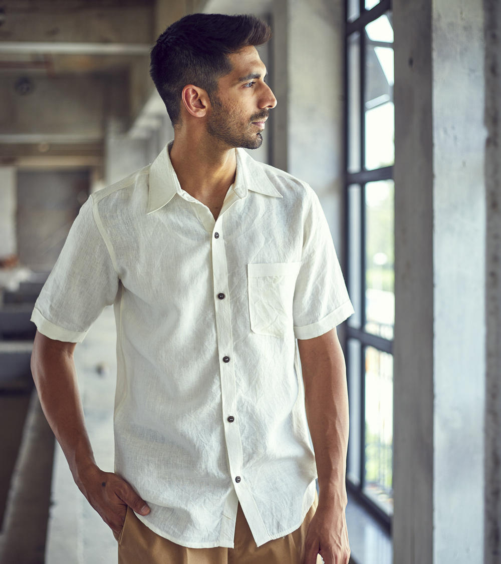 A white belgian linen half-sleeve regular fit shirt with spread collar and an up front patch pocket.