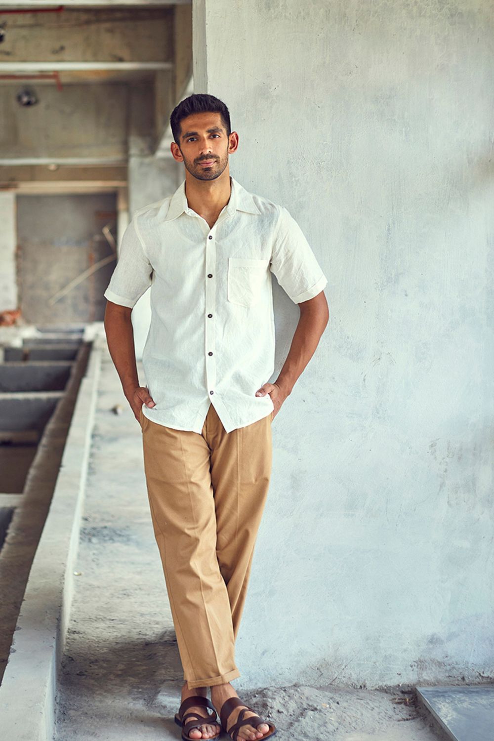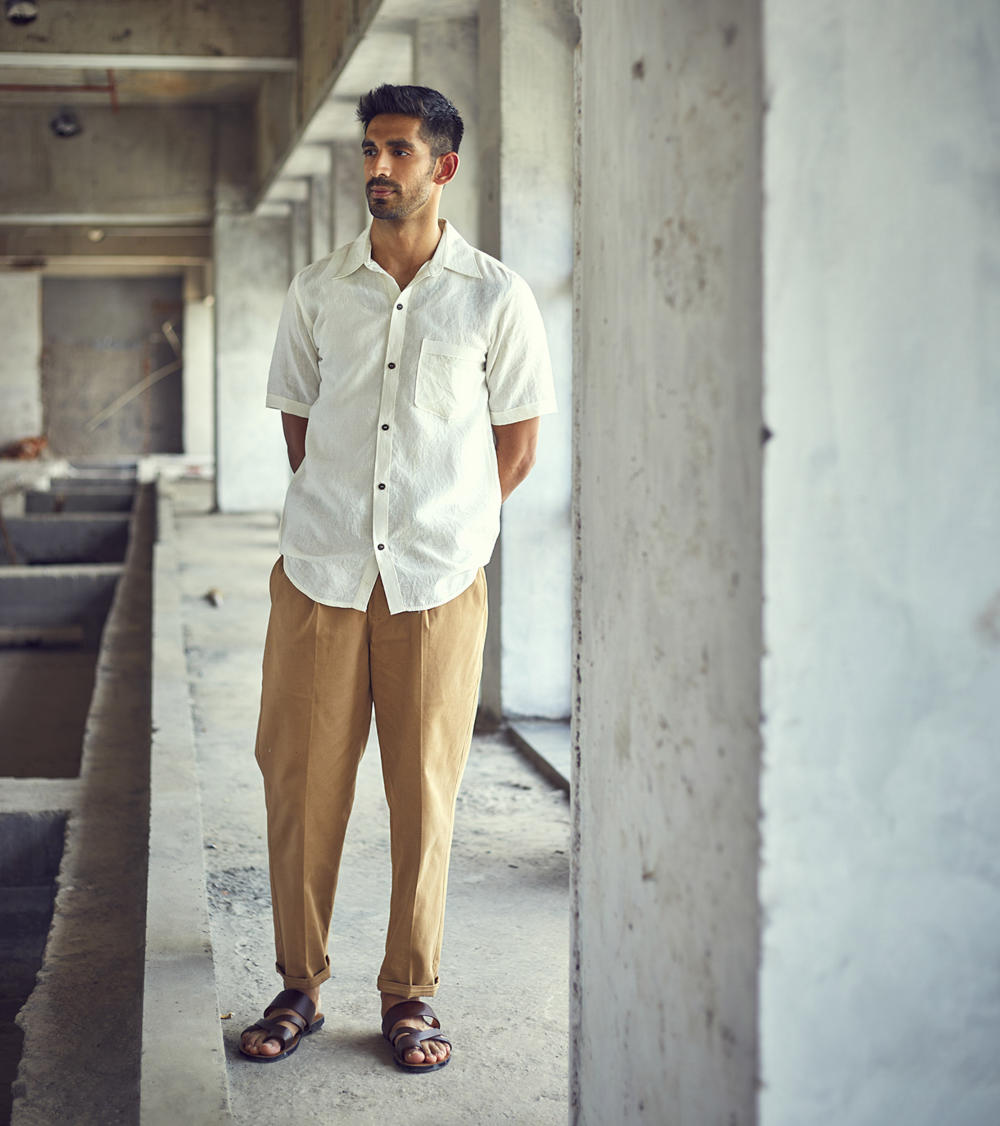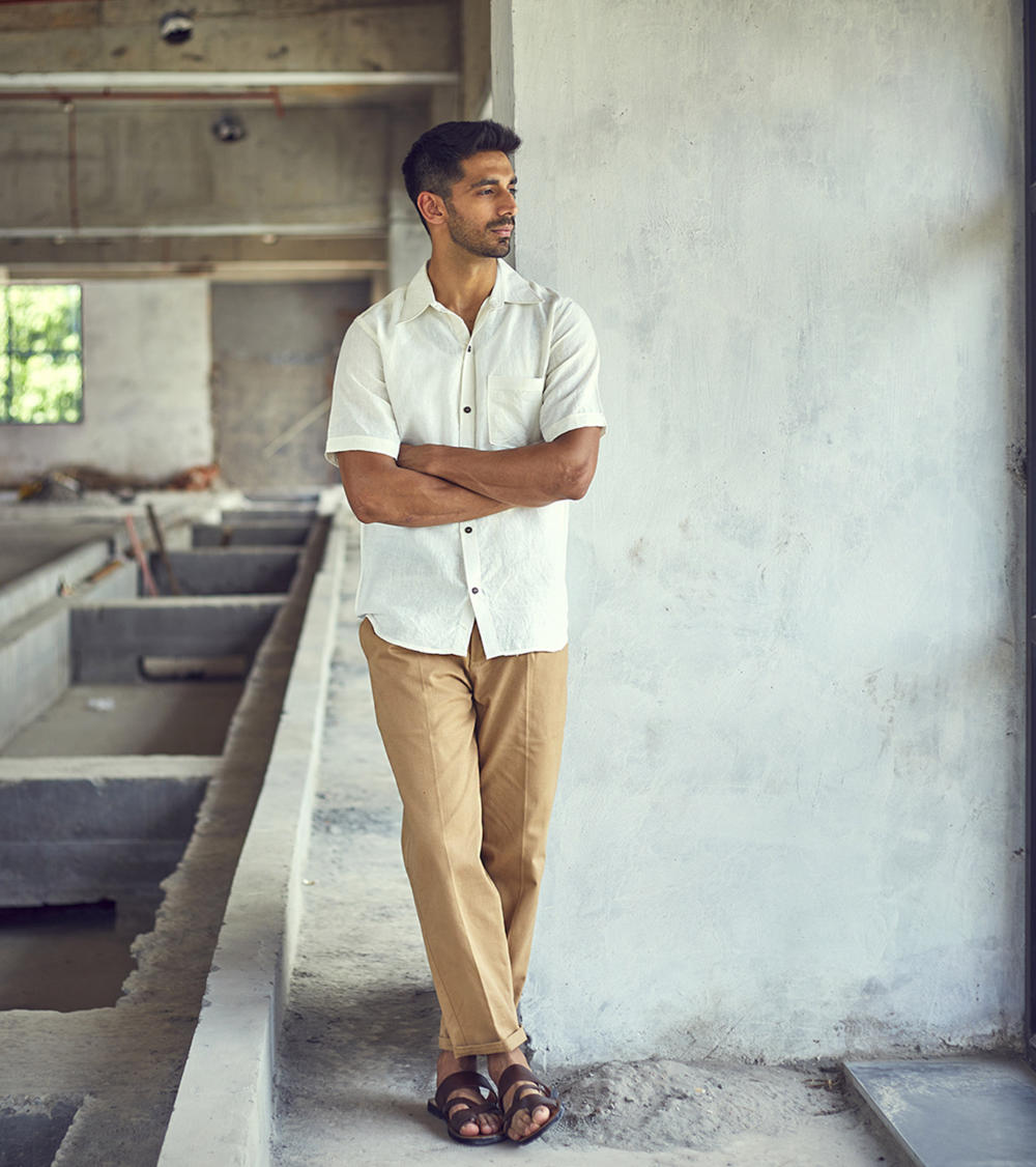 A white belgian linen half-sleeve regular fit shirt with spread collar and an up front patch pocket.