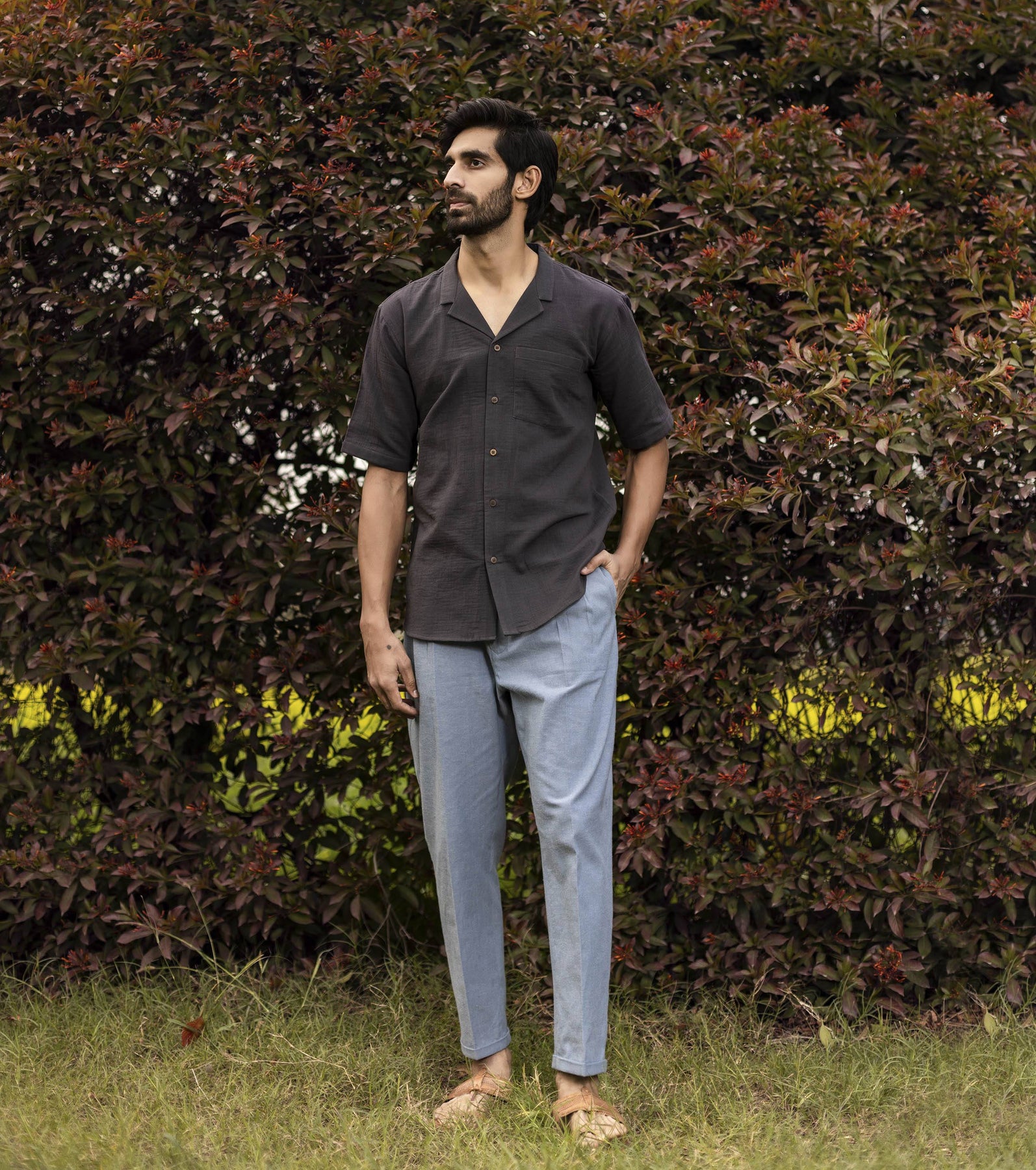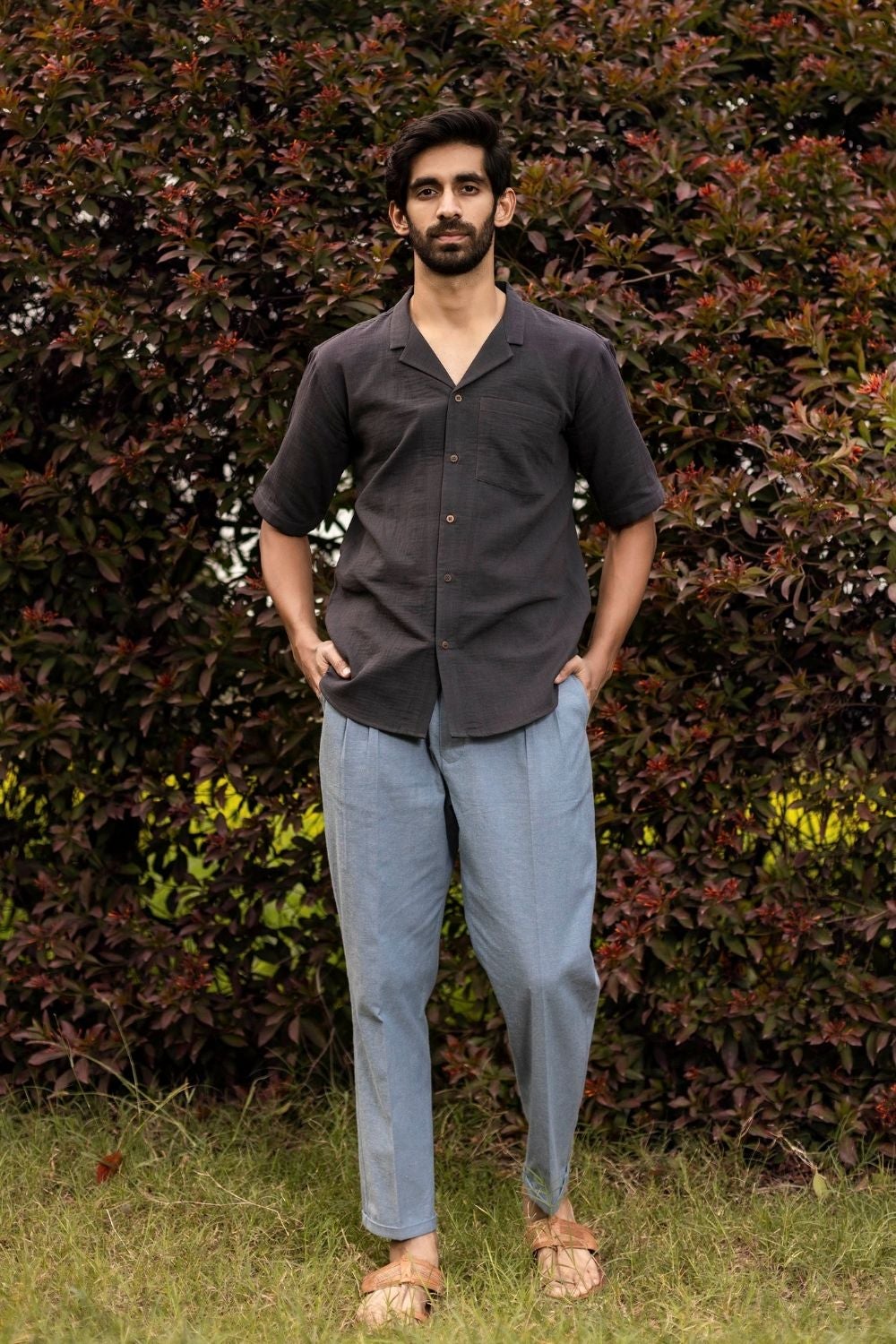 In the shadowy solace of quiet corners, spending time with yourself, let the silence speak through your reflection, offering a glimpse into hidden parts of your soul. Classic charcoal cotton with a notched collar, wooden buttons, ikat detailing and front pocket.