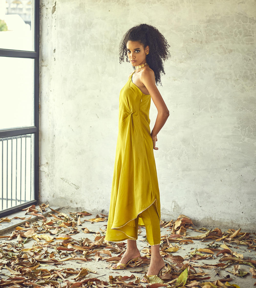 Our surjmukhi co-ord set is handcrafted in cotton silk with delicate gota finishing along the hemline. It comes with cotton pencil pants.