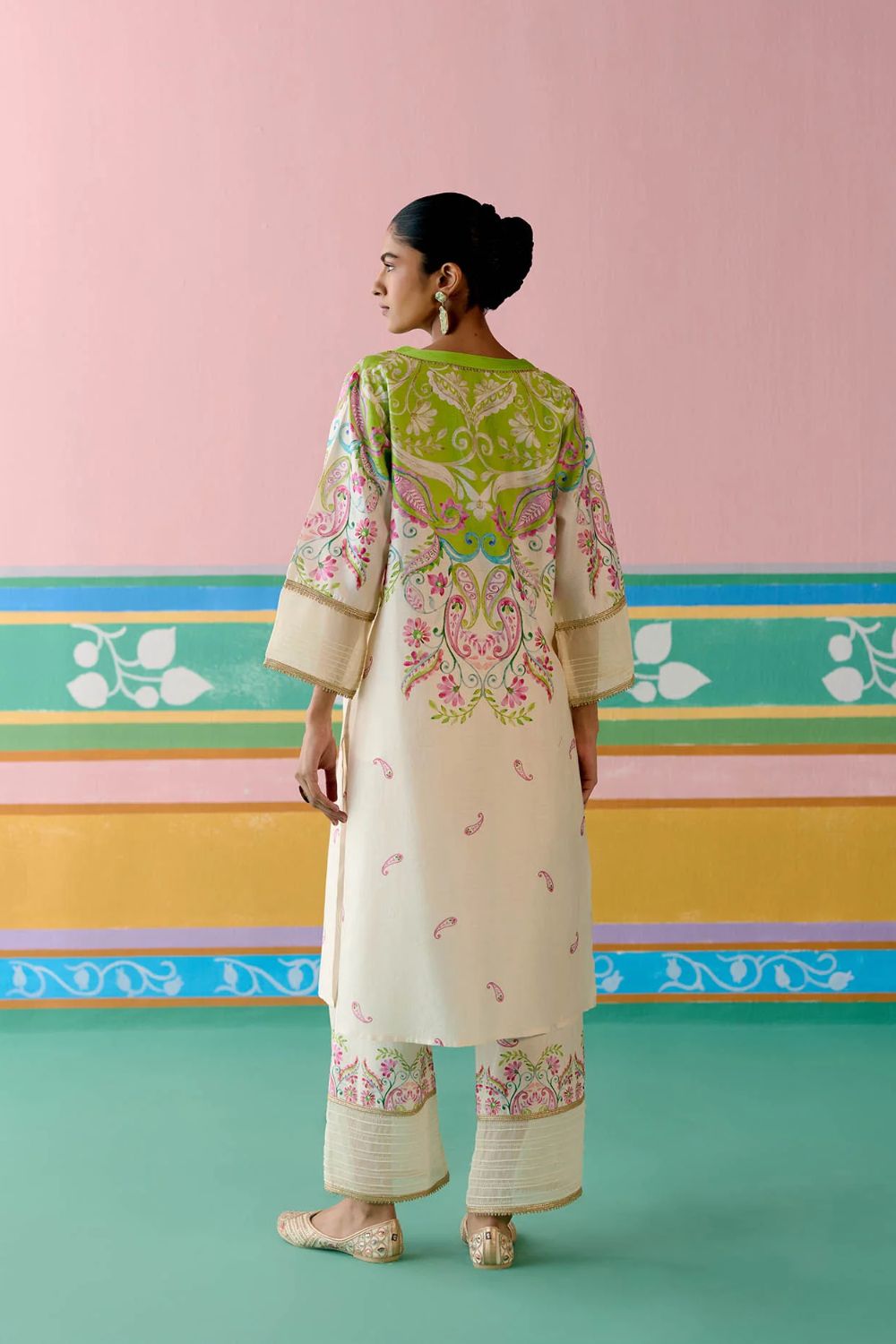Elegant yet contemporary, the Lime Green Paisley V-neck Kurta Set is a true festive standout. Crafted in airy Chanderi with delicate organza detailing on the sleeves and pants, the kurta is elevated with lace inserts along the neckline and sleeves. Fine pintucks on the organza sleeves and pants add subtle texture, while the elasticated back on the pants ensures effortless comfort. Paired with a organza dupatta edged in a full lace border, this set strikes the perfect balance of sophistication and ease—ideal for celebrations that call for understated glamour.
