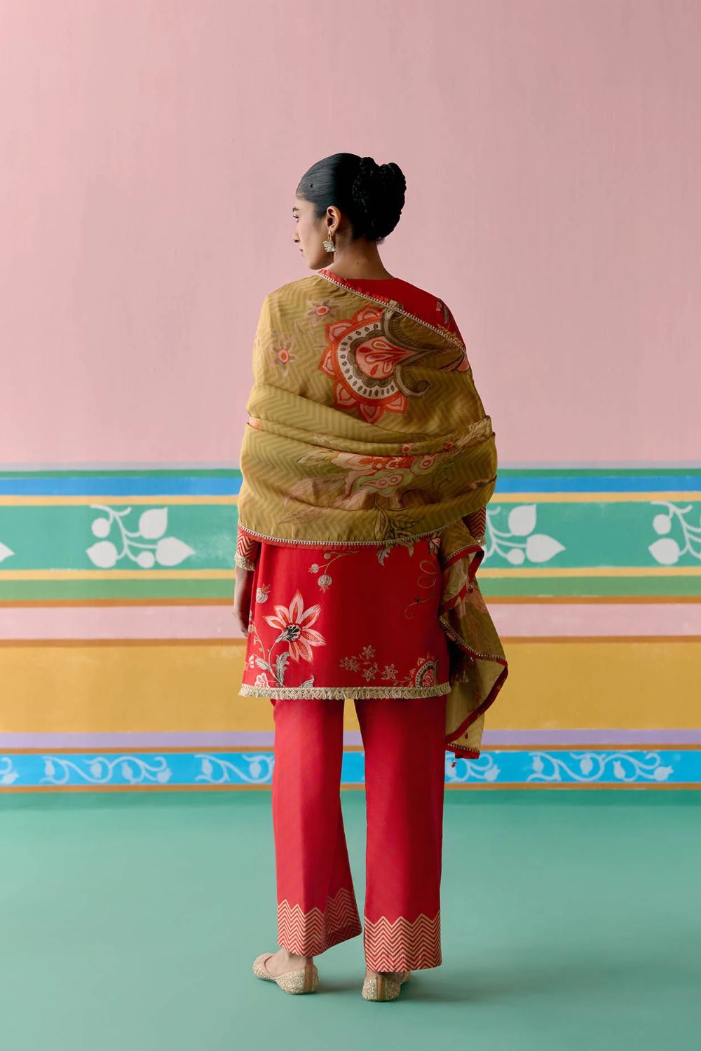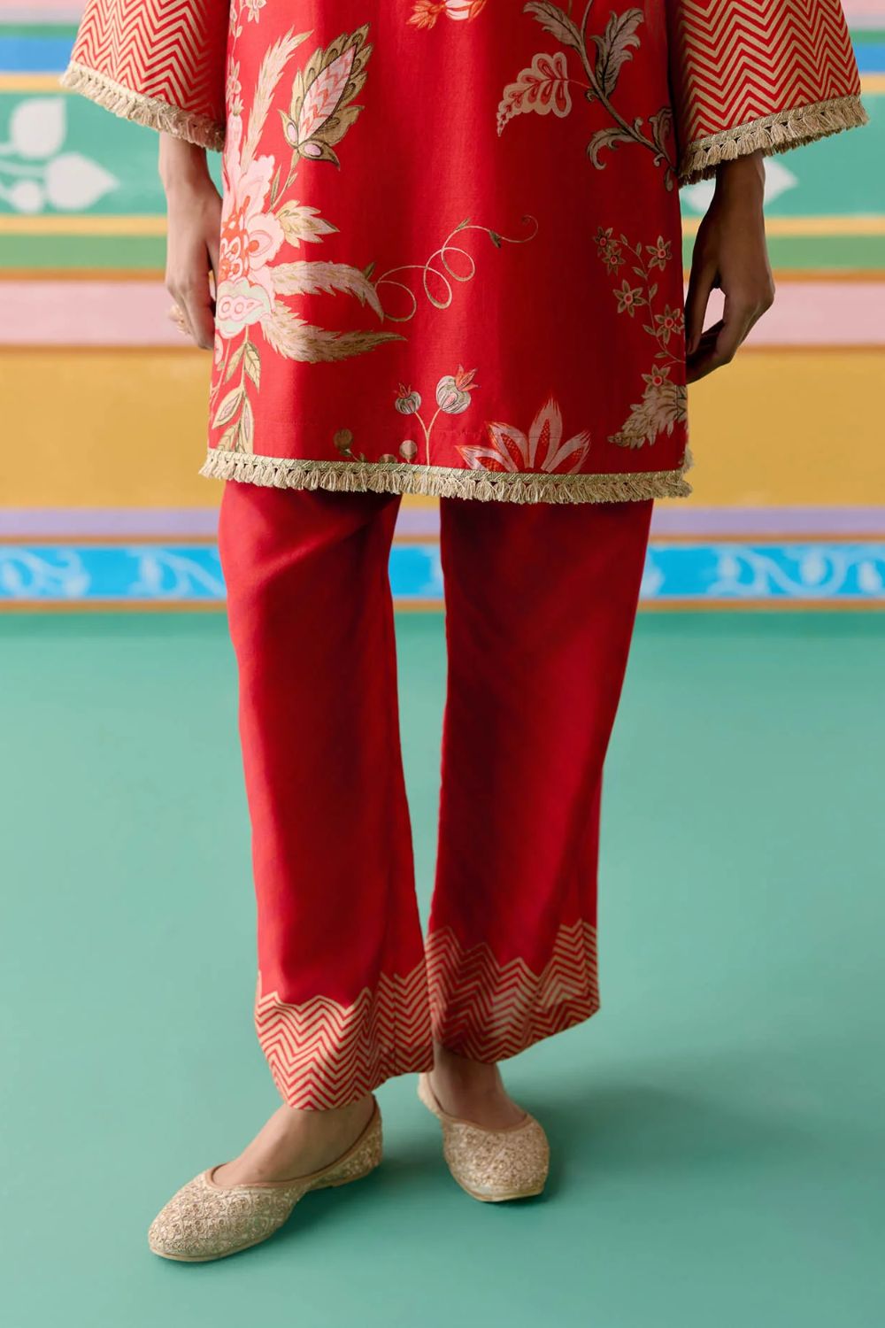 A striking harmony of tradition and elegance, the Red Chintz Kurta Set is a festive wardrobe classic. Crafted in fine Chanderi, the kurta features delicate hand-embroidered beading on the neckline, with lace accents gracing the sleeves and hem for a refined finish. The straight pants with an elasticated back ensure effortless comfort, while the tissue dupatta edged with lace and finished with tassels adds a touch of ethereal charm—perfect for celebrations that call for grace and grandeur.