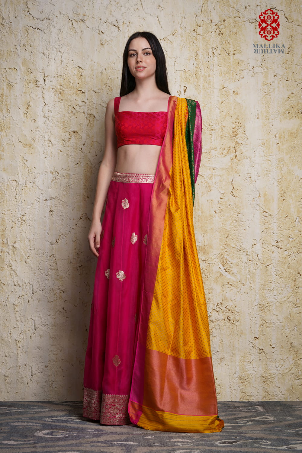 Dupatta silk rangkat amras yellow and rani pink handwoven in 'Ashrafi' butis in antique gold zari.
